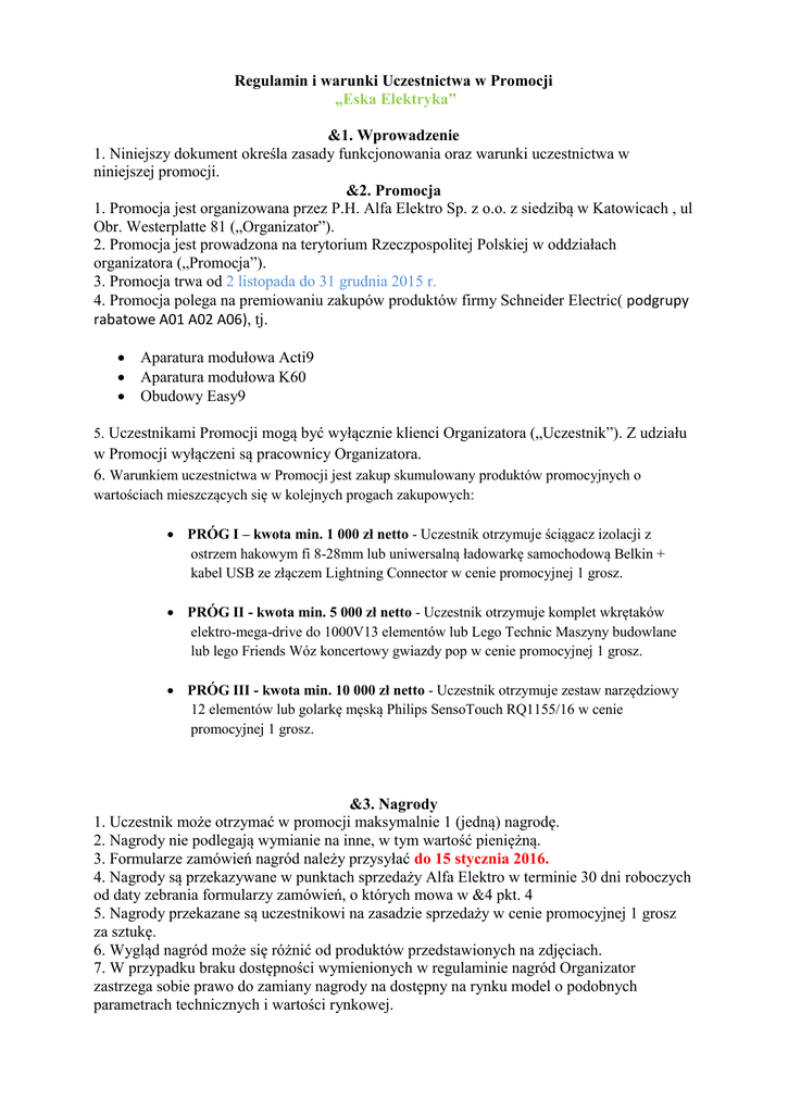 Regulamin i warunki Uczestnictwa w Promocji „Eska Elektryka” &1. Wprowadzenie 1. Niniejszy dokument określa zasady funkcjonowania oraz warunki uczestnictwa w niniejszej promocji. &2. Promocja 1. Promocja jest organizowana przez P.H. Alfa Elektro Sp. z o.o. z siedzibą w Katowicach , ul Obr. Westerplatte 81 („Organizator”). 2. Promocja jest prowadzona na terytorium Rzeczpospolitej Polskiej w oddziałach organizatora („Promocja”). 3. Promocja trwa od 2 listopada do 31 grudnia 2015 r. 4. Promocja polega na premiowaniu zakupów produktów firmy Schneider Electric( podgrupy rabatowe A01 A02 A06), tj. Aparatura modułowa Acti9 Aparatura modułowa K60 Obudowy Easy9 5. Uczestnikami Promocji mogą być wyłącznie klienci Organizatora („Uczestnik”). Z udziału w Promocji wyłączeni są pracownicy Organizatora. 6. Warunkiem uczestnictwa w Promocji jest zakup skumulowany produktów promocyjnych o wartościach mieszczących się w kolejnych progach zakupowych: PRÓG I – kwota min. 1 000 zł netto - Uczestnik otrzymuje ściągacz izolacji z ostrzem hakowym fi 8-28mm lub uniwersalną ładowarkę samochodową Belkin + kabel USB ze złączem Lightning Connector w cenie promocyjnej 1 grosz. PRÓG II - kwota min. 5 000 zł netto - Uczestnik otrzymuje komplet wkrętaków elektro-mega-drive do 1000V13 elementów lub Lego Technic Maszyny budowlane lub lego Friends Wóz koncertowy gwiazdy pop w cenie promocyjnej 1 grosz. PRÓG III - kwota min. 10 000 zł netto - Uczestnik otrzymuje zestaw narzędziowy 12 elementów lub golarkę męską Philips SensoTouch RQ1155/16 w cenie promocyjnej 1 grosz. &3. Nagrody 1. Uczestnik może otrzymać w promocji maksymalnie 1 (jedną) nagrodę. 2. Nagrody nie podlegają wymianie na inne, w tym wartość pieniężną. 3. Formularze zamówień nagród należy przysyłać do 15 stycznia 2016. 4. Nagrody są przekazywane w punktach sprzedaży Alfa Elektro w terminie 30 dni roboczych od daty zebrania formularzy zamówień, o których mowa w &4 pkt. 4 5. Nagrody przekazane są uczestnikowi na zasadzie sprzedaży w cenie promocyjnej 1 grosz za sztukę. 6. Wygląd nagród może się różnić od produktów przedstawionych na zdjęciach. 7. W przypadku braku dostępności wymienionych w regulaminie nagród Organizator zastrzega sobie prawo do zamiany nagrody na dostępny na rynku model o podobnych parametrach technicznych i wartości rynkowej. 8. Zaległości płatnicze Uczestnika wobec Organizatora oraz zwroty towarów promocyjnych mogą być podstawą do anulowania prawa do nagrody. O anulowaniu prawa do nagrody Organizator poinformuje Uczestnika. &5. Reklamacje 1. Wszelkie reklamacje dotyczące sposobu przeprowadzenia Promocji, mogą być zgłaszane po zakończeniu Promocji, nie później jednak niż w terminie do dnia 29 lutego 2016 r. (decyduje data stempla pocztowego). 2. Reklamacje należy zgłaszać na piśmie i przesyłać listem poleconym na adres organizatora z dopiskiem „Eska Elektryka” 3. Forma pisemna reklamacji zastrzeżona jest pod rygorem nieważności. 4. Reklamacje rozpatrywane będą w terminie 14 dni od ich otrzymania. 5. Przy rozpoznawaniu reklamacji organizator opiera się na przepisach Kodeksu Cywilnego oraz treści niniejszego regulaminu i opisie sytuacji zawartym w reklamacji. O wyniku rozpatrzenia reklamacji Organizator zawiadamia osobę wnoszącą reklamację, listem poleconym wysłanym w terminie 7 dni roboczych od dnia rozpatrzenia reklamacji. W przypadku uwzględnienia reklamacji reklamujący zostanie powiadomiony o sposobie zadośćuczynienia. &6. Odpowiedzialność Organizatora 1. Odpowiedzialność finansowa Organizatora wobec Uczestnika ograniczona jest do wartości i liczby Nagród określonych w Regulaminie. 2. Organizator nie ponosi odpowiedzialności za wady fizyczne Nagród. 3. Reklamacje złożone po terminie określonym w regulaminie nie będą rozpatrywane. &7. Postanowienia końcowe 1. Wszelkie spory wynikłe z tytułu wykonania zobowiązań związanych z niniejszą Promocją będą rozstrzygane przez sąd miejscowo właściwy dla siedziby Organizatora. Skierowanie przez Uczestnika sprawy na drogę postępowania sądowego jest dopuszczalne po wyczerpaniu procedury reklamacyjnej. 2. W kwestiach nieuregulowanych niniejszymi Warunkami Uczestnictwa stosuje się przepisy Kodeksu Cywilnego. 3. Tekst niniejszego Regulaminu dostępny jest w siedzibie Organizatora. 4. Postanowienia niniejszych Warunków Uczestnictwa stanowią wyłączną podstawę do prowadzenia Promocji, a ich wykładnia i interpretacja zależy wyłącznie od Organizatora. Wszelkie materiały promocyjno-reklamowe mają wyłącznie charakter informacyjny. Ewentualnie prezentowany wizerunek Nagród przedstawiony w materiałach reklamowych może odbiegać od ich rzeczywistego wyglądu. 5. Jakiekolwiek uprawnienia Uczestnika wynikające z niniejszego Regulaminu nie podlegają przeniesieniu na osoby trzecie. ORGANIZATOR