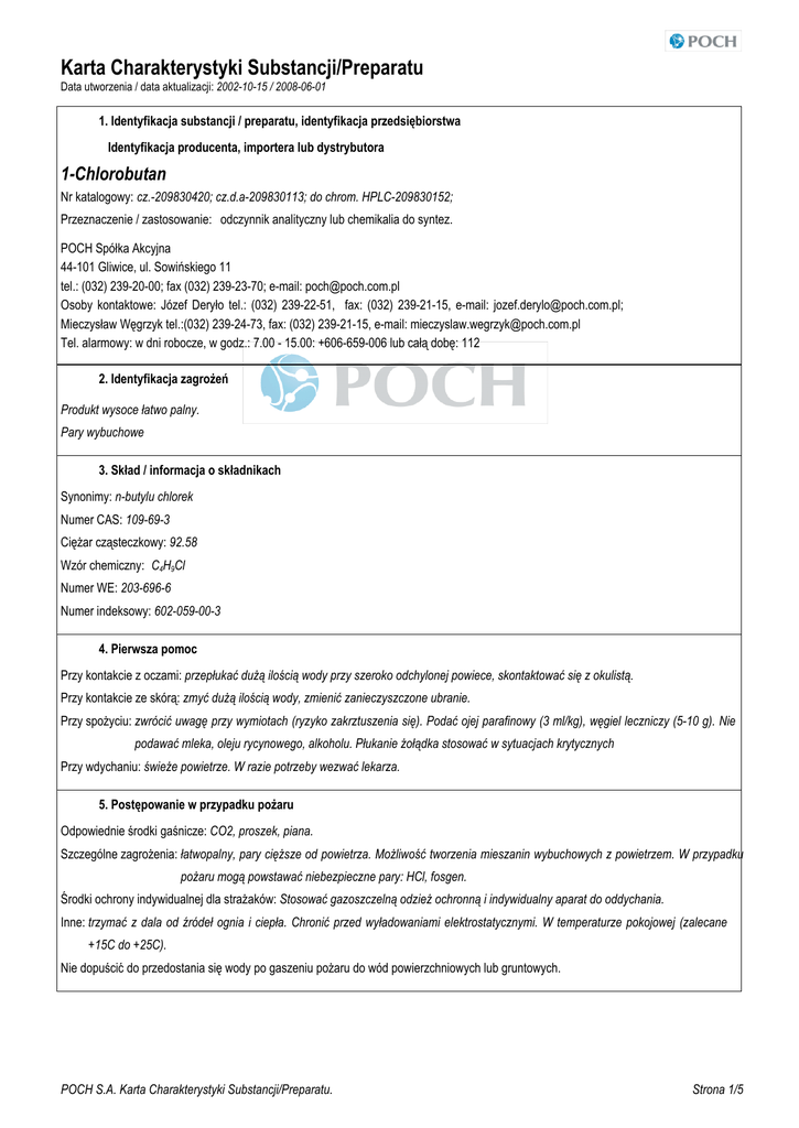 Karta Charakterystyki Substancji/Preparatu Data utworzenia / data aktualizacji: 2002-10-15 / 2008-06-01 1. Identyfikacja substancji / preparatu, identyfikacja przedsiębiorstwa Identyfikacja producenta, importera lub dystrybutora 1-Chlorobutan Nr katalogowy: cz.-209830420; cz.d.a-209830113; do chrom. HPLC-209830152; Przeznaczenie / zastosowanie: odczynnik analityczny lub chemikalia do syntez. POCH Spółka Akcyjna 44-101 Gliwice, ul. Sowińskiego 11 tel.: (032) 239-20-00; fax (032) 239-23-70; e-mail: [email protected] Osoby kontaktowe: Józef Deryło tel.: (032) 239-22-51, fax: (032) 239-21-15, e-mail: [email protected]; Mieczysław Węgrzyk tel.:(032) 239-24-73, fax: (032) 239-21-15, e-mail: [email protected] Tel. alarmowy: w dni robocze, w godz.: 7.00 - 15.00: +606-659-006 lub całą dobę: 112 2. Identyfikacja zagrożeń Produkt wysoce łatwo palny. Pary wybuchowe 3. Skład / informacja o składnikach Synonimy: n-butylu chlorek Numer CAS: 109-69-3 Ciężar cząsteczkowy: 92.58 Wzór chemiczny: C4H9Cl Numer WE: 203-696-6 Numer indeksowy: 602-059-00-3 4. Pierwsza pomoc Przy kontakcie z oczami: przepłukać dużą ilością wody przy szeroko odchylonej powiece, skontaktować się z okulistą. Przy kontakcie ze skórą: zmyć dużą ilością wody, zmienić zanieczyszczone ubranie. Przy spożyciu: zwrócić uwagę przy wymiotach (ryzyko zakrztuszenia się). Podać ojej parafinowy (3 ml/kg), węgiel leczniczy (5-10 g). Nie podawać mleka, oleju rycynowego, alkoholu. Płukanie żołądka stosować w sytuacjach krytycznych Przy wdychaniu: świeże powietrze. W razie potrzeby wezwać lekarza. 5. Postępowanie w przypadku pożaru Odpowiednie środki gaśnicze: CO2, proszek, piana. Szczególne zagrożenia: łatwopalny, pary cięższe od powietrza. Możliwość tworzenia mieszanin wybuchowych z powietrzem. W przypadku pożaru mogą powstawać niebezpieczne pary: HCl, fosgen. Środki ochrony indywidualnej dla strażaków: Stosować gazoszczelną odzież ochronną i indywidualny aparat do oddychania. Inne: trzymać z dala od źródeł ognia i ciepła. Chronić przed wyładowaniami elektrostatycznymi. W temperaturze pokojowej (zalecane +15C do +25C). Nie dopuścić do przedostania się wody po gaszeniu pożaru do wód powierzchniowych lub gruntowych. POCH S.A. Karta Charakterystyki Substancji/Preparatu. Strona 1/5 1-Chlorobutan 6. Postępowanie w przypadku niezamierzonego uwolnienia do środowiska Nie wdychać par. W pomieszczeniach zamkniętych zapewnić dobrą wentylację. Zebrać przy pomocy substancji absorbującej ciecze. Przekazać do likwidacji. Oczyścić zanieczyszczony teren. Nie dopuścić do dostania się do kanalizacji (ryzyko wybuchu). Nie dopuścić do dostania się do wód, ścieków i gleby. 7. Postępowanie z substancją / preparatem i jej / jego magazynowanie Obchodzenie się z substancją: Zapewnić skuteczną wymianę powietrza (wentylacja). Postępować zgodnie z zasadami dobrej praktyki przemysłowej oraz ogólnymi zasadami bezpieczeństwa i higieny pracy z substancjami chemicznymi. Stosować środki ochrony osobistej zgodnie z pkt.8. Nie opróżniać do kanalizacji. Zapobiegać wyładowaniom elektrostatycznym. Zakaz palenia oraz manipulowania otwartym ogniem. Przestrzegać ogólnych przepisów przeciwpożarowych. Magazynowanie: szczelne opakowania, dobrze wentylowane pomieszczenie. Trzymać z dala od źródeł ognia i ciepła. W temperaturze pokojowej (zalecane +15C do +25C). Rozporządzenie Ministra Zdrowia z dnia 14 marca 2003 r. w sprawie sposobu oznakowania miejsc, rurociągów oraz pojemników i zbiorników służących do przechowywania lub zawierających substancje niebezpieczne lub preparaty niebezpieczne (Dz.U.03.61.552) 8. Kontrola narażenia i środki ochrony indywidualnej Paramerty kontroli (NDS, NDSCh, NDSP): nie ustalone. Stosować odpowiednią wentylację wywiewną, miejscową i ogólną zapewniającą utrzymanie stężenia produktu w powietrzu poniżej określonych limitów. Zaleca się wyposażenie miejsca pracy w wodny natrysk do płukania oczu oraz prysznic. Środki ochrony indywidualnej powinny być tak zaprojektowane i wykonane aby wykluczały zagrożenie i inne niedogodności w przewidywanych warunkach użytkowania, chroniące przed chemikaliami. Środki ochrony indywidualnej: ochrona dróg oddechowych: konieczna gdy tworzą się pary/aerozole - maska przeciwgazowa ochrona oczu: konieczna - okulary ochronne typu gogle ochrona rąk: konieczna - rękawice ochronne odporne na działanie chemikaliów wykonane z gumy nitrylowej lub inne dopuszczone przez producenta rękawic do kontaktu z tym produktem. Czas wytrzymałości materiału określa producent rękawic. ochrona ciała: konieczna - ubranie ochronne środki ochronne i higieny: natychmiast zmienić zanieczyszczone ubranie. Wymyć ręce i twarz po pracy z tą substancją. Zaleca się stosować krem barierowo-ochronny do skóry. Rozporządzenie Ministra Zdrowia z dnia 30 grudnia 2004 r. w sprawie bezpieczeństwa i higieny pracy związanej z występowaniem w miejscu pracy czynników chemicznych (Dz.U.05.11.86). Rozporządzenie Ministra Pracy i Polityki Społecznej z dnia 30 sierpnia 2007 (Dz. U. nr 161, poz. 1142) POCH S.A. Karta Charakterystyki Substancji/Preparatu. Strona 2/5 1-Chlorobutan 9. Właściwości fizyczne i chemiczne Forma: ciecz lepkość dynamiczna: 0,45 mPa*s (20°C) Kolor: bezbarwna lepkość kinematyczna: Zapach: charakterystyczny Ciśnienie par: 82,5 mbar (20°C) pH: brak danych Gęstość: 0,88 g/cm3 (20°C) Temperatura topnienia: -123°C Ciężar nasypowy: nie dotyczy Temperatura wrzenia: 78°C Rozpuszczalność: Temperatura samozapłonu: ~280°C w wodzie: ~0,5 g/l (20°C) Temperatura zapłonu: ~-17°C w rozpuszczalnikach organicznych: etanol Granice wybuchowości: log P(w/o): 2,66 dolna: 1,8% obj. górna: 10,1% obj. 10. Stabilność i reaktywność Warunki których należy unikać: wysoka temperatura, światło Materiały których należy unikać: metale alkaliczne, metale ziem alkal
