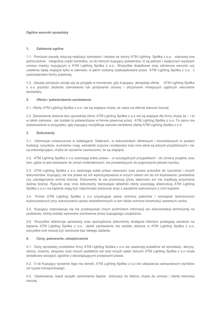 Ogólne warunki sprzedaży 1. Założenia ogólne 1.1. Poniższe zasady dotyczą realizacji zamówień i dostaw ze strony ATM Lighting Spółka z o.o. stanowią one jednocześnie integralną część kontraktu, co do których kupujący potwierdza, iż są pełnym i wyłącznym wyrazem umowy między kupującym a ATM Lighting Spółka z o.o.. Wszystkie dodatkowe oraz odmienne warunki czy ustalenia będą wiążące tylko w zakresie, w jakim zostaną zaakceptowane przez ATM Lighting Spółka z o.o. z zastrzeżeniem formy pisemnej. 1.2. Zasady poniższe uznaje się za przyjęte w momencie, gdy kupujący akceptuje ofertę ATM Lighting Spółka z o.o poprzez złożenie zamówienia lub podpisanie umowy i otrzymanie niniejszych ogólnych warunków sprzedaży. 2. Oferta / potwierdzenie zamówienia 2.1. Oferty ATM Lighting Spółka z o.o. nie są wiążące chyba, że zapis na ofercie stanowi inaczej. 2.2. Zamówienia złożone bez uprzedniej oferty ATM Lighting Spółka z o.o nie są wiążące dla firmy chyba że – i to w takim zakresie - jak zostało to potwierdzone w formie pisemnej przez ATM Lighting Spółka z o.o. To samo ma zastosowanie w przypadku, gdy kupujący modyfikuje warunki określone ofertą ATM Lighting Spółka z o.o. 3. Dokumenty 3.1. Informacje umieszczone w katalogach, folderach, w dokumentach ofertowych i kontraktowych w postaci ilustracji, rysunków, wymiarów i wag, wskaźniki zużycia i wydajności oraz inne dane są danymi przybliżonymi i nie są zobowiązujące, chyba że wyraźnie zaznaczono, że są wiążące. 3.2. ATM Lighting Spółka z o.o zastrzega sobie prawo – w szczególnych przypadkach - do zmiany projektu oraz tam, gdzie to jest wskazane do zmian materiałowych, nie prowadzących do pogorszenia jakości wyrobu. 3.3. ATM Lighting Spółka z o.o zastrzega sobie prawo własności oraz prawa autorskie do rysunków i innych dokumentów. Kupujący nie ma prawa do ich wykorzystywania w innych celach ani do ich kopiowania, powielania czy udostępniania stronie trzeciej. Dokumenty te nie przenoszą tytułu własności ani nie implikują przyznania żadnej licencji. Rysunki oraz inne dokumenty stanowiące składniki oferty pozostają własnością ATM Lighting Spółka z o.o i na żądanie mają być natychmiast zwrócone wraz z wszelkimi wykonanymi z nich kopiami. 3.4. Firmie ATM Lighting Spółka z o.o przysługuje pełna ochrona patentów i rozwiązań technicznych wykorzystanych przy wykonywaniu opraw oświetleniowych w tym także ochrona konstrukcji zawartych umów. 3.5. Kupujący zobowiązuje się nie przekazywać innym podmiotom informacji ani dokumentacji technicznej na podstawie, której zostały wykonane zamówione przez kupującego urządzenia. 3.6. Wszystkie referencje sprzedaży oraz sporządzone dokumenty dostępne klientom podlegają zwrotowi na żądanie ATM Lighting Spółka z o.o.. Jeżeli zamówienie nie zostało złożone w ATM Lighting Spółka z o.o, wszystkie one muszą być zwrócone bez takiego żądania. 4. Ceny, pakowanie, ubezpieczenie 4.1. Ceny sprzedaży produktów firmy ATM Lighting Spółka z o.o nie zawierają podatków od sprzedaży, akcyzy, obrotu, importu, eksportu oraz innych podatków ceł oraz innych opłat, którymi ATM Lighting Spółka z o.o może dodatkowo obciążyć zgodnie z obowiązującymi przepisami prawa. 4.2. O ile Kupujący wyraźnie tego nie określi, ATM Lighting Spółka z o.o nie ubezpiecza zamawianych wyrobów od ryzyka transportowego. 4.3. Opakowanie, koszt wysyłki zamówienia będzie doliczany do faktury chyba że umowa / oferta stanowią inaczej. 5. Przeniesienie ryzyka 5.1.O ile nie zostanie to wyraźnie ustalone inaczej, ryzyko przechodzi na Kupującego w czasie dostarczenia towaru do pierwszego przewoźnika. 5.2. Jeśli wysyłka zostanie opóźniona z przyczyn niewypełnienia obowiązków przez Kupującego i jeżeli opóźnienie to wynika z przyczyn niezależnych od ATM Lighting Spółka z o.o, ryzyko przechodzi na Kupującego z momentem zawiadomienia go o gotowości do wysyłki. 6. Terminy dostaw 6.1. Terminy realizacji zleceń są obliczane na podstawie aktualnie obowiązującego zakładowego Harmonogramu produkcji. Uwzględnia on moce produkcyjne, terminy dostaw poddostawców i kooperantów. W przypadku zmiany tej podstawy ATM Lighting Spółka z o.o zastrzega sobie prawo do stosownego wydłużenia terminu dostawy. Bieg terminu dostawy rozpoczyna się wraz z wysłaniem potwierdzenia zamówienia, zakończeniem ustaleń handlowych i technicznych realizacji kontraktu, otrzymaniem przez ATM Lighting Spółka z o.o dokumentów dostarczanych przez Kupującego, wydaniem wszelkich stosownych autoryzacji i zezwoleń, podpisaniem kontraktu oraz przelaniem na rachunek ATM Lighting Spółka z o.o płatności przewidzianych umową. Przestrzeganie terminu dostawy uzależnione będzie od terminowego wywiązywania się z zobowiązań umownych przez Kupującego. Wszelkie zmiany wymagane przez Kupującego mogą spowodować przedłużenie terminu dostawy. Wyroby uznaje się za dostarczone terminowo jeśli zostaną przekazane do pierwszego przewoźnika albo gdy zostaną zgłoszone jako gotowe do wysyłki przed upływem uzgodnionego terminu dostawy. Dopuszczalne są dostawy częściowe. Drobne defekty nie wpływają na obowiązek Kupującego odbioru wyrobów; w takim przypadku termin dostawy jest uznany za dotrzymany. 6.2. Jeśli dostawa jest opóźniona z powodów przypisywanych Kupującemu lub jeśli nie zostanie odebrana przez Kupującego we właściwym czasie, ATM Lighting Spółka z o.o wg własnego uznania i bez żadnej odpowiedzialności ma prawo zmagazynowania wyrobów na ryzyko Kupującego, zafakturowania ich i obciążenia Kupującego kosztami składowania. Jeśli składowanie odbywa się w magazynach ATM Lighting Spółka z o.o, koszty składowania wynoszą nie mniej niż 1,0% wartości fakturowanej za każdy miesiąc począwszy od daty zgłoszenia gotowości do wysyłki. ATM Lighting Spółka z o.o ma praw
