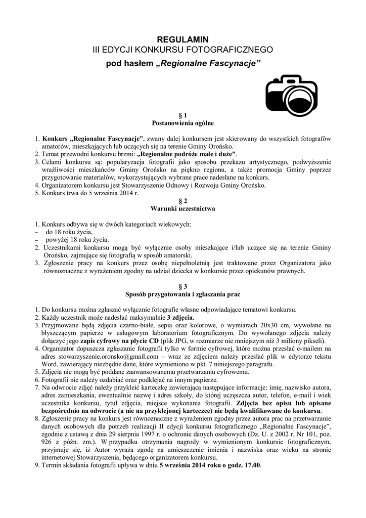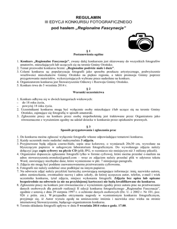 REGULAMIN III EDYCJI KONKURSU FOTOGRAFICZNEGO pod hasłem „Regionalne Fascynacje” §1 Postanowienia ogólne 1. Konkurs „Regionalne Fascynacje”, zwany dalej konkursem jest skierowany do wszystkich fotografów amatorów, mieszkających lub uczących się na terenie Gminy Orońsko. 2. Temat przewodni konkursu brzmi: „Regionalne podróże małe i duże”. 3. Celami konkursu są: popularyzacja fotografii jako sposobu przekazu artystycznego, podwyższenie wrażliwości mieszkańców Gminy Orońsko na piękno regionu, a także promocja Gminy poprzez przygotowanie materiałów, wykorzystujących wybrane prace nadesłane na konkurs. 4. Organizatorem konkursu jest Stowarzyszenie Odnowy i Rozwoju Gminy Orońsko. 5. Konkurs trwa do 5 września 2014 r. §2 Warunki uczestnictwa 1. Konkurs odbywa się w dwóch kategoriach wiekowych: do 18 roku życia, powyżej 18 roku życia. 2. Uczestnikami konkursu mogą być wyłącznie osoby mieszkające i/lub uczące się na terenie Gminy Orońsko, zajmujące się fotografią w sposób amatorski. 3. Zgłoszenie pracy na konkurs przez osobę niepełnoletnią jest traktowane przez Organizatora jako równoznaczne z wyrażeniem zgodny na udział dziecka w konkursie przez opiekunów prawnych. §3 Sposób przygotowania i zgłaszania prac 1. Do konkursu można zgłaszać wyłącznie fotografie własne odpowiadające tematowi konkursu. 2. Każdy uczestnik może nadesłać maksymalnie 3 zdjęcia. 3. Przyjmowane będą zdjęcia czarno-białe, sepia oraz kolorowe, o wymiarach 20x30 cm, wywołane na błyszczącym papierze w usługowym laboratorium fotograficznym. Do wywołanego zdjęcia należy dołączyć jego zapis cyfrowy na płycie CD (plik JPG, w rozmiarze nie mniejszym niż 3 miliony pikseli). 4. Organizator dopuszcza zgłaszanie fotografii tylko w formie cyfrowej, które można przesłać e-mailem na adres [email protected] – wraz ze zdjęciem należy przesłać plik w edytorze tekstu Word, zawierający niezbędne dane, które wymieniono w pkt. 7 niniejszego paragrafu. 5. Zdjęcia nie mogą być poddane zaawansowanemu przetwarzaniu cyfrowemu. 6. Fotografii nie należy ozdabiać oraz podklejać na innym papierze. 7. Na odwrocie zdjęć należy przykleić karteczkę zawierającą następujące informacje: imię, nazwisko autora, adres zamieszkania, ewentualnie nazwę i adres szkoły, do której uczęszcza autor, telefon, e-mail i wiek uczestnika konkursu, tytuł zdjęcia, miejsce wykonania fotografii. Zdjęcia bez opisu lub opisane bezpośrednio na odwrocie (a nie na przyklejonej karteczce) nie będą kwalifikowane do konkursu. 8. Zgłoszenie pracy na konkurs jest równoznaczne z wyrażeniem zgodny przez autora prac na przetwarzanie danych osobowych dla potrzeb realizacji II edycji konkursu fotograficznego „Regionalne Fascynacje”, zgodnie z ustawą z dnia 29 sierpnia 1997 r. o ochronie danych osobowych (Dz. U. z 2002 r. Nr 101, poz. 926 z późn. zm.). W przypadku otrzymania nagrody w wymienionym konkursie fotograficznym, przyjmuje się, iż Autor wyraża zgodę na umieszczenie imienia i nazwiska oraz wieku na stronie internetowej Stowarzyszenia, będącego organizatorem konkursu. 9. Termin składania fotografii upływa w dniu 5 września 2014 roku o godz. 17.00. 10. Fotografie można składać e-mailem na adres Stowarzyszenia, osobiście lub nadsyłać pocztą na adres: Sylwester Różycki 26-505 Orońsko, ul. Szkolna 1a (osobiste składanie prac w godz. od 8.00 do 17.00 pod wskazanym adresem). Zdjęcia oraz płyty z zapisem cyfrowym powinny być przekazane w zamkniętej kopercie, na której należy zamieścić opis „Konkurs fotograficzny - Regionalne Fascynacje 2014”. Zdjęcia przekazywane na konkurs należy zabezpieczyć przed uszkodzeniami mechanicznymi (np. umieścić je pomiędzy sztywnymi kartkami, a następnie włożyć do koperty o odpowiednio dobranej wielkości). 11. Fotografie złożone po wyznaczonym terminie składania prac nie będą zakwalifikowane do konkursu, w przypadku wysłania fotografii pocztą decyduje data stempla pocztowego. 12. Fotografie nie spełniające wymogów, sprecyzowanych w niniejszym regulaminie, nie będą brały udziału w konkursie. §4 Prawa autorskie 1. Nadesłanie prac na konkurs jest równoznaczne z przekazaniem praw autorskich organizatorowi konkursu, tj. Stowarzyszeniu Odnowy i Rozwoju Gminy Orońsko. 2. Złożenie prac na konkurs jest równoznaczne z oświadczeniem autora, iż udziela on bez dodatkowego oświadczenia nieodpłatnej licencji niewyłącznej w zakresie prezentowania fotografii we wszelkich wydawnictwach i publikacjach oraz akcjach promocyjnych prowadzonych przez Stowarzyszenie Odnowy i Rozwoju Gminy Orońsko. 3. Z tytułu wykorzystania zdjęć autorom nie przysługują honoraria. 4. W przypadku wykorzystania danej pracy każdorazowo zostanie podane imię i nazwisko autora. §5 Rozstrzygnięcie konkursu 1. Oceny fotografii dokona komisja konkursowa powołana przez Stowarzyszenie Odnowy i Rozwoju Gminy Orońsko, w skład której wejdą przedstawiciele Stowarzyszenia, Urzędu Gminy w Orońsku, a także Centrum Rzeźby Polskiej w Orońsku. 2. Fotografie zgłoszone do konkursu będą oceniane osobno w każdej kategorii wiekowej. 3. Ocenie podlegać będą zarówno walory artystyczne jak i techniczne zgłoszonych prac. 4. Komisja konkursowa przyzna po trzy nagrody rzeczowe w każdej kategorii wiekowej. Autorzy prac zakwalifikowanych do wystawy pokonkursowej zostaną uhonorowani dyplomami za udział w konkursie. 5. Wręczenie nagród odbędzie się najpóźniej do końca września 2014 roku, po uprzednim zawiadomieniu o dokładnym terminie osób nagrodzonych bądź wyróżnionych 6. Komisja konkursowa zakwalifikuje fotografie do wystawy pokonkursowej, która zostanie zorganizowana po zakończeniu konkursu w Centrum Rzeźby Polskiej w Orońsku. 7. Werdykt komisji konkursowej, zapisany protokolarnie, jest ostateczny i nie przysługuje od niego odwołanie. §6 Postanowienia końcowe 1. Organizator zas