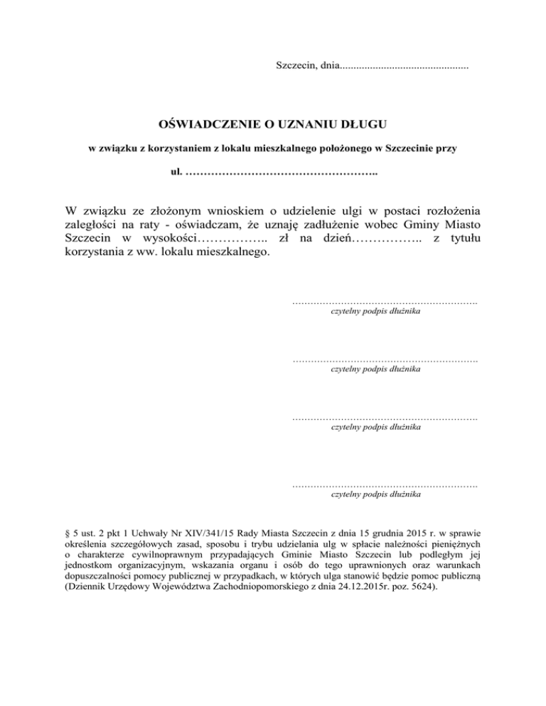 Szczecin, dnia............................................... OŚWIADCZENIE O UZNANIU DŁUGU w związku z korzystaniem z lokalu mieszkalnego położonego w Szczecinie przy ul. …………………………………………….. W związku ze złożonym wnioskiem o udzielenie ulgi w postaci rozłożenia zaległości na raty - oświadczam, że uznaję zadłużenie wobec Gminy Miasto Szczecin w wysokości…………….. zł na dzień…………….. z tytułu korzystania z ww. lokalu mieszkalnego. ……………………………………………………. czytelny podpis dłużnika ……………………………………………………. czytelny podpis dłużnika ……………………………………………………. czytelny podpis dłużnika ……………………………………………………. czytelny podpis dłużnika § 5 ust. 2 pkt 1 Uchwały Nr XIV/341/15 Rady Miasta Szczecin z dnia 15 grudnia 2015 r. w sprawie określenia szczegółowych zasad, sposobu i trybu udzielania ulg w spłacie należności pieniężnych o charakterze cywilnoprawnym przypadających Gminie Miasto Szczecin lub podległym jej jednostkom organizacyjnym, wskazania organu i osób do tego uprawnionych oraz warunkach dopuszczalności pomocy publicznej w przypadkach, w których ulga stanowić będzie pomoc publiczną (Dziennik Urzędowy Województwa Zachodniopomorskiego z dnia 24.12.2015r. poz. 5624).