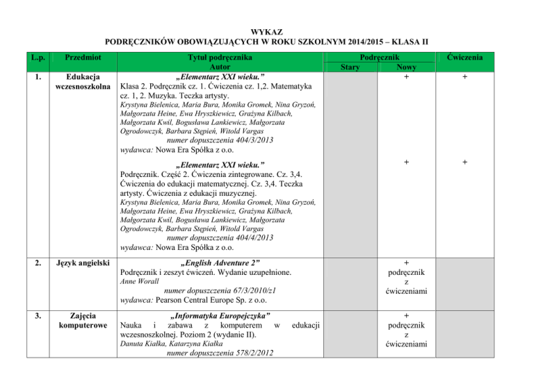 WYKAZ PODRĘCZNIKÓW OBOWIĄZUJĄCYCH W ROKU SZKOLNYM 2014/2015 – KLASA II L.p. Przedmiot 1. Edukacja wczesnoszkolna Tytuł podręcznika Autor „Elementarz XXI wieku.” Klasa 2. Podręcznik cz. 1. Ćwiczenia cz. 1,2. Matematyka cz. 1, 2. Muzyka. Teczka artysty. Podręcznik Stary Nowy + Ćwiczenia + Krystyna Bielenica, Maria Bura, Monika Gromek, Nina Gryzoń, Małgorzata Heine, Ewa Hryszkiewicz, Grażyna Kilbach, Małgorzata Kwil, Bogusława Lankiewicz, Małgorzata Ogrodowczyk, Barbara Stępień, Witold Vargas numer dopuszczenia 404/3/2013 wydawca: Nowa Era Spółka z o.o. „Elementarz XXI wieku.” Podręcznik. Część 2. Ćwiczenia zintegrowane. Cz. 3,4. Ćwiczenia do edukacji matematycznej. Cz. 3,4. Teczka artysty. Ćwiczenia z edukacji muzycznej. + Krystyna Bielenica, Maria Bura, Monika Gromek, Nina Gryzoń, Małgorzata Heine, Ewa Hryszkiewicz, Grażyna Kilbach, Małgorzata Kwil, Bogusława Lankiewicz, Małgorzata Ogrodowczyk, Barbara Stępień, Witold Vargas numer dopuszczenia 404/4/2013 wydawca: Nowa Era Spółka z o.o. 2. Język angielski „English Adventure 2” Podręcznik i zeszyt ćwiczeń. Wydanie uzupełnione. + podręcznik z ćwiczeniami Anne Worall numer dopuszczenia 67/3/2010/z1 wydawca: Pearson Central Europe Sp. z o.o. 3. Zajęcia komputerowe „Informatyka Europejczyka” Nauka i zabawa z komputerem w wczesnoszkolnej. Poziom 2 (wydanie II). Danuta Kiałka, Katarzyna Kiałka numer dopuszczenia 578/2/2012 edukacji + podręcznik z ćwiczeniami + wydawca: Grupa Wydawnicza „Helion” S.A. 4. Religia „Idziemy do Jezusa” E.Kondrak, J.Czerkawski numer dopuszczenia AZ-12-01/12-KI-3/12 wydawca: Jedność, Kielce + podręcznik z ćwiczeniami WYKAZ PODRĘCZNIKÓW OBOWIĄZUJĄCYCH W ROKU SZKOLNYM 2014/2015 – KLASA III L.p. Przedmiot 1. Edukacja wczesnoszkolna Tytuł podręcznika Autor „Skarby” Podręcznik. Część 1. Ćwiczenia. Części 1,2. Podręcznik z ćwiczeniami do matematyki. Części 1,2. Podręcznik Stary Nowy + Ćwiczenia + Beata Szurowska, Barbara Tichy, Roman Bankiewicz numer dopuszczenia 337/5/2013 wydawca: Wydawnictwo Juka-91 Spółka z o.o. „Skarby” Podręcznik. Klasa 3. Cz. 2. Ćwiczenia. Cz. 3,4. Podręcznik z ćwiczeniami do matematyki. Cz. 3 i 4. + Beata Szurowska, Barbara Tichy, Roman Bankiewicz numer dopuszczenia 337/6/2013 wydawca: Wydawnictwo Juka-91 Spółka z o.o. 2. Język angielski „English Adventure 3” Podręcznik i zeszyt ćwiczeń. Wydanie uzupełnione. Anne Worall numer dopuszczenia 67/4/2010/z1 wydawca: Pearson Central Europe Sp. z o.o. 3. Zajęcia komputerowe „Informatyka Europejczyka” Nauka i zabawa z komputerem w wczesnoszkolnej. Poziom 3 (Wydanie II). edukacji + podręcznik z ćwiczeniami + podręcznik z + Danuta Kiałka, Katarzyna Kiałka ćwiczeniami + podręcznik z ćwiczeniami + numer dopuszczenia 578/3/2012 wydawca: Grupa Wydawnicza „Helion” S.A. 4. Religia „Jezus jest z nami” + J.Czerkawski, E.Kondrak, B.Nosek numer dopuszczenia AZ-13-01/12-KI-4/13 wydawca: Jedność, Kielce WYKAZ PODRĘCZNIKÓW OBOWIĄZUJĄCYCH W ROKU SZKOLNYM 2014/2015 – KLASA IV. L.p Przedmiot 1. Język polski Tytuł podręcznika Autor „Jutro pójdę w świat” Podręcznik do kształcenia literackiego, kulturowego i językowego dla klasy czwartej szkoły podstawowej. Podręcznik Stary Nowy + Ćwiczenia + Hanna Dobrowolska, Urszula Dobrowolska numer dopuszczenia 417/1/2012 wydawca: Wydawnictwa Szkolne i Pedagogiczne Sp. z o.o. 2. Matematyka „Matematyka wokół nas” Podręcznik dla szkoły podstawowej. Klasa 4. + + cz. 1 i 2 + + cz. 1 i 2 Helena Lewicka, Marianna Kowalczyk numer dopuszczenia 275/1/2010 wydawca: Wydawnictwa Szkolne i Pedagogiczne Sp. z o.o. 3. Przyroda „Tajemnice przyrody” Podręcznik dla klasy 4. Maria Marko-Worłowska, Feliks Szlajfer, Joanna Stawarz numer dopuszczenia 399/1/2011 wydawca: Nowa Era Spółka z o.o. 4. Historia „Historia wokół nas” + Historia i społeczeństwo. Podręcznik dla klasy 4 szkoły podstawowej. Radosław Lolo, Anna Pieńkowska, Rafał Towalski, Wojciech Kalwat numer dopuszczenia 434/1/2012 wydawca: Wydawnictwa Szkolne i Pedagogiczne Sp. z o.o. 5. Język niemiecki „Punkt” Język niemiecki. Podręcznik z ćwiczeniami i płytą CD dla klasy 4. + podręcznik z ćwiczeniami Anna Potapowicz numer dopuszczenia 304/1/2010 wydawca: Wydawnictwa Szkolne i Pedagogiczne Sp. z o.o. 6. Język angielski „Winners Plus 1” Podręcznik dla szkoły podstawowej + + Cathy Lawday, Mark Hancock numer dopuszczenia 285/1/2010 wydawca: Oxford University Press Polska Sp. z o.o. 7. Plastyka „Plastyka 4-6” Podręcznik do szkoły podstawowej. + podręcznik na 3 lata Stanisław K. Stopczyk, Joanna Chołaścińska, Barbara Neubart numer dopuszczenia 533/2012 wydawca: Wydawnictwa Szkolne i Pedagogiczne sp. z o.o. 8. Muzyka „Klucz do muzyki” + Podręcznik dla klasy 4 szkoły podstawowej. Urszula Smoczyńska, Katarzyna Jakóbczak-Drążek, Agnieszka Sołtysik numer dopuszczenia 406/1/2011 wydawca: Wydawnictwa Szkolne i Pedagogiczne Sp. z o.o. 9. Zajęcia techniczne „Jak to działa?” Podręcznik z ćwiczeniami do zajęć technicznych dla klas 4-6 szkoły podstawowej Lech Łabecki, Marta Łabecka + podręcznik na 3 lata numer dopuszczenia 295/2010 wydawca: Nowa Era Sp. z o.o. Wydawnictwo Era Sp. z o.o. 10. Religia „Miejsce pełne BOGActw” + + ks. K.Mielnicki, E.Kondrak, B.Nosek numer dopuszczenia AZ-21-02/12-KI-1/12 wydawca: Jedność, Kielce WYKAZ PODRĘCZNIKÓW OBOWIĄZUJĄCYCH W ROKU SZKOLNYM 2014/2015 – KLASA V. L.p Przedmiot 1. Język polski Tytuł podręcznika Autor „Jutro pójdę w świat” Podręcznik do kształcenia literackiego, kulturowego i językowego. Szkoła podstawowa. Klasa 5. Podręcznik Stary Nowy + Ćwiczenia + Hanna Dobrowolska, Urszula Dobrowolska numer dopuszczenia 417/2/2013 wydawca: Wydawnictwa Szkolne i Pedagogiczne Sp. z o.o. 2. Matematyka „Matematyka wokół nas” Podręcznik dla szkoły podstawowej. Klasa 5. + + cz. 1 i 2 + + cz. 1 i 2 Helena Lewicka,