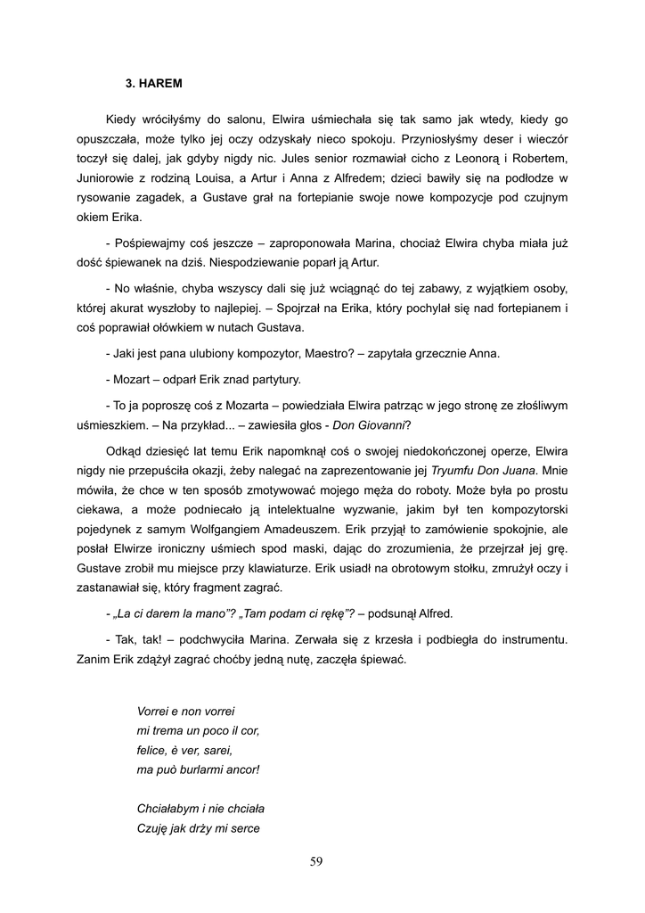 3. HAREM Kiedy wróciłyśmy do salonu, Elwira uśmiechała się tak samo jak wtedy, kiedy go opuszczała, może tylko jej oczy odzyskały nieco spokoju. Przyniosłyśmy deser i wieczór toczył się dalej, jak gdyby nigdy nic. Jules senior rozmawiał cicho z Leonorą i Robertem, Juniorowie z rodziną Louisa, a Artur i Anna z Alfredem; dzieci bawiły się na podłodze w rysowanie zagadek, a Gustave grał na fortepianie swoje nowe kompozycje pod czujnym okiem Erika. - Pośpiewajmy coś jeszcze – zaproponowała Marina, chociaż Elwira chyba miała już dość śpiewanek na dziś. Niespodziewanie poparł ją Artur. - No właśnie, chyba wszyscy dali się już wciągnąć do tej zabawy, z wyjątkiem osoby, której akurat wyszłoby to najlepiej. – Spojrzał na Erika, który pochylał się nad fortepianem i coś poprawiał ołówkiem w nutach Gustava. - Jaki jest pana ulubiony kompozytor, Maestro? – zapytała grzecznie Anna. - Mozart – odparł Erik znad partytury. - To ja poproszę coś z Mozarta – powiedziała Elwira patrząc w jego stronę ze złośliwym uśmieszkiem. – Na przykład... – zawiesiła głos - Don Giovanni? Odkąd dziesięć lat temu Erik napomknął coś o swojej niedokończonej operze, Elwira nigdy nie przepuściła okazji, żeby nalegać na zaprezentowanie jej Tryumfu Don Juana. Mnie mówiła, że chce w ten sposób zmotywować mojego męża do roboty. Może była po prostu ciekawa, a może podniecało ją intelektualne wyzwanie, jakim był ten kompozytorski pojedynek z samym Wolfgangiem Amadeuszem. Erik przyjął to zamówienie spokojnie, ale posłał Elwirze ironiczny uśmiech spod maski, dając do zrozumienia, że przejrzał jej grę. Gustave zrobił mu miejsce przy klawiaturze. Erik usiadł na obrotowym stołku, zmrużył oczy i zastanawiał się, który fragment zagrać. - „La ci darem la mano”? „Tam podam ci rękę”? – podsunął Alfred. - Tak, tak! – podchwyciła Marina. Zerwała się z krzesła i podbiegła do instrumentu. Zanim Erik zdążył zagrać choćby jedną nutę, zaczęła śpiewać. Vorrei e non vorrei mi trema un poco il cor, felice, è ver, sarei, ma può burlarmi ancor! Chciałabym i nie chciała Czuję jak drży mi serce 59 Czy byłabym szczęśliwa, Czy tylko naraziła się na szyderstwa? Duet, w którym Don Giovanni oczarowuje wiejską ślicznotkę Zerlinę w dniu jej własnego ślubu. Gdyby nie interwencja Donny Elwiry, Zerlina poleciałaby na bezwzględnego uwodziciela jak mucha na miód. Erik popatrzył nieco zdziwiony na Marinę, ale po chwili roześmiał się i pokręcił głową. Zagrał jej nawet parę taktów akompaniamentu, ale sam nie zaśpiewał ani jednej nuty. Nasza Donna Elwira i tym razem zareagowała w porę. - Marina! To Prospero miał śpiewać! – skarciła siostrę. Amina Bernard zrobiła się czerwona po same uszy. - Ładnie śpiewasz, Arielku – Erik starał się załagodzić sytuację, ale Elwira tylko wskazała młodszej siostrze miejsce obok siebie na krześle. Marina wróciła do stołu jak niepyszna. - “Finch’han dal vino calda la testa”? “Kiedy wino zaszumi w głowie”? – zaproponowała Elwira. – To chyba odpowiednia aria na przyjęcie. Biesiadnicy pokiwali głowami z uśmiechem, a Robert wzniósł w stronę mojego męża kielich gestem toastu. Erik zagrał kilka taktów przygrywki, spojrzał na mnie przeciągle znad klawiszy i zaśpiewał. Dalla sua pace la mia dipende; quel che a lei piace vita mi rende, quel che le incresce morte mi dà. S’ella sospira, sospiro anch’io, è mia quell’irà, quel pianto è mio! E non ho bene s’ella non l’ha. Od jej spokoju mój spokój zależy To co ją cieszy przywraca mi życie, To co ją martwi, rani mnie śmiertelnie. Gdy ona wzdycha, wzdycham i ja, Dzielę jej gniew i smutek, I nie ma dla mnie radości bez niej. Boże mój, jak on potrafi śpiewać... Za stołem ucichło jak makiem zasiał, dzieci siedziały na podłodze z otwartymi buziami, Lucie zastygła z łyżeczką włożoną do ust. Anna i Marie 60 Alphonsine, które nie miały wcześniej okazji słyszeć próbki talentu wokalnego mojego męża, siedziały jak zaczarowane, patrząc na niego okrągłymi z zaskoczenia oczami. Artur pokiwał w milczeniu głową, jakby chciał dać znak swojej towarzyszce: „A nie mówiłem”, a Leonora zaplotła ręce na piersi. Ja się chyba trochę przyzwyczaiłam, ale czy do czegoś takiego można się kiedykolwiek przyzwyczaić? Poczułam jak gardło ściska mi wzruszenie, a w oczach zbierają się łzy. Pierwsza odezwała się oczywiście Marina. - Don Ottavio, Prospero? – zawołała z niedowierzaniem, jakby miała mu coś za złe. – Ten niedorajda Don Ottavio?! Miał być Don Giovanni! Don Ottavio przy Don Giovannim to jak wróbel przy orle! - Ty byś zapewne wolała zbira w pelerynie i czarnej masce, który by cię rzucił na ziemię, a potem... – zaczął zirytowany Louis, ale nie skończył, bo Marie Alphonsine złapała go gwałtownie za ramię i piorunując wzrokiem skinęła głową w stronę siedzącego na dywanie Claude’a, który wpatrywał się w ojca ciekawie. Marina otworzyła już usta, aby dać odpór bratu, ale Erik był szybszy. - Partia Don Giovanniego jest napisana na bas-baryton. Nie przypuszczaliście chyba, że zacznę wam tu śpiewać basem? Dla tenora jest tam tylko Don Ottavio. – Uśmiechnął się tryumfalnie i rzucił spojrzenie w stronę Elwiry, która wyglądała jak ktoś, kto oberwał czymś ciężkim w głowę. - Touché, Prospero! – zawołał Artur klaszcząc w dłonie, a potem szeptem zaczął wyjaśniać Annie skąd się wzięło imię Prospero. - Don Ottavio, son morta... Don Ottavio, ja umarłam... – westchnęła tylko Elwira cytując fragment partii Donny Anny, zupełnie nie takim tonem, jak skomponował to Mozart. – Ja ci tu zaraz zemdleję. Spadnę z krzesła i jako dobry gospodarz będziesz musiał zacząć mnie cucić. – Uśmiechnęła się odrobinę złośliwie. - Usta usta – doda