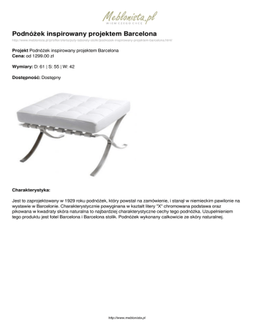 Podnóżek inspirowany projektem Barcelona http://www.meblonista.pl/pl/offer/oferta/pufy-taborety-stolki/podnozek-inspirowany-projektem-barcelona.html/ Projekt Podnóżek inspirowany projektem Barcelona Cena: od 1299.00 zł Wymiary: D: 61 | S: 55 | W: 42 Dostępność: Dostępny Charakterystyka: Jest to zaprojektowany w 1929 roku podnóżek, który powstał na zamówienie, i stanął w niemieckim pawilonie na wystawie w Barcelonie. Charakterystycznie powyginana w kształt litery "X" chromowana podstawa oraz pikowana w kwadraty skóra naturalna to najbardziej charakterystyczne cechy tego podnóżka. Uzupełnieniem tego produktu jest fotel Barcelona i Barcelona stolik. Podnóżek wykonany całkowicie ze skóry naturalnej. http://www.meblonista.pl Dostępne wersje produktu: nazwa produktu warianty Podnóżek inspirowanykolor czarny projektem Barcelona cena 1299.00zł dostępne Dostępny Podnóżek inspirowanykolor biały projektem Barcelona 1299.00zł Dostępny Podnóżek inspirowanykolor brązowy projektem Barcelona 1299.00zł Na zamówienie Podnóżek inspirowanykolor czerwony projektem Barcelona Podnóżek inspirowanypony projektem Barcelona 1299.00zł Na zamówienie 1399.00zł Na zamówienie http://www.meblonista.pl Zdjęcia produktu: http://www.meblonista.pl Powered by TCPDF (www.tcpdf.org)