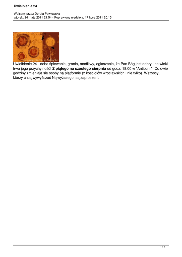 Uwielbienie 24 Wpisany przez Dorota Pawłowska wtorek, 24 maja 2011 21:54 - Poprawiony niedziela, 17 lipca 2011 20:15 Uwielbienie 24 - doba śpiewania, grania, modlitwy, ogłaszania, że Pan Bóg jest dobry i na wieki trwa jego przychylność! Z piątego na szóstego sierpnia od godz. 18.00 w "Antiochii". Co dwie godziny zmieniają się osoby na platformie (z kościołów wrocławskich i nie tylko). Wszyscy, którzy chcą wywyższać Najwyższego, są zaproszeni. 1/1