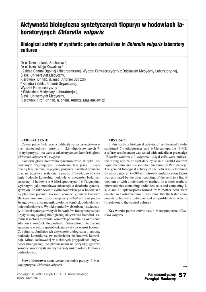 !KTYWNOu¿BIOLOGICZNASYNTETYCZNYCHTIOPURYNWHODOWLACHLA BORATORYJNYCH#HLORELLAVULGARIS "IOLOGICALACTIVITYOFSYNTHETICPURINEDERIVATIVESIN#HLORELLAVULGARISLABORATORY CULTURES $RNFARM*OLANTA3OCHACKA $RNFARM!LICJA+OWALSKA :AKAD#HEMII/GÌLNEJI.IEORGANICZNEJ7YDZIA&ARMACEUTYCZNYZ/DDZIAEM-EDYCYNY,ABORATORYJNEJ gLSKI5NIWERSYTET-EDYCZNY +IEROWNIK$RHABNMED!NDRZEJ3OBCZAK +ATEDRAI:AKAD#HEMII/RGANICZNEJ 7YDZIA&ARMACEUTYCZNY Z/DDZIAEM-EDYCYNY,ABORATORYJNEJ gLSKI5NIWERSYTET-EDYCZNY +IEROWNIK0ROFDRHABNCHEM!NDRZEJ-AuLANKIEWICZ STRESZCZENIE Celem pracy była ocena oddziaływania zsyntetyzowanych tiopochodnych puryny – 2,6 -dipodstawionych 7-metylopuryny – na wzrost eukariotycznych komórek glonu Chlorella vulgaris (C. vulgaris). Komórki glonu hodowano synchronicznie, w cyklu hodowlanym obejmującym 12-godzinną fazę jasną i 12-godzinną fazę ciemną, w płynnej pożywce Kuehla-Lorenzena oraz na pożywce zestalonej agarem. Prowadzono równolegle hodowle kontrolne, hodowle w obecności badanych substancji i hodowle z 6-Merkaptopuryną i 6-Tioguaniną, wybranymi jako modelowa substancje o działaniu cytotoksycznym. Po zakończeniu cyklu hodowlanego w hodowlach na płynnym podłożu zliczano komórki glonu w komorze Burkera i mierzono absorbancję przy λ=680 nm, a na podłożu agarowym zliczano mikrokolonie komórek podzielonych i niepodzielonych. Wyniki pomiarów absorbancji świadczyły o ilości syntetyzowanych barwników fotosyntetycznych i były miarą ogólnej biologicznej aktywności komórki, natomiast metoda zliczania komórek pozwoliła na określenie zdolności komórek do podziału. Stwierdzono, że badane substancje w różny sposób oddziaływały na wzrost hodowli C. vulgaris, obniżając ich aktywność biologiczną i hamując podziały komórkowe (w odniesieniu do hodowli kontrolnej). Mimo zachowanej w niektórych przypadkach aktywności biologicznej, po przeniesieniu na pożywkę agarową komórki macierzyste nie wytwarzały mikrokolonii komórek podzielonych. ABSTRACT In this study, a biological activity of synthesized 2,6-disubtituted 7-methylpurines and 6-Mercaptopurine (6-MP, a reference substance) was tested with unicellular green alga Chlorella vulgaris (C. vulgaris). Algal cells were cultivated during one 24-hr light-dark cycle in a Kuehl-Lorenzen liquid medium and in a solidified medium (on Petri dishes). The general biological activity of the cells was determined by absorbance at λ=680 nm. Growth multiplication factor was estimated by the direct counting of the cells in a liquid medium or with a microcolony method. In a latter method, microcolonies containing undivided cells and containing 2, 4, 8 and 16 aplanospores formed from mother cells were counted in a solid medium. It was found that the tested compounds exhibited a cytotoxic and antiproliferative activity (in relation to the control culture). Key words: purine derivatives, 6-Mercaptopurine, Chlorella vulgaris Słowa kluczowe: syntetyczne pochodne puryny, 6-Merkaptopuryna, Chlorella vulgaris COPYRIGHT'RUPA$R!2+WIECIÊSKIEGO )33. → &ARMACEUTYCZNY 0RZEGLD.AUKOWY ¡¤°°U Syntetyczne tiopochodne naturalnych zasad purynowych (guaniny i hipoksantyny), 6-Merkaptopuryna i 6-Tioguanina, stosowane są w leczeniu chorób nowotworowych. Molekularny mechanizm ich działania nie jest ostatecznie wyjaśniony. Wiadomo, że mechanizm hamujący wzrost komórek, który jest efektem antymetabolicznym i odwracalnym [1], związany jest z inhibicją syntezy puryn de novo [2], a mechanizm cytotoksyczności wynika z inkorporacji tiopurynowych nukleotydów do kwasów nukleinowych i hamowania układów enzymatycznych w syntezie i replikacji DNA w fazie S cyklu komórkowego [3]. Antymetabolity purynowe nie wykazują selektywnego działania przeciwnowotworowego i uszkadzają nie tylko szybko proliferujące komórki nowotworowe, ale wykazują także umiarkowaną toksyczność wobec tkanek zdrowych szybko rosnących, w których często występują podziały komórkowe (szpik, gamety, immunokompetentne komórki układu chłonnego) [4]. Aktywność biologiczną otrzymanych pochodnych tiopurynowych oceniano względem jednokomórkowego glonu Chlorella vulgaris (C. vulgaris), który pod względem morfologicznym jest typową komórką eukariotyczną. Jednak w odróżnieniu do większości komórek Eukaryota w których w czasie cyklu komórkowego, ilość składników komórki wzrasta dwukrotnie i komórka dzieli się na dwie komórki potomne, w komórce Chlorella w jednym cyklu komórkowym może mieć miejsce 2, 4 i 8-krotne powielanie składników komórki w wyniku, czego komórka macierzysta dzieli się nawet na 8 komórek potomnych [5]. W cyklu życiowym C. vulgaris, stosując jako kryterium podziału czas syntezy DNA, można wyróżnić fazę G1, S, G2 i M. W fazie G1, trwającej od podziału komórki następuje gromadzenie energii chemicznej, synteza RNA, białek strukturalnych i enzymatycznych oraz węglowodanów (jeżeli komórka znajdzie się w warunkach, w których nie następuje gromadzenie energii faza G1 przechodzi w fazę G0 i następuje chwilowe zatrzymanie cyklu komórkowego). W fazie S ma miejsce replikacja DNA i synteza białek jądrowych, a w fazie G2 ma miejsce naprawa DNA i przygotowanie do podziału mitotycznego. Faza M obejmuje podział jądra komórkowego i cytokinezę oraz ostatecznie podział komórki macierzystej na aplanospory. Rozwój komórek Chlorella po uwolnieniu aplanospor w wyniku rozerwania ściany komórkowej komórki macierzystej, aż do kariokinezy włącznie, uzależniony jest od obecności światła, natomiast cytokineza i uwolnienie aplanospor mogą przebiegać w ciemności. Powstające w ciemności bezpośrednio po podziale młode aplanospory po rozpoczęciu naświetlania stają się aplanosporami aktywnymi fotosyntetycznie, zdolnymi do szybkiego wzrostu. W wyniku intensywnych przemian biochemicznych i morfologicznych przekształcają się w całkowicie dojrzałe do podziału komórki macierzyste [6]. ")") Do 