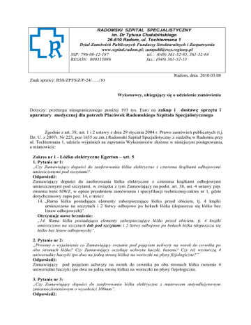 RADOMSKI SZPITAL SPECJALISTYCZNY im. Dr Tytusa Chałubińskiego 26-610 Radom, ul. Tochtermana 1 Dział Zamówień Publicznych Funduszy Strukturalnych i Zaopatrzenia www.szpital.radom.pl; [email protected] NIP: 796-00-12-187 tel.: (048) 361-52-85, 361-52-84 REGON: 000315086 fax.: (048) 361-52-13 Radom, dnia 2010.03.08 Znak sprawy: RSS/ZPFSiZ/P-24/…../10 Wykonawcy, ubiegający się o udzielenie zamówienia Dotyczy: przetargu nieograniczonego poniżej 193 tys. Euro na zakup i dostawę sprzętu i aparatury medycznej dla potrzeb Placówek Radomskiego Szpitala Specjalistycznego Zgodnie z art. 38, ust. 1 i 2 ustawy z dnia 29 stycznia 2004 r. Prawo zamówień publicznych (t.j. Dz. U. z 2007r. Nr 223, poz 1655 ze zm.) Radomski Szpital Specjalistyczny z siedzibą w Radomiu przy ul. Tochtermana 1, udziela wyjaśnień na zapytania Wykonawców złożone w niniejszym postępowaniu, a mianowicie: Zakres nr 1 - Łóżko elektryczne Egerton – szt. 5 1. Pytanie nr 1: „Czy Zamawiający dopuści do zaoferowania łóżka elektryczne z czterema krążkami odbojowymi umieszczonymi pod szczytami?. Odpowiedź: Zamawiający dopuści do zaoferowania łóżka elektryczne z czterema krążkami odbojowymi umieszczonymi pod szczytami, w związku z tym Zamawiający na podst. art. 38, ust. 4 ustawy pzp. zmienia treść SIWZ, w opisie przedmiotu zamówienia i specyfikacji technicznej-zakres nr 1, gdzie dotychczasowy zapis poz. 14, o treści: 14. „Rama łóżka posiadająca elementy zabezpieczające łóżko przed obiciem, tj. 4 krążki umieszczone na szczytach i 2 listwy odbojowe po bokach łóżka (dopuszcza się łóżko bez listew odbojowych)”. Otrzymuje nowe brzmienie: „14. Rama łóżka posiadająca elementy zabezpieczające łóżko przed obiciem, tj. 4 krążki umieszczone na szczytach lub pod szczytami i 2 listwy odbojowe po bokach łóżka (dopuszcza się łóżko bez listew odbojowych)”. 2. Pytanie nr 2: „Prosimy o wyjaśnienie co Zamawiający rozumie pod pojęciem uchwyty na worek do cewnika po obu stronach łóżka? Czy Zamawiający oczekuje uchwytu kaczki, basenu? Czy też wystarczą 4 uniwersalne haczyki (po dwa na jedną stronę łóżka) na woreczki na płyny fizjologiczne?” Odpowiedź: Zamawiający pod pojęciem uchwyty na worek do cewnika po obu stronach łóżka rozumie 4 uniwersalne haczyki (po dwa na jedną stronę łóżka) na woreczki na płyny fizjologiczne. 3. Pytanie nr 3: „Czy Zamawiający dopuści do zaoferowania łóżka elektryczne z materacem antyodleżynowym zmiennociśnieniowym o wysokości 100mm”. Odpowiedź: Powyższe pytanie jest bezprzedmiotowe-parametr określony w zapytaniu mieści się w parametrach wymaganych przez Zamawiającego. 4. Pytanie nr 4: „Czy zamawiający dopuści do zaoferowania łóżka elektryczne z obciążeniem roboczym 170kg?” Odpowiedź: Zamawiający dopuści łóżko elektryczne z obciążeniem roboczym 170kg. Zakres nr 2 – Łóżko szpitalne – szt. 15 5. Pytanie nr 5: „Czy Zamawiający dopuści do zaoferowania łóżko szpitalne ze szczytami wykonanymi z rur chromowanych, wypełnionymi płytą z tworzywa wodoodporną, dwustronnie laminowaną?” Odpowiedź: TAK. Zamawiający dopuszcza łóżko z powyższymi parametrami, w związku z tym Zamawiający na podst. art. 38, ust. 4 ustawy pzp zmienia treść SIWZ w zakresie nr 2, w poz. 5, gdzie dotychczasowy zapis: 5. „Szczyty łóżka wykonane z rur niklowo-chromowych, wypełnione płytą z tworzywa wodoodporną, dwustronnie laminowana – w kolorze jasnoniebieskim”. Otrzymuje nowe brzmienie: „5. Szczyty łóżka wykonane z rur niklowo-chromowych lub chromowanych wypełnione płytą z tworzywa wodoodporną, dwustronnie laminowana – w kolorze jasnoniebieskim”. 6. Pytanie nr 6: „Prosimy o wyjaśnienie co zamawiający rozumie pod pojęciem wieszak na cewnik po obu stronach łóżka? Czy Zamawiający oczekuje uchwytu kaczki, basenu? Czy też wystarczą 4 uniwersalne haczyki (po dwa na jedną stronę łóżka) na woreczki na płyny fizjologiczne?” Odpowiedź: Zamawiający pod pojęciem uchwyty na worek do cewnika po obu stronach łóżka rozumie 4 uniwersalne haczyki (po dwa na jedną stronę łóżka) na woreczki na płyny fizjologiczne?. 7. Pytanie nr 7: „Czy Zamawiający dopuści do zaoferowania łóżka szpitalne bez wieszaków do mocowania wyposażenia dodatkowego, z czterema uniwersalnymi haczykami?” Odpowiedź: TAK. Zamawiający dopuści do zaoferowania łóżka szpitalne bez wieszaków do mocowania wyposażenia dodatkowego, natomiast z czterema uniwersalnymi haczykami, w związku z tym Zamawiający na podst. art. 38, ust. 4 ustawy pzp. zmienia treść SIWZ, w pkt. 8, ppkt. b, gdzie dotychczasowy zapis, o treści: „b) wieszak kroplówki, wieszak na cewnik po obu stronach łóżka” Otrzymuje nowe brzmienie: „b) wieszak kroplówki, haczyki na woreczki po obu stronach łóżka” 8. Pytanie nr 8: „Czy Zamawiający dopuści do zaoferowania łóżka szpitalne z materacem z pianki poliuretanowej o wysokości 120mm?” Odpowiedź: Zamawiający nie dopuści do zaoferowania łóżka szpitalne z materacem z pianki poliuretanowej, ponieważ jest to materiał nieprzepuszczalny, natomiast dopuści materac o wysokości 120mm, w związku z tym Zamawiający na podst. art. 38, ust. 4 zmienia treść SIWZ, w zakresie 2, poz. 8, ppkt. c, gdzie dotychczasowy zapis, o treści: „c) materac – wysokość 10 cm, w pokrowcu z tkaniny nieprzemakalnej, paraprzepuszczalnej” Otrzymuje nowe brzmienie: „c) materac – wysokość do 12 cm, w pokrowcu z tkaniny nieprzemakalnej, paraprzepuszczalnej” 9. Pytanie nr 9: „Czy zamawiający dopuści wydłużenie terminu realizacji do 75 dni?” Odpowiedź: Zamawiający podtrzymuje termin realizacji określony w SIWZ, Wykonawca nie uzasadnił swojej prośby. Zakres nr 1 - Łóżko elektryczne Egerton – szt. 5 10. Pytanie nr 10: „Czy ze względu na łatwiejszą i szybszą dezynfekcję łóżka Zamawiający wymaga rozwiązania konstruk