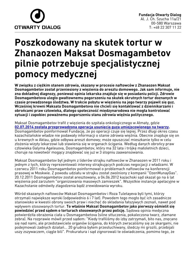 Fundacja Otwarty Dialog Al. J. Ch. Szucha 11a/21 00-580 Warszawa T: +48 22 307 11 22 Poszkodowany na skutek tortur w Zhanaozen Maksat Dosmagambetov pilnie potrzebuje specjalistycznej pomocy medycznej W związku z ciężkim stanem zdrowia, skazany w procesie naftowców z Zhanaozen Maksat Dosmagambetov został przeniesiony z więzienia do aresztu domowego. Jak sam informuje, nie zna dokładnej diagnozy, ponieważ opinia lekarska znajduje się w posiadaniu policji. Zdrowie Dosmagambetova uległo gwałtownemu pogorszeniu na skutek okrutnych tortur doznanych w czasie prowadzonego śledztwa. W trakcie pobytu w więzieniu na jego twarzy pojawił się guz. Wcześniej krewni Maksata Dosmagambetova nie chcieli się kontaktować z dziennikarzami i obrońcami praw człowieka, dlatego społeczność międzynarodowa nie mogła kontrolować sytuacji i zapobiec poważnemu pogorszeniu stanu zdrowia więźnia politycznego. Maksat Dosmagambetov trafił z więzienia do szpitala onkologicznego w Ałmaty, gdzie 02.07.2014 została przeprowadzona operacja usunięcia guza umiejscowionego na twarzy. Dosmagambetov poinformował Fundację, że po operacji czuje się lepiej. Przez długi okres czasu kazachstańskie władze nie podawały informacji o stanie zdrowia więźnia. Obecnie znajduje się on u krewnych w Aktau, gdzie odbywa areszt domowy; może opuszczać mieszkanie tylko w celu złożenia wizyty lekarzowi lub stawienia się w organach ścigania. Według danych obrońcy praw człowieka Galyma Ageleuova, Dosmagambetov, który ma 32 lata i trójkę małoletnich dzieci, choruje na nowotwór mogący znajdować się już w 3 stopniu zaawansowania. Maksat Dosmagambetov był jednym z liderów strajku naftowców w Zhanaozen w 2011 roku i jednym z tych, którzy reprezentowali interesy strajkujących podczas negocjacji z władzami. W czerwcu 2011 roku Dosmagambetov poinformował o problemach naftowców na konferencji prasowej w Moskwie. Z powodu udziału w strajku został zwolniony z kompanii "OzenMunayGas". 20.12.2011 Dosmagambetov został aresztowany, a 04.06.2012 kazachski sąd skazał go na 6 lat więzienia pod zarzutem "organizowania masowych zamieszek". Wszystkie instancje apelacyjne w Kazachstanie odmówiły złagodzenia bądź zrewidowania wyroku. Wśród skazanych naftowców Maksat Dosmagambetov i Roza Tuletayeva byli tymi, którzy otrzymali największe wyroki (odpowiednio 6 i 7 lat). Powodem tego mogło być ich zasadnicze stanowisko w kwestii obrony swoich praw i niechęć do składania fałszywych zeznań, nawet pod wpływem stosowanych tortur. To właśnie Maksat Dosmagambetov jako pierwszy ośmielił się powiedzieć przed sądem o torturach stosowanych przez policję. Sądowa opinia medyczna potwierdziła obrażenia ciała u Dosmagambetova (silne stłuczenia, pokaleczona twarz, złamane żebra). Na rozprawie mówił przed sądem: "Kiedy trafiliśmy do izby zatrzymań, bito nas, znęcano się nad nami, ale przedstawiciele organów ścigania, do których zwracaliśmy się ze skargami, nie podejmowali żadnych działań... 20 grudnia byłem przesłuchiwany, śledczy mi grozili, przebijali uszy zszywaczem, ciągle bili". Prokuratura i sąd zignorowali te oświadczenia, pomimo tego, że Dosmagambetov wskazał na tych, którzy go bili: "Bił mnie Zhandarbekov, a także zastępca naczelnika GUSW [Główny Urząd Spraw Wewnętrznych] w Zhanaozen Abdrasul Uteshev i jeszcze Kamanbay Auezov". Po złożeniu oświadczenia przez Dosmagambetova, o stosowaniu tortur poinformowało jeszcze 21 naftowców. Sądy zignorowały jednak te doniesienia i skazały naftowców na kary więzienia na podstawie informacji uzyskanych pod wpływem tortur. Maksat Dosmagambetov został skazany na podstawie zeznań naftowca Tanatara Kaliyeva. Później – 11.04.2012 Kaliyev wycofał się ze swoich słów, które policja wydobyła od niego przemocą: "Przesłuchania odbywały się pod wielkim fizycznym i psychicznym naciskiem: bili mnie taboretem po głowie, straszyli problemami ze starszym synem. Kiedy zaczęli mnie przesłuchiwać, usiłowałem mówić prawdę, że nikt z oskarżonych nie ma nic wspólnego z powstaniem… Schwytano mnie na ulicy i przewieziono na przesłuchanie. Tam dosłownie stałem we krwi – cała podłoga była we krwi. Przesłuchania trwały całymi dniami, nie pozwalali mi spać. Nie było adwokata" . Śledczy, który prowadził sprawę Dosmagambetova, występował w niej jako "poszkodowany" i twierdził, że naftowcy zadali mu obrażenia na ciele. Pomimo tego, że osoba zainteresowana nie może prowadzić postępowania, sąd nie wziął pod uwagę powyższych okoliczności i odmówił zwolnienia Dosmagambetova z aresztu tymczasowego. Rada ekspertów kazachskich obrońców praw człowieka, która powstała z inicjatywy Sojuszu aktywistów obywatelskich i organizacji pozarządowych "Tirek", przyznała Maksatowi Dosmagambetovowi status więźnia politycznego. 19.11.2014 Roza Tuletayeva – związkowa koleżanka Maksata Dosmagambetova – została przedterminowo zwolniona z więzienia. Stało się to możliwe dzięki długotrwałej kampanii, którą zorganizowano w celu udzielenia wsparcia kobiecie przez kazachskie i międzynarodowe organizacje obrony praw człowieka, a także ostrej krytyce kazachstańskich władz ze strony Parlamentu Europejskiego, ONZ i OBWE. Krewni Tuletayevej stale informowali obrońców praw człowieka oraz dziennikarzy o niewłaściwej pomocy medycznej i warunkach w jakich była ona przetrzymywana w więzieniu, dlatego władze zostały zmuszone do przestrzegania jej praw jako więźnia politycznego. Jednak krewni Maksata Dosmagambetova nie chcieli pozostawać w ścisłym kontakcie z obrońcami praw człowieka i dziennikarzami. Wcześniej zdarzały się przypadki, gdy żona Dosmagambetova domagała się, aby dziennikarze usunęli wszystkie publikacje o jej mężu. Przedstawiciele Fundacji Otwarty Dialog nie kontaktowali się z żoną skazanego, a do matki Maksata nie udało im się dodzwoni