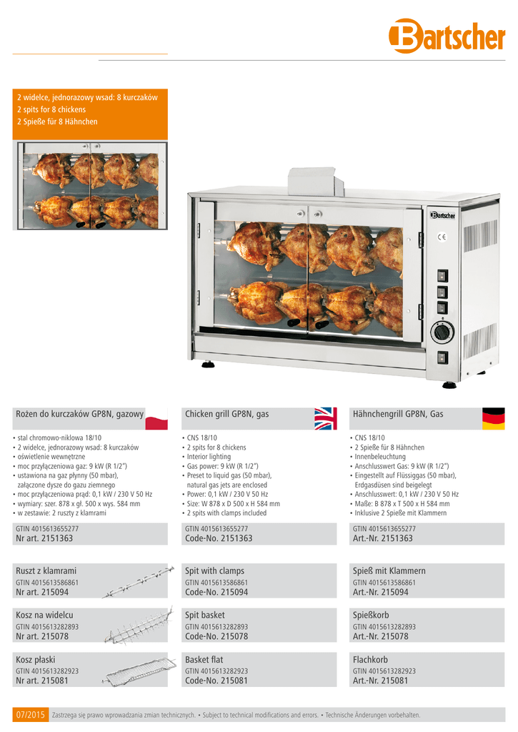 2 widelce, jednorazowy wsad: 8 kurczaków 2 spits for 8 chickens 2 Spieße für 8 Hähnchen Rożen do kurczaków GP8N, gazowy • stal chromowo-niklowa 18/10 • 2 widelce, jednorazowy wsad: 8 kurczaków • oświetlenie wewnętrzne • moc przyłączeniowa gaz: 9 kW (R 1/2“) • ustawiona na gaz płynny (50 mbar), załączone dysze do gazu ziemnego • moc przyłączeniowa prąd: 0,1 kW / 230 V 50 Hz • wymiary: szer. 878 x gł. 500 x wys. 584 mm • w zestawie: 2 ruszty z klamrami Chicken grill GP8N, gas • CNS 18/10 • 2 spits for 8 chickens • Interior lighting • Gas power: 9 kW (R 1/2“) • Preset to liquid gas (50 mbar), natural gas jets are enclosed • Power: 0,1 kW / 230 V 50 Hz • Size: W 878 x D 500 x H 584 mm • 2 spits with clamps included Hähnchengrill GP8N, Gas • CNS 18/10 • 2 Spieße für 8 Hähnchen • Innenbeleuchtung • Anschlusswert Gas: 9 kW (R 1/2“) • Eingestellt auf Flüssiggas (50 mbar), Erdgasdüsen sind beigelegt • Anschlusswert: 0,1 kW / 230 V 50 Hz • Maße: B 878 x T 500 x H 584 mm • Inklusive 2 Spieße mit Klammern GTIN 4015613655277 GTIN 4015613655277 GTIN 4015613655277 Ruszt z klamrami Spit with clamps Spieß mit Klammern GTIN 4015613586861 GTIN 4015613586861 GTIN 4015613586861 Kosz na widelcu Spit basket Spießkorb GTIN 4015613282893 GTIN 4015613282893 GTIN 4015613282893 Kosz płaski Basket flat Flachkorb GTIN 4015613282923 GTIN 4015613282923 GTIN 4015613282923 Nr art. 2151363 Nr art. 215094 Nr art. 215078 Nr art. 215081 07/2015 Code-No. 2151363 Code-No. 215094 Code-No. 215078 Code-No. 215081 Art.-Nr. 2151363 Art.-Nr. 215094 Art.-Nr. 215078 Art.-Nr. 215081 Zastrzega się prawo wprowadzania zmian technicznych. • Subject to technical modifications and errors. • Technische Änderungen vorbehalten.