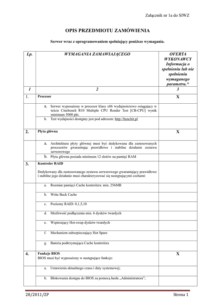 Załącznik nr 1a do SIWZ OPIS PRZEDMIOTU ZAMÓWIENIA Serwer wraz z oprogramowaniem spełniający poniższe wymagania. Lp. WYMAGANIA ZAMAWIAJĄCEGO 1 2 1. Procesor OFERTA WYKONAWCY Informacja o spełnieniu lub nie spełnieniu wymaganego parametru.* 3 X a. Serwer wyposażony w procesor klasy x86 wydajnościowo osiągający w teście Cinebench R10 Multiple CPU Render Test [CB-CPU] wynik minimum 5000 pkt. b. Test wydajności dostępny jest pod adresem: http://benchit.pl 2. Płyta główna X a. Architektura płyty głównej musi być dedykowana dla zastosowanych b. 3. procesorów gwarantując prawidłowe i stabilne działanie zestawu serwerowego Płyta główna posiada minimum 12 slotów na pamięć RAM Kontroler RAID Dedykowany dla zastosowanego zestawu serwerowego gwarantujący prawidłowe i stabilne jego działanie musi charakteryzować się następującymi cechami: a. Rozmiar pamięci Cache kontrolera: min. 256MB b. Write Back Cache c. Poziomy RAID: 0,1,5,10 d. Możliwość podłączenia min. 6 dysków twardych 4. e. Wspierający Hot-swap dysków twardych f. Mechanizm zabezpieczający Hot Spare g. Bateria podtrzymująca Cache kontrolera Funkcje BIOS BIOS musi być wyposażony w następujące funkcje: a. X Ustawienia aktualnego czasu i daty systemowej; b. Blokowania dostępu do BIOS za pomocą hasła „Administratora”; 28/2011/ZP Strona 1 Załącznik nr 1a do SIWZ c. Zatrzymanie zapisanego hasła w BIOS w przypadku jednoczesnego odłączenia wszystkich zewnętrznych źródeł zasilania; d. Ostrzegania przed przegrzaniem procesora; 5. e. Sterowania prędkością wentylatora systemu oraz wentylatora procesora; f. Monitoring temperatury systemowej; g. Ostrzegania o uszkodzonym wentylatorze procesora; h. Kontroli prędkości wentylatorów procesora; Pamięć RAM X a. Typ pamięci: DDR3 RDIMM; b. Pojemność i ilość pamięci: min. 4 x2048 MB. c. 6. Pamięć dedykowana dla zastosowanej płyty głównej gwarantująca prawidłowe i stabilne działanie zestawu serwerowego. Karta graficzna a. X Układ graficzny dedykowany dla zastosowanej architektury. b. Zamawiający dopuszcza kartę graficzną zintegrowaną z płytą główną. 7. Karta sieciowa Karta sieciowa Ethernet min. 100/1000 Mbit/s, RJ45 posiadająca następujące funkcje: a. Wbudowany w kartę sieciową TCP/IP Offload Engine (TOE), 8. b. iSCSI Ready Zamawiający dopuszcza karty sieciowe zintegrowane z płytą główną. Dysk twardy - ilość: 6szt. Spełniający następujące wymagania: a. Pojemność: 300GB na każdy z dysków 9. 10. b. Interfejs: SAS 6Gbps (Hot Plug) c. Rozmiar: 2.5” d. Prędkość obrotowa min: 10000 RPM e. Zaoferowane dyski muszą być identyczne. Kieszeń HDD - ilość: 6szt. Kieszeń (szyny) musi mieć możliwość podłączenia dysku twardego w czasie pracy serwera (hot swap). Napęd optyczny spełniający następujące wymagania: a. X Urządzenie wewnętrzne zamontowane i podłączone w obudowie zestawu serwerowego; b. Możliwość nagrywania płyt : CD-R,CD-RW, DVD-/+R, DVD-/+RW; 11. Obudowa - spełniająca następujące wymagania: a. X Możliwość montażu kieszeni do 6 dysków twardych 2.5” bez otwierania obudowy b. Obudowa typu RACK o rozmiarze maksymalnie 1U z szynami do wysuwania; 28/2011/ZP Strona 2 Załącznik nr 1a do SIWZ c. Organizer kabli podłączonych do serwera zamocowany na obudowie. d. Od frontu obudowy zamontowany jest panel informujący o stanie w e. f. 12. 13. jakim się serwer w danej chwili znajduje za pomocą diod lub ekranu lcd, minimum informacje tj. serwer pracuje poprawnie, wystąpił problem z podzespołem serwera wskazując na prawdopodobne uszkodzenie konkretnego elementu. Posiada osłonę przednią zdejmowaną, zamykaną na kluczyk, zabezpieczającą przed wyjęciem dysków twardych z obudowy. Na przednim panelu obudowy są minimum dwa porty USB. Zasilacz Dwa wewnętrzne zasilacze pracujące redundantnie spełniające wymogi: a. Uszkodzenie jednego z dwóch zasilaczy nie spowoduje wyłączenia serwera b. Wymiana zasilacza (Hot Swap) może odbywać się przy włączonym serwerze nie mając wpływu na jego stabilne działanie. c. Gwarantujący prawidłowe i stabilne działanie serwera przy pełnych długotrwałych obciążeniach, z zapasem mocy umożliwiającym wyposażenie obudowy w maksimum dodatkowych urządzeń. System operacyjny Microsoft Windows Server Enterprise 2003 R2 PL (32-bit) MOLP w wersji odpowiedniej dla zaoferowanego procesora. Dopuszcza się rozwiązania równoważne spełniające poniższe wymagania: a. Zaoferowany system operacyjny będzie poprawnie współpracował z używanym przez Zamawiającego oprogramowaniem YSoft SafeQ Cluster (bez wykorzystania mechanizmów wirtualizacji), b. Zaoferowany system operacyjny będzie mógł być wykorzystywany (bez konieczności wykonywania jakichkolwiek modyfikacji) w niejawnych sieciach informatycznych akredytowanych zgodnie z wymogami ustawy z 5 sierpnia 2010 r. o Ochronie Informacji Niejawnych do przetwarzania informacji niejawnych o klauzuli „POUFNE”; c. Wykonawca zobowiązany jest do złożenia w tym zakresie stosownego oświadczenia; d. Zapewnienie kompatybilności w zakresie współdziałania w ramach jednej niejawnej sieci informatycznej z systemem operacyjnym Windows XP Professional PL oraz Windows Server 2003. e. W przypadku zaoferowania rozwiązania równoważnego do systemu 14. operacyjnego Windows Server 2003 i wystąpienia konieczności wykonania powtórnej akredytacji systemu informatycznego z przyczyn wynikających z zastosowania innego systemu operacyjnego niż używany przez Zamawiającego, (tj. systemu operacyjnego Windows Server 2003) Wykonawca zobowiązany będzie do pokrycia kosztów wykonania przedmiotowej akredytacji oraz wszelkich czynności z tym procesem związanych (np. oceny ryzyka, audytu systemu, itp.). f. Zamawiający dopuszcza system operacyjny taki jak MS Windows 2008 Server Enterprise gwarantujący w ramach dostarczonej licencji prawo obniżenia wersji (downgrade) do Microsoft Wi