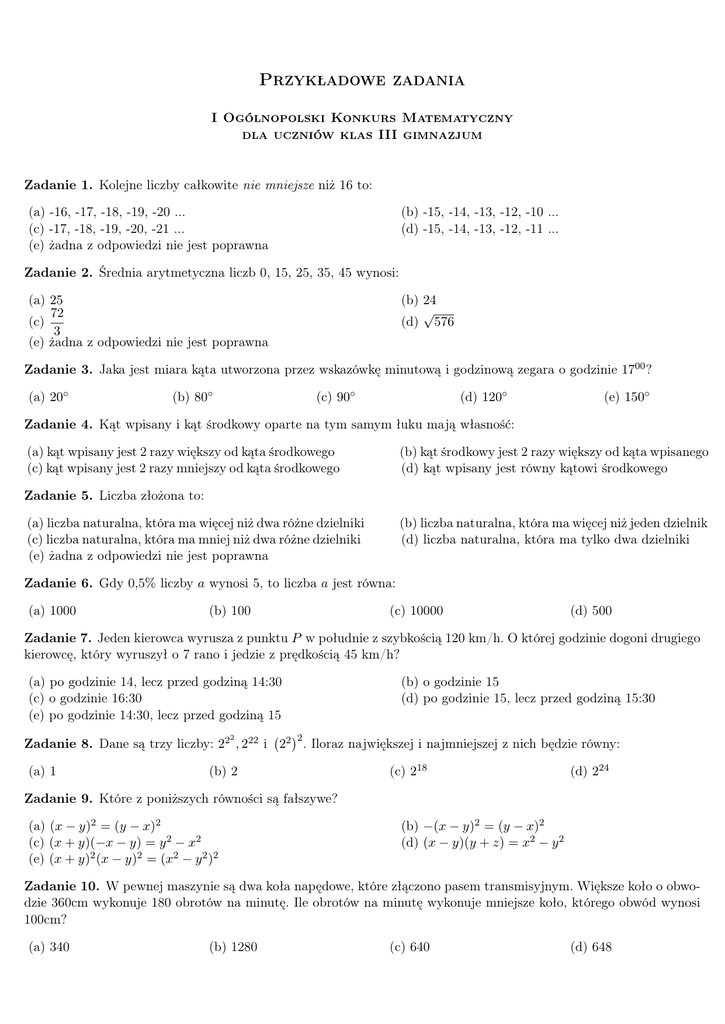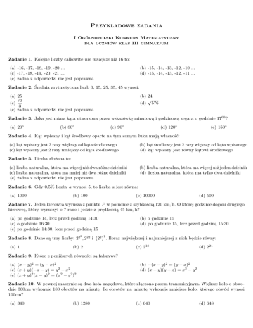 Przykładowe zadania I Ogólnopolski Konkurs Matematyczny dla uczniów klas III gimnazjum Zadanie 1. Kolejne liczby całkowite nie mniejsze niż 16 to: (a) -16, -17, -18, -19, -20 ... (c) -17, -18, -19, -20, -21 ... (e) żadna z odpowiedzi nie jest poprawna (b) -15, -14, -13, -12, -10 ... (d) -15, -14, -13, -12, -11 ... Zadanie 2. Średnia arytmetyczna liczb 0, 15, 25, 35, 45 wynosi: (a) 25 72 (c) 3 (e) żadna z odpowiedzi nie jest poprawna (b) 24 √ (d) 576 Zadanie 3. Jaka jest miara kąta utworzona przez wskazówkę minutową i godzinową zegara o godzinie 1700 ? (a) 20◦ (b) 80◦ (c) 90◦ (d) 120◦ (e) 150◦ Zadanie 4. Kąt wpisany i kąt środkowy oparte na tym samym łuku mają własność: (a) kąt wpisany jest 2 razy większy od kąta środkowego (c) kąt wpisany jest 2 razy mniejszy od kąta środkowego (b) kąt środkowy jest 2 razy większy od kąta wpisanego (d) kąt wpisany jest równy kątowi środkowego Zadanie 5. Liczba złożona to: (a) liczba naturalna, która ma więcej niż dwa różne dzielniki (c) liczba naturalna, która ma mniej niż dwa różne dzielniki (e) żadna z odpowiedzi nie jest poprawna (b) liczba naturalna, która ma więcej niż jeden dzielnik (d) liczba naturalna, która ma tylko dwa dzielniki Zadanie 6. Gdy 0,5% liczby a wynosi 5, to liczba a jest równa: (a) 1000 (b) 100 (c) 10000 (d) 500 Zadanie 7. Jeden kierowca wyrusza z punktu P w południe z szybkością 120 km/h. O której godzinie dogoni drugiego kierowcę, który wyruszył o 7 rano i jedzie z prędkością 45 km/h? (a) po godzinie 14, lecz przed godziną 14:30 (c) o godzinie 16:30 (e) po godzinie 14:30, lecz przed godziną 15 2 (b) o godzinie 15 (d) po godzinie 15, lecz przed godziną 15:30 2 Zadanie 8. Dane są trzy liczby: 22 , 222 i 22 . Iloraz największej i najmniejszej z nich będzie równy: (a) 1 (b) 2 (c) 218 (d) 224 Zadanie 9. Które z poniższych równości są fałszywe? (a) (x − y)2 = (y − x)2 (c) (x + y)(−x − y) = y 2 − x2 (e) (x + y)2 (x − y)2 = (x2 − y 2 )2 (b) −(x − y)2 = (y − x)2 (d) (x − y)(y + z) = x2 − y 2 Zadanie 10. W pewnej maszynie są dwa koła napędowe, które złączono pasem transmisyjnym. Większe koło o obwodzie 360cm wykonuje 180 obrotów na minutę. Ile obrotów na minutę wykonuje mniejsze koło, którego obwód wynosi 100cm? (a) 340 (b) 1280 (c) 640 (d) 648