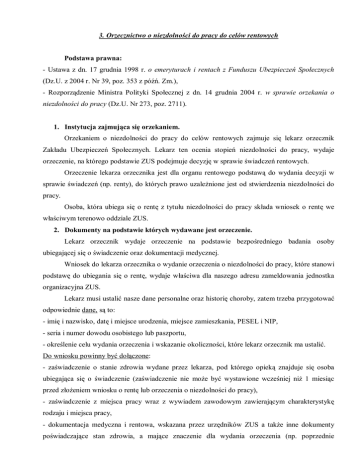 3. Orzecznictwo o niezdolności do pracy do celów rentowych Podstawa prawna: - Ustawa z dn. 17 grudnia 1998 r. o emeryturach i rentach z Funduszu Ubezpieczeń Społecznych (Dz.U. z 2004 r. Nr 39, poz. 353 z późń. Zm.), - Rozporządzenie Ministra Polityki Społecznej z dn. 14 grudnia 2004 r. w sprawie orzekania o niezdolności do pracy (Dz.U. Nr 273, poz. 2711). 1. Instytucja zajmująca się orzekaniem. Orzekaniem o niezdolności do pracy do celów rentowych zajmuje się lekarz orzecznik Zakładu Ubezpieczeń Społecznych. Lekarz ten ocenia stopień niezdolności do pracy, wydaje orzeczenie, na którego podstawie ZUS podejmuje decyzję w sprawie świadczeń rentowych. Orzeczenie lekarza orzecznika jest dla organu rentowego podstawą do wydania decyzji w sprawie świadczeń (np. renty), do których prawo uzależnione jest od stwierdzenia niezdolności do pracy. Osoba, która ubiega się o rentę z tytułu niezdolności do pracy składa wniosek o rentę we właściwym terenowo oddziale ZUS. 2. Dokumenty na podstawie których wydawane jest orzeczenie. Lekarz orzecznik wydaje orzeczenie na podstawie bezpośredniego badania osoby ubiegającej się o świadczenie oraz dokumentacji medycznej. Wniosek do lekarza orzecznika o wydanie orzeczenia o niezdolności do pracy, które stanowi podstawę do ubiegania się o rentę, wydaje właściwa dla naszego adresu zameldowania jednostka organizacyjna ZUS. Lekarz musi ustalić nasze dane personalne oraz historię choroby, zatem trzeba przygotować odpowiednie dane, są to: - imię i nazwisko, datę i miejsce urodzenia, miejsce zamieszkania, PESEL i NIP, - seria i numer dowodu osobistego lub paszportu, - określenie celu wydania orzeczenia i wskazanie okoliczności, które lekarz orzecznik ma ustalić. Do wniosku powinny być dołączone: - zaświadczenie o stanie zdrowia wydane przez lekarza, pod którego opieką znajduje się osoba ubiegająca się o świadczenie (zaświadczenie nie może być wystawione wcześniej niż 1 miesiąc przed złożeniem wniosku o rentę lub orzeczenia o niezdolności do pracy), - zaświadczenie z miejsca pracy wraz z wywiadem zawodowym zawierającym charakterystykę rodzaju i miejsca pracy, - dokumentacja medyczna i rentowa, wskazana przez urzędników ZUS a także inne dokumenty poświadczające stan zdrowia, a mające znaczenie dla wydania orzeczenia (np. poprzednie orzeczenie, zaświadczenie ze szpitala, karta badania profilaktycznego, dokumentacja rehabilitacji leczniczej lub zawodowe). Jeżeli w/w dokumentacja jest wystarczająca do wydania orzeczenia lekarz orzecznik może wydać orzeczenie tylko na tej podstawie, bez przeprowadzenia badania. Przed wydaniem orzeczenia lekarz orzecznik może zlecić uzupełnienie dokumentacji, w szczególności o opinie lekarza konsultanta lub psychologa albo o wyniki badań dodatkowych lub obserwacji szpitalnej. 3. Treść orzeczeń lekarza orzecznika ZUS. Lekarz orzecznik wydaje orzeczenie o niezdolności do pracy. Oznacza to, że odpowiednio do: stanu zdrowia, sprawności organizmu, wieku, zawodu, wykonywanej pracy, możliwości dalszego wykonywania pracy zarobkowej oraz o możliwości przywrócenia zdolności do pracy przez leczenie, rehabilitację lub przekwalifikowanie zawodowe, kwalifikuje osobę jako: - całkowicie niezdolna do pracy oraz samodzielnej egzystencji, niezdolność do samodzielnej egzystencji orzekana jest, jeżeli stopień naruszenia sprawności organizmu powoduje konieczność stałej lub długotrwałej opieki i pomocy innej osoby w zaspokajaniu podstawowych potrzeb życiowych, - całkowicie niezdolna do pracy, to osoba, która (zgodnie z Ustawą o emeryturach i rentach z FUS, Dz.U. 04.39.353 z późn. zm.) utraciła zdolność do wykonywania jakiejkolwiek pracy; - częściowo niezdolną do pracy, czyli osoba, która w znacznym stopniu utraciła zdolność do pracy, zgodnej z poziomem posiadanych kwalifikacji. 4. Okres, na jaki jest wydane orzeczenie o niezdolności do pracy. Lekarz orzecznik przy ocenie stopnia i trwałości niezdolności do pracy a także rokowania, co do odzyskania zdolności do pracy, bierze pod uwagę: - stopień naruszenia sprawności organizmu oraz możliwości przywrócenia sprawności w wyniku leczenia i rehabilitacji, - możliwość wykonywania dotychczasowej lub podjęcia innej pracy oraz celowości przekwalifikowania zawodowego, biorąc pod uwagę m.in. dotychczas wykonywana pracę, wykształcenie, wiek. W związku z tym lekarz orzecznik może orzec: - okresową niezdolność do pracy, jeżeli według wiedzy medycznej istnieje możliwość odzyskania zdolności do pracy, - trwałą niezdolność do pracy, jeżeli według wiedzy medycznej nie ma rokowań odzyskania zdolności do pracy. UWAGA: Od 1 stycznia 2005 roku niezdolność do pracy orzekana jest tylko okresowo. 5. Odwołanie od decyzji lekarza orzecznika. Jeżeli nie zgadzamy się z orzeczeniem lekarza orzecznika ZUS możemy wnieść sprzeciw do komisji lekarskiej ZUS. Sprzeciw zgłaszamy za pośrednictwem właściwej jednostki organizacyjnej ZUS, do której zgłosiliśmy się, chcąc uzyskać takie orzeczenie. Termin zgłoszenia takiego sprzeciwu to maksymalnie 14 dni od dnia otrzymania (doręczenia) orzeczenia. Na zapoznanie się ze sprawą, wydanie opinii i zawiadomienie o tym samego zainteresowanego komisja ma 14 dni. Komisja lekarska nie rozpatruje sprzeciwu wniesionego po terminie. W uzasadnionych przypadkach Zakład na wniosek osoby zainteresowanej, może przywrócić termin na wniesienie sprzeciwu, np. w przypadku, gdy przekroczenie terminu nastąpiło z przyczyn niezależnych od osoby zainteresowanej. Od decyzji ZUS w sprawie renty można odwołać się do Sądu Pracy i Ubezpieczeń Społecznych, właściwego dla okręgu, w którym ma siedzibę oddział ZUS wydający zaskarżaną decyzję. Należy jednak pamiętać, że odwołanie do sądu nie będzie skuteczne, jeśli w pierwszej kolejności nie skorzystamy z drogi odwoławczej ZUS (nie zgłosimy sprzeciwu do komisj