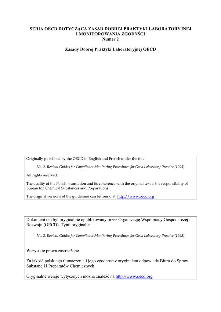 SERIA OECD DOTYCZĄCA ZASAD DOBREJ PRAKTYKI LABORATORYJNEJ I MONITOROWANIA ZGODNŚCI Numer 2 Zasady Dobrej Praktyki Laboratoryjnej OECD Originally published by the OECD in English and French under the title: No. 2, Revised Guides for Compliance Monitoring Procedures for Good Laboratory Practice (1995) All rights reserved. The quality of the Polish translation and its coherence with the original text is the responsibility of Bureau for Chemical Substances and Preparations. The original versions of the guidelines can be found at: http://www.oecd.org Dokument ten był oryginalnie opublikowany przez Organizację Współpracy Gospodarczej i Rozwoju (OECD). Tytuł oryginału: No. 2, Revised Guides for Compliance Monitoring Procedures for Good Laboratory Practice (1995) Wszystkie prawa zastrzeżone Za jakość polskiego tłumaczenia i jego zgodność z oryginałem odpowiada Biuro do Spraw Substancji i Preparatów Chemicznych. Oryginalne wersje wytycznych można znaleźć na http://www.oecd.org OECD/GD(95)66 OECD/GD(95)66 SERIA OECD DOTYCZĄCA ZASAD DOBREJ PRAKTYKI LABORATORYJNEJ I MONITOROWANIA ZGODNOŚCI Numer 2 (Zrewidowany) WYTYCZNE DLA JEDNOSTEK DS. MONITOROWANIA ZGODNOŚCI Z ZASADAMI DOBREJ PRAKTYKI LABORATORYJNEJ ZREWIDOWANE WYTYCZNE DO PROCEDUR MONITOROWANIA ZGODNOŚCI Z ZASADAMI DOBREJ PRAKTYKI LABORATORYJNEJ MONOGRAFIA ŚRODOWISKOWA NR 110 ORGANIZACJA WSPÓŁPRACY GOSPODARCZEJ I ROZWOJU Paryż 1995 1 OECD/GD(95)66 SERIA OECD DOTYCZĄCA ZASAD DOBREJ PRAKTYKI LABORATORYJNEJ I MONITOROWANIA ZGODNOŚCI Numer 2 (Zrewidowany) Wytyczne dla Jednostek ds. Monitorowania Zgodności z Zasadami Dobrej Praktyki Laboratoryjnej ZREWIDOWANE WYTYCZNE DO PROCEDUR MONITOROWANIA ZGODNOŚCI Z ZASADAMI DOBREJ PRAKTYKI LABORATORYJNEJ MONOGRAFIA ŚRODOWISKOWA NR 110 Dyrektoriat ds. Środowiska ORGANIZACJA WSPÓŁPRACY GOSPODARCZEJ I ROZWOJU Paryż 1995 2 OECD/GD(95)66 WPROWADZENIE Decyzja Rady z roku 1981 w sprawie Wzajemnego Uznawania Danych [C(81)30(Final)], której Zasady Dobrej Praktyki Laboratoryjnej OECD1 stanowią integralną część, zawiera instrukcje OECD do podejmowania działań "w celu umożliwienia zharmonizowanego w skali międzynarodowej podejścia do zapewnienia zgodności" z Zasadami Dobrej Praktyki Laboratoryjnej. W konsekwencji, w celu promowania implementacji porównywalnych procedur monitorowania zgodności, oraz międzynarodowej akceptacji wśród krajów członkowskich, Rada przyjęła w 1983 r. Zalecenie w sprawie Wzajemnego Uznawania Zgodności z Zasadami Dobrej Praktyki Laboratoryjnej [C(83)95(Final)], które ustala podstawowe cechy procedur monitorowania zgodności. Grupa Robocza ds. Wzajemnego Uznawania Zgodności z Zasadami DPL została powołana w roku 1985 pod przewodnictwem Profesora V. Silano (Włochy) celem ułatwienia praktycznej implementacji wydanych przez Radę aktów prawnych odnośnie do Dobrej Praktyki Laboratoryjnej, wypracowania wspólnego podejścia do zagadnień natury technicznej i administracyjnej związanych z zapewnieniem zgodności z zasadami DPL i jej monitorowaniem, oraz podjęcia kroków zmierzających do wzajemnego uznawania procedur monitorowania zgodności. Następujące kraje i organizacje uczestniczyły w pracach Grupy Roboczej: Australia, Belgia, Dania, Finlandia, Francja, Hiszpania, Holandia, Japonia, Kanada, Norwegia, Portugalia, Republika Federalna Niemiec, Stany Zjednoczone, Szwajcaria, Szwecja, Włochy, Zjednoczone Królestwo, Komisja Wspólnoty Europejskiej, Międzynarodowa Organizacja ds. Standaryzacji, Konwencja Inspekcji Farmaceutycznej, oraz Światowa Organizacja Zdrowia. Grupa Robocza opracowała, między innymi, Wytyczne do Procedur Monitorowania Zgodności z Zasadami Dobrej Praktyki Laboratoryjnej, które dotyczą wymagań w odniesieniu do administracji, personelu i programów monitorowania zgodności z zasadami Dobrej Praktyki Laboratoryjnej. Wytyczne te zostały opublikowane po raz pierwszy w 1988 r. w Raporcie Końcowym Grupy Roboczej.2 Wersja nieco skrócona została zamieszczona w postaci Załącznika do DecyzjiZalecenia Rady z 1989 r. o Zgodności z Zasadami Dobrej Praktyki Laboratoryjnej [C(89)87(Final)], która uchyla i zastępuje Uchwałę Rady z roku 1983. Przyjmując tę Decyzję-Zalecenie, Rada w Części III.1 poleciła Komitetowi ds. Środowiska i Komitetowi Zarządzającemu Specjalnego Programu ds. Kontroli Substancji Chemicznych zapewnienie, aby "Wytyczne do Procedur Monitorowania Zgodności z Zasadami Dobrej Praktyki Laboratoryjnej" oraz "Wytyczne do Przeprowadzania Inspekcji Laboratoriów i Rewizji Badań" ustanowione w Załącznikach I i II tamże, były aktualizowane i rozszerzane, w razie konieczności, zgodnie z rozwojem i doświadczeniem krajów członkowskich, a także właściwymi pracami innych organizacji międzynarodowych. 1 Patrz Zasady Dobrej Praktyki Laboratoryjnej OECD, Nr 1 w tej serii OECD poświęconej Zasadom Dobrej Praktyki Laboratoryjnej i Monitorowaniu Zgodności 2 Raport Końcowy Grupy Roboczej ds. Wzajemnego Uznawania Zgodności z Zasadami Dobrej Praktyki Laboratoryjnej, Monografia Środowiskowa OECD Nr 15, marzec 1988. 3 OECD/GD(95)66 Zespół OECD ds. Dobrej Praktyki Laboratoryjnej opracował propozycje poprawek do tych Załączników, jak również do Załącznika III, który zawiera "Wytyczne do Wymiany Informacji Dotyczących Krajowych Programów Monitorowania Zgodności z Zasadami Dobrej Praktyki Laboratoryjnej", i który został znowelizowany zasadniczo w celu zamieszczenia w nim dodatku "Wytyczne dla Jednostek ds. Monitorowania z Zasadami Dobrej Praktyki Laboratoryjnej w Sprawie Przygotowania Corocznego Sprawozdania z Kontroli Jednostek Badawczych". Te zrewidowane Załączniki zostały przyjęte przez Radę w Decyzji "Nowelizacja Załączników do Decyzji-Zalecenia Rady o Zgodności z Zasadami Dobrej Praktyki Laboratoryjnej z dnia 9 marca 1995 roku. [C(95)8(Final)]. Część I niniejszej publikacji składa się ze Zrewidowanych Wytycznych do Procedur Monitorowania Zgodności z Zasadami Dob
