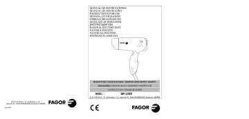 MANUAL DE INSTRUCCIONES MANUAL DE INSTRUÇÕES INSTRUCTIONS FOR USE MANUEL D’UTILISATION GEBRAUCHSANWEISUNG MANUALE DI ISTRUZIONI ENTY¶√ √¢∏°πøN HASZNÁLATI ÚTMUTATÓ NÁVOD K POUŽITÍ NÁVOD NA POUŽITIE INSTRUKCJA OBSŁUGI SECADOR DE PELO / SECADOR DE CABELO / HAIRDRYER / SÈCHE-CHEVEUX / HAARFÖN / ASCIUGACAPELLI / ΠΙΣΤΟΛΑΚΙ ΜΑΛΛΙΩΝ / HAJSZÁRÍTÓ / VYSOUŠEČ VLASŮ / VYSUŠOVAČ VLASOV / SUSZARKA DO WŁOSÓW MOD.: SP-1200 N.I.F. F-20.020.517 - Bº. San Andrés, nº 18 • Apartado 49 - 20500 MONDRAGON (Guipúzcoa) ESPAÑA N.I.F. F-20.020.517 - Bº. San Andrés, nº 18 • Apartado 49 - 20500 MONDRAGON (Guipúzcoa) ESPAÑA Julio 2003 E prolongaciones que sean conformes a las normas de seguridad vigentes, prestando atención a no superar el limite de potencia indicado en el adaptador. • Este aparato debe utilizarse sólo para uso doméstico. Cualquier otro uso se considerará inadecuado o peligroso. • En caso de avería y/o mal funcionamiento del aparato, apagarlo y no tratar de arreglarlo. En caso de necesitar reparación dirigirse únicamente a un Servicio de Asistencia Técnica autorizado por el fabricante y solicitar el uso de recambios originales. De no respetar lo anteriormente indicado se pondrá en peligro la seguridad del aparato. • El usuario no debe proceder a la sustitución del cable. En caso de que esté estropeado o haya que sustituirlo, dirigirse exclusivamente a un Servicio de Asistencia Técnica autorizado por el fabricante. • Si se decide no utilizar nunca más el aparato, corte el cable de alimentación después de desenchufarlo. • El fabricante no será responsable de daños que puedan derivar del uso inapropiado equivocado o poco adecuado o bien de reparaciones efectuadas por personal no cualificado. El uso de cualquier aparato eléctrico requiere que se respeten algunas reglas fundamentales. 1. DESCRIPCIÓN (Fig. 1) A. B. C. D. Secador Interruptor marcha-paro Concentrador de aire Selector de tensión 2. CARACTERÍSTICAS TÉCNICAS Tensión - Frecuencia: 120V/230V~ 50/60 Hz Potencia: 1200W 3. ADVERTENCIAS DE SEGURIDAD IMPORTANTES • • • • • • Antes de utilizar este aparato por primera vez, lea detenidamente este manual de instrucciones y guárdelo para posteriores consultas. Solo así podrá obtener los mejores resultados y la máxima seguridad de uso. Antes de utilizar el aparato verificar que la tensión de la red doméstica corresponda con la indicada en el aparato. En caso de incompatibilidad entre la toma de corriente y el enchufe del aparato, sustituir la toma por otra adecuada sirviéndose de personal profesionalmente cualificado. Después de quitar el embalaje, verificar que el aparato esté en perfectas condiciones, en caso de duda, dirigirse al Servicio de Asistencia Técnica más cercano. Los elementos del embalaje(Bolsas de plástico, espuma de poliestireno, etc.), no deben dejarse al alcance de los niños porque son potenciales fuentes de peligro Se desaconseja el uso de adaptadores, tomas múltiples y/o prolongaciones. En caso de que fuera indispensable usarlos, hay que utilizar únicamente adaptadores simples o múltiples y EN ESPECIAL • No utilice el aparato con las manos mojadas o húmedas. • No utilice el aparato descalzo o con los pies mojados • No utilice el secador teniendo el cuerpo mojado; séquese antes de utilizarlo. • No sumerja el aparato ni el cable en agua, ni permita que se humedezca por salpicaduras de agua. 1 PRZEDE WSZYSTKIM • Nie wolno dotykać urządzenia mokrymi lub wilgotnymi rękami. • Nie wolno używać urządzenia mając bose albo wilgotne lub mokre stopy. • Nie wolno używać urządzenia, gdy nasze ciało jest mokre. Przed użyciem suszarki należy się osuszyć. • Nie wolno nigdy zanurzać urządzenia w wodzie ani pozwolić, by się zamoczyło. • Nie wolno używać urządzenia podczas kąpieli w wannie ani pod prysznicem, w pomieszczeniach wilgotnych ani w pobliżu cieczy (np. nad umywalką lub wanną pełną wody). • Dla większego bezpieczeństwa zalecamy zamontowanie w instalacji elektrycznej łazienki bezpiecznika różnicowo-prądowego z maksymalnym prądem upływu 30 mA. W kwestii szczegółów należy się skontaktować z elektrykiem. • Wyłączając urządzenie z sieci nie należy ciągnąć za kabel. • Nie należy wystawiać urządzenia na działanie czynników pogodowych (deszcz, słońce, mróz, itp. ). • Nie należy pozwalać na obsługę urządzenia bez nadzoru dzieciom i osobom niepełnosprawnym umysłowo. • Nie należy bez potrzeby pozostawiać urządzenia włączonego, ponieważ może to stanowić zagrożenie dla zdrowia. Kiedy urządzenie nie pracuje, należy je wyłączyć z sieci. • Wlot i wylot powietrza musi być zawsze czysty i drożny. Jeśli wlot lub wylot powietrza zostanie zablokowany, urządzenie wyłączy się automatycznie. Należy je wówczas zostawić na parę minut, aż ostygnie, następnie odblokować wlot/wylot powietrza i kontynuować używanie urządzenia. • Przed przystąpieniem do czyszczenia lub konserwacji urządzenia należy zawsze wyłączyć urządzenie z sieci. 4. PRACA Włącznik/ wyłącznik 0 = Wyłączony 1 = Delikatny strumień powietrza /ciepłe powietrze 2 = Mocny strumień powietrza /gorące powietrze Uwaga: TTen model posiada dwa ustawienia napięcia: 120V~ i 230V~. Przed włączeniem urządzenia należy sprawdzić, czy wybrane ustawienie napięcia odpowiada napięciu w sieci. Zaniedbanie tej czynności może spowodować nieodwracalne uszkodzenie urządzenia. 5. CZYSZCZENIE I KONSERWACJA Zewnętrzną powierzchnię urządzenia należy czyścić suchą szmatką Kratki wlotu i wylotu powietrza nie mogą być nigdy zablokowane. Należy je czyścić suchą szczotką usuwając nagromadzone włosy i brud. Nie wolno zanurzać urządzenia w wodzie ani innej cieczy. Producent zastrzega sobie prawo do modyfikowania modeli opisanych w niniejszej instrukcji obsługi. 22 interior.qxd 9/9/03 17:06 Pág