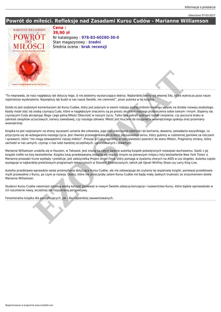Informacje o produkcie Utworzono 07-03-2017 Powrót do miłości. Refleksje nad Zasadami Kursu Cudów - Marianne Williamson Cena : 39,90 zł IA T Nr katalogowy : 978-83-60280-30-0 Stan magazynowy : średni Średnia ocena : brak recenzji "To nieprawda, że nasz najgłębszy lęk dotyczy tego, iż nie jesteśmy wystarczająco dobrzy. Najbardziej boimy się własnej Siły, która wykracza poza nasze najśmielsze wyobrażenia. Największy lęk budzi w nas nasze Światło, nie ciemność", pisze autorka w tej książce. ŚW Dzieło to jest osobistym komentarzem do Kursu Cudów, który jest jedynym w swoim rodzaju podręcznikiem treningu umysłu na drodze rozwoju osobistego. Każdy może stać się osobą czyniącą Cuda, które w najgłębszym znaczeniu są po prostu skutkiem naszego przebaczenia sobie samym i innym. Stajemy się czyniącymi Cuda akceptując Boga i jego pełną Miłości Obecność w naszym życiu. Tylko Ona potrafi uzdrowić każde cierpienie, czy poczucie braku w zakresie związków uczuciowych, kariery zawodowej, czy naszego zdrowia. Miłość jest kluczem do osiągnięcia wewnętrznego spokoju oraz przemiany wewnętrznej. Książka ta jest rozpisanymi na strony wyrazami uznania dla człowieka, jego nieograniczonej zdolności do kochania, dawania, posiadania wszystkiego, co przyczynia się do wzbogacenia naszego życia. Jest również przewodnikiem po ścieżce poszukiwania sensu, który gubimy w codziennej gonitwie za rzeczami i sprawami, które "nie mogą odwzajemnić naszej miłości". Prosząc o Cud pragniemy w rzeczywistości powrócić do stanu Miłości. Pragniemy zmiany, która zachodzi w nas samych, czyniąc z nas ludzi bardziej szczęśliwych, ugruntowanych i otwartych. Marianne Williamson urodziła się w Houston, w Teksasie. Jest znaną na całym świecie autorką książek poświęconych rozwojowi duchowemu. Sześć z jej książek trafiło na listy bestsellerów. Książka tutaj przedstawiana znalazła się między innymi na pierwszym miejscu listy bestsellerów New York Times`a. Marianne prowadzi liczne wykłady i prelekcje, jest założycielką Project Angel Food, który pomaga w żywieniu chorych na AIDS w Los Angeles. Autorka często występuje w najbardziej prestiżowych programach telewizyjnych w Stanach Zjednoczonych, takich jak Oprah Winfrey Show czy Larry King Live. EZ O Autorka przedstawia wprawdzie swoje przemyślenia dotyczące Kursu Cudów, ale nie zobowiązuje do czytania tej wspanialej książki, ponieważ przedstawia myśli przewodnie z Kursu, po czym je rozwija. Osoby, które nie przeczytały zatem Kursu Cudów nie będą miały żadnych trudności ze zrozumieniem dzieła Marianne Williamson. Studenci Kursu Cudów natomiast odniosą wielką korzyść ponieważ w nowym Świetle zobaczą koncepcje i nazewnictwo Kursu, które będzie wprowadzało w ich rozumienie nową, wcześniej nie rozpoznaną perspektywę. Fenomenalna książka dla początkujących, jak i dla najbardziej zaawansowanych. Wygenerowano w programie www.oscGold.com
