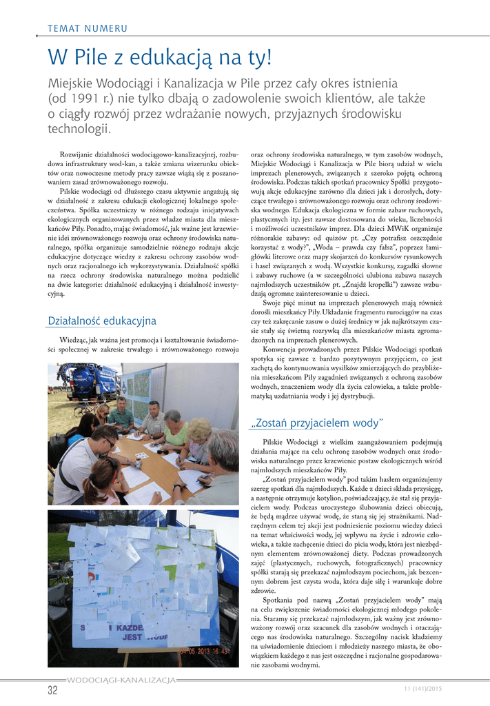 t emat numeru W Pile z edukacją na ty! Miejskie Wodociągi i Kanalizacja w Pile przez cały okres istnienia (od 1991 r.) nie tylko dbają o zadowolenie swoich klientów, ale także o ciągły rozwój przez wdrażanie nowych, przyjaznych środowisku technologii. Rozwijanie działalności wodociągowo-kanalizacyjnej, rozbudowa infrastruktury wod-kan, a także zmiana wizerunku obiektów oraz nowoczesne metody pracy zawsze wiążą się z poszanowaniem zasad zrównoważonego rozwoju. Pilskie wodociągi od dłuższego czasu aktywnie angażują się w działalność z zakresu edukacji ekologicznej lokalnego społeczeństwa. Spółka uczestniczy w różnego rodzaju inicjatywach ekologicznych organizowanych przez władze miasta dla mieszkańców Piły. Ponadto, mając świadomość, jak ważne jest krzewienie idei zrównoważonego rozwoju oraz ochrony środowiska naturalnego, spółka organizuje samodzielnie różnego rodzaju akcje edukacyjne dotyczące wiedzy z zakresu ochrony zasobów wodnych oraz racjonalnego ich wykorzystywania. Działalność spółki na rzecz ochrony środowiska naturalnego można podzielić na dwie kategorie: działalność edukacyjną i działalność inwestycyjną. Działalność edukacyjna Wiedząc, jak ważna jest promocja i kształtowanie świadomości społecznej w zakresie trwałego i zrównoważonego rozwoju oraz ochrony środowiska naturalnego, w tym zasobów wodnych, Miejskie Wodociągi i Kanalizacja w Pile biorą udział w wielu imprezach plenerowych, związanych z szeroko pojętą ochroną środowiska. Podczas takich spotkań pracownicy Spółki przygotowują akcje edukacyjne zarówno dla dzieci jak i dorosłych, dotyczące trwałego i zrównoważonego rozwoju oraz ochrony środowiska wodnego. Edukacja ekologiczna w formie zabaw ruchowych, plastycznych itp. jest zawsze dostosowana do wieku, liczebności i możliwości uczestników imprez. Dla dzieci MWiK organizuje różnorakie zabawy: od quizów pt. „Czy potrafisz oszczędnie korzystać z wody?”, „Woda – prawda czy fałsz”, poprzez łamigłówki literowe oraz mapy skojarzeń do konkursów rysunkowych i haseł związanych z wodą. Wszystkie konkursy, zagadki słowne i zabawy ruchowe (a w szczególności ulubiona zabawa naszych najmłodszych uczestników pt. „Znajdź kropelki”) zawsze wzbudzają ogromne zainteresowanie u dzieci. Swoje pięć minut na imprezach plenerowych mają również dorośli mieszkańcy Piły. Układanie fragmentu rurociągów na czas czy też zakręcanie zasuw o dużej średnicy w jak najkrótszym czasie stały się świetną rozrywką dla mieszkańców miasta zgromadzonych na imprezach plenerowych. Konwencja prowadzonych przez Pilskie Wodociągi spotkań spotyka się zawsze z bardzo pozytywnym przyjęciem, co jest zachętą do kontynuowania wysiłków zmierzających do przybliżenia mieszkańcom Piły zagadnień związanych z ochroną zasobów wodnych, znaczeniem wody dla ż ycia człowieka, a także problematyką uzdatniania wody i jej dystrybucji. „Zostań przyjacielem wody” Pilskie Wodociągi z wielkim zaangażowaniem podejmują działania mające na celu ochronę zasobów wodnych oraz środowiska naturalnego przez krzewienie postaw ekologicznych wśród najmłodszych mieszkańców Piły. „Zostań przyjacielem wody” pod takim hasłem organizujemy szereg spotkań dla najmłodszych. Każde z dzieci składa przysięgę, a następnie otrzymuje kotylion, poświadczający, że stał się przyjacielem wody. Podczas uroczystego ślubowania dzieci obiecują, że będą mądrze używać wodę, że staną się jej strażnikami. Nadrzędnym celem tej akcji jest podniesienie poziomu wiedzy dzieci na temat właściwości wody, jej wpływu na ż ycie i zdrowie człowieka, a także zachęcenie dzieci do picia wody, która jest niezbędnym elementem zrównoważonej diety. Podczas prowadzonych zajęć (plastycznych, ruchowych, fotograficznych) pracownicy spółki starają się przekazać najmłodszym pociechom, jak bezcennym dobrem jest czysta woda, która daje siłę i warunkuje dobre zdrowie. Spotkania pod nazwą „Zostań przyjacielem wody” mają na celu zwiększenie świadomości ekologicznej młodego pokolenia. Staramy się przekazać najmłodszym, jak ważny jest zrównoważony rozwój oraz szacunek dla zasobów wodnych i otaczającego nas środowiska naturalnego. Szczególny nacisk kładziemy na uświadomienie dzieciom i młodzieży naszego miasta, że obowiązkiem każdego z nas jest oszczędne i racjonalne gospodarowanie zasobami wodnymi. 32 WODOCIĄGI-KANALIZACJA 11 (141)/2015 t e mat n u m e r u i w konsekwencji o transporcie wody uzdatnionej do naszych mieszkań. W produkcję filmu zaangażowane zostały także pilskie przedszkolaki, które odpowiadają na pytania dotyczące wody, a potem przyrządzają smakowity napój z pilskiej kranówki. Bajkowe hydranty „Pawełki” Miejskie Wodociągi i Kanalizacja w Pile, dbając o bezpieczeństwo najmłodszych mieszkańców Piły, postanowiły zakupić nietypowe, bajkowe hydranty – „Pawełki”. Hydranty mają około metra wysokości, szeroki uśmiech, czerwoną czapeczkę i spodnie oraz niebieską bluzeczkę. Te wesołe, kolorowe hydranty mają zwracać uwagę kierowców na miejsca w pobliżu jezdni, gdzie występuje duża koncentracja dzieci i młodzieży. „Pawełki” pojawiły się więc przy kilku pilskich szkołach i przedszkolach. Zabawne hydranty od samego początku wzbudzają zainteresowanie i niewykluczone, że staną także przy innych pilskich placówkach, do których uczęszczają dzieci i młodzież. Zwiedzanie obiektów MWiK W ramach edukacji ekologicznej MWiK w Pile udostępnia do zwiedzania swoje obiekty. Największym zainteresowaniem cieszy się zwiedzanie Stacji Uzdatniania Wody przy ul. Wałeckiej w Pile, które jest połączone z projekcją filmu animowanego pt. „Wędrówka kropli wody”. „Dobra woda z pilskich kranów” Kapilka – maskotka Pilskich Wodociągów działania z zakresu eduka