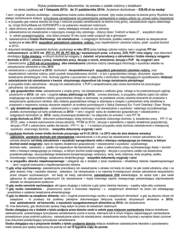 Wykaz podstawowych dokumentów do wniosku o zasiłek rodzinny z dodatkami na okres zasiłkowy od 1 listopada 2013r. do 31 października 2014r. /kryterium dochodowe – 539,00 zł na osobę/ 1.xero i oryginał dowodu osobistego – obowiązkowo każda osoba składająca wniosek /gdy osoba przebywa na terenie gminy Wyszków bez stałego zameldowania dołącza tymczasowe zameldowanie lub potwierdzenie zamieszkania w miejscu pobytu np. umowa najmu mieszkania/ 2. w przypadku gdy rodzice dziecka lub drugi z rodziców posiada zameldowanie na terenie innej gminy, zaświadczenie organu właściwego np. Urząd Gminy/Miasta lub GOPS/MOPS o nie pobieraniu świadczeń rodzinnych, 3 . odpis skrócony aktu urodzenia dziecka - osoby składające wniosek po raz pierwszy 4. zaświadczenia lub oświadczenie o rozpoczęciu nowego roku szkolnego - dotyczy dzieci 5-letnich w klasie„O” , wszystkich dzieci w szkole ponadgimnazjalnej oraz dzieci powyżej 16 roku życia nadal uczących się w gimnazjum 5. zaświadczenia z Urzędu Skarbowego lub oświadczenia - o osiągniętym dochodzie, podatku należnym, składce na ubezpieczenie społeczne w roku 2012 wszystkich pełnoletnich członków rodziny oraz niepełnoletnich członków rodziny, jeżeli uzyskali dochód w 2012r. 6. dokument określający wysokość dochodu uzyskanego w roku 2012 przez każdego członka rodziny /xero i oryginały PIT-ów rozliczeniowych za 2012 rok /PIT-11, PIT 28, PIT 40A itp./ wystawionych przez z-d pracy, ZUS, PUP i inne organy oraz dokument określający liczbę miesięcy, w których dochód był osiągany tj. zaświad. od pracodawcy o zatrudnieniu i liczbie miesięcy osiągania dochodu w 2012 r, umowa o pracę, świadectwo pracy, decyzja o rencie, emeryturze, decyzja z PUP itp.-oryginał i xero 7. zaświadczenia z ZUS lub od pracodawcy albo oświadczenia członków rodziny zawierające informację o wysokości składek na ubezpieczenie zdrowotne w roku 2012 8. oświadczenia o uzyskanych w 2012r. dochodach nieopodatkowanych wszystkich pełnoletnich członków rodziny oraz niepełnoletnich członków rodziny, jeżeli uzyskali nieopodatkowany dochód – w tym z gospodarstwa rolnego, otrzymane stypendia, świadczenie alimentacyjne i inne dochody-zgodnie z pouczeniem w załączniku o dochodach niepodlegających opodatkowaniu /dołączyć zaświadczenie lub oświadczenie o kwocie otrzymanego stypendium lub innego świadczenia pieniężnego/ 9. w przypadku braku zatrudnienia – decyzja lub zaświadczenie z PUP o zarejestrowaniu jako osoba bezrobotna lub poszukująca zatrudnienia lub oświadczenie, 10. gdy gospodarstwo rolne- zaświadczenie z urzędu gminy lub oświadczenie o wielkości gosp. rolnego w ha przeliczeniowych ogólnej powierzchni w 2012r. lub xero i oryginał nakazu płatniczego za 2012r. -umowa dzierżawy, w przypadku oddania części lub całości znajdującego się w posiadaniu rodziny gospodarstwa rolnego w dzierżawę, na podstawie umowy zawartej stosownie do przepisów o ubezpieczeniu społecznym rolników, albo oddania gospodarstwa rolnego w dzierżawę w związku z pobieraniem renty określonej w przepisach o wspieraniu rozwoju obszarów wiejskich ze środków pochodzących z Sekcji Gwarancji Eur. Fund/ Orientacji i Gwar. Rolnej, 11. gdy działalność gospodarcza – zaświadczenie z urzędu skarbowego/ lub oświadczenie o wysokości należnego zryczałtowanego podatku dochodowego lub karty podatkowej za 2012r. + xero i oryginał wpisu do działalności gospodarczej + oświadczenie o osiągniętych dochodach za 2012r. osoby prowadzącej działalność / na załączniku do wniosku/ + xero PIT 36 12. utrata dochodu za 2012r. -dokument potwierdzający utratę dochodu i wysokość utraconego dochodu tj. świadectwo pracy , PIT-11 za 2012r, zaśw. o okresie wykonywania umowy-zlecenia, PIT8B za 2012r., decyzja o wykreśleniu z rejestru działalności gospodarczej, decyzja z PUP o zakończeniu zasiłku dla bezrob. i PIT-11, itp ./ + w każdym przypadku utraty dochodu zaświadczenie o miesięcznej wysokości utraconego dochodu - /wszystkie dokumenty oryginały i xero/ 13.uzyskanie dochodu (nowe źródło dochodu poczynając od 01.01.2012r. i w 2013 roku-do dnia złożenia wniosku)) -zgłoszenie uzyskania dochodu jest obowiązkowe zaświadczenie z z-du pracy lub oświadczenie o nowym zatrudnieniu lub o umowie-zlecenia /od kiedy zatrudnienie + wysokość wynagrodzenia netto z miesiąca następującego po miesiącu, w którym dochód został osiągnięty/, wpis do rejestru działalności gospodarczej + oświadczenie o wysokości uzyskiwanego dochodu netto, zaświadcz. o zasiłku lub stypendium dla bezrobotnych zaśw. o zakończeniu urlopu wychowawczego /kiedy + dochód netto z miesiąca następującego po miesiącu, w którym dochód został osiągnięty/, decyzja o przyznaniu zasiłku lub świadczenia przedemerytalnego, nauczycielskiego świadczenia kompensacyjnego, emerytury, renty, renty rodzinnej, renty socjalnej, zasiłku chorobowego, macierzyńskiego, świadczenia rehabilitacyjnego /wszystkie dokumenty oryginały i xero/ 14. w przypadku dziecka niepełnosprawnego / ubieganie się o dodatek z tytułu kształcenia i rehabilitacji dziecka niepełnosprawnego/ - xero i oryginał orzeczenia o niepełnosprawności dziecka 15.gdy urlop wychowawczy- zaświadczenie pracodawcy lub oświadczenie o okresie /od kiedy do kiedy/ na jaki został udzielony urlop i na jakie dziecko /imię i nazwisko dziecka/, zaświadcz. lub oświadczenie o co najmniej 6-miesięcznym okresie zatrudnienia bezpośrednio przed urlopem wychowawczym /od kiedy do kiedy zatrudniona/, zaświadczenie ZUS stwierdzające, że osoba była i jest nadal zgłoszona do ubezpieczeń społecznych/ lub oświadczenie + kopia imiennego raportu miesięcznego potwierdzająca odprowadzenie składek na ubezpieczenie społeczne 16.gdy osoba samotnie wychowująca- akt zgonu drugiego z rodziców a gdy ojciec dziecka nieznany – zupełny odpis aktu urodzenia 17.gdy osoba rozwiedzio