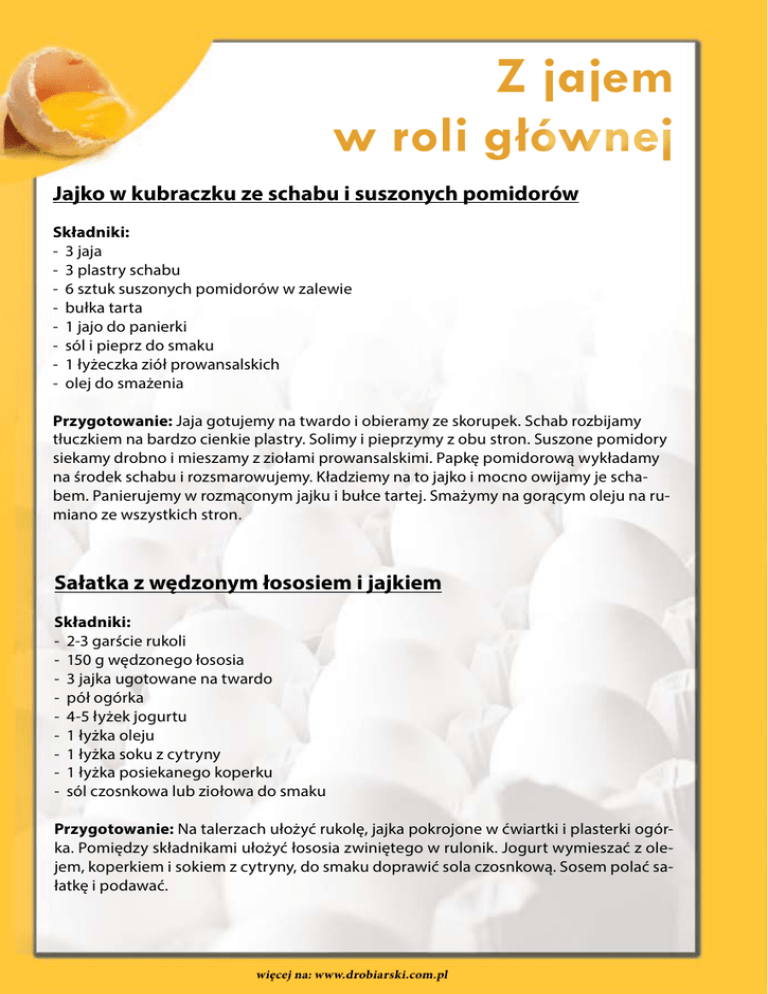 Z jajem w roli głównej Jajko w kubraczku ze schabu i suszonych pomidorów Składniki: - 3 jaja - 3 plastry schabu - 6 sztuk suszonych pomidorów w zalewie - bułka tarta - 1 jajo do panierki - sól i pieprz do smaku - 1 łyżeczka ziół prowansalskich - olej do smażenia Przygotowanie: Jaja gotujemy na twardo i obieramy ze skorupek. Schab rozbijamy tłuczkiem na bardzo cienkie plastry. Solimy i pieprzymy z obu stron. Suszone pomidory siekamy drobno i mieszamy z ziołami prowansalskimi. Papkę pomidorową wykładamy na środek schabu i rozsmarowujemy. Kładziemy na to jajko i mocno owijamy je schabem. Panierujemy w rozmąconym jajku i bułce tartej. Smażymy na gorącym oleju na rumiano ze wszystkich stron. Sałatka z wędzonym łososiem i jajkiem Składniki: - 2-3 garście rukoli - 150 g wędzonego łososia - 3 jajka ugotowane na twardo - pół ogórka - 4-5 łyżek jogurtu - 1 łyżka oleju - 1 łyżka soku z cytryny - 1 łyżka posiekanego koperku - sól czosnkowa lub ziołowa do smaku Przygotowanie: Na talerzach ułożyć rukolę, jajka pokrojone w ćwiartki i plasterki ogórka. Pomiędzy składnikami ułożyć łososia zwiniętego w rulonik. Jogurt wymieszać z olejem, koperkiem i sokiem z cytryny, do smaku doprawić sola czosnkową. Sosem polać sałatkę i podawać. więcej na: www.drobiarski.com.pl Z jajem w roli głównej Jeżyki w majonezie Składniki: - 3-4 jajka ugotowane na twardo - 1 marchew - 1/2 cukinii - 6-7 gałązek szczypiorku - rzodkiewka do dekoracji - majonez - pomidor - ziele angielskie - pieprz czarny granulowany - wykałaczka - sól, pieprz Przygotowanie: Ugotowane przestudzone jajka obieramy ze skórek, płuczemy pod bieżącą wodą i osuszamy delikatnie papierowym ręcznikiem. Z każdego jaja pod lekkim kątem odcinamy małą część żeby mogło swobodnie stać. Robimy dziurki wykałaczką i wkładamy w nie pocięty umyty i osuszony szczypiorek. Następnie robimy oczka z pieprzu i nosek z ziaren ziela angielskiego Warzywa myjemy (marchew obieramy) cukinię, rzodkiewę i pomidorka nie obieramy tylko porządnie po myciu wycieramy. Wykładamy talerz, na nim rozkładamy pokrojoną w cieniutkie paseczki marchewkę i cukinię (robimy łąkę). Na łące kładziemy plastry pomidora i polewamy majonezem. Na gotowe plastry pomidora stawiamy jeżyki, dekorujemy pozostałym majonezem i rzodkiewką. Jajka po szkocku Składniki: - 550 g mięsa mielonego z łopatki - 7 małych jajek - olej do smażenia - bułka tarta - sól z pieprzem Przygotowanie: 6 jajek ugotować na twardo, wystudzić i obrać ze skorupek. Do mięsa mielonego wbić pozostałe jajo, dodać 3 łyżki bułki tartej i dokładnie wymieszać. Masę doprawić do smaku solą z pieprzem. Gotową mięsną masą oblepić ugotowane jajka, uformować kule lub kształt jajka a następnie obtoczyć w bułce tartej. Smażyć na oleju ze wszystkich stron na złoty kolor. Podawać na ciepło jako danie obiadowe lub na zimno. więcej na: www.drobiarski.com.pl Z jajem w roli głównej Domki z jajek Składniki: - 3 jajka kurze - 1/2 pęczka szczypiorku - 4 łyżeczki majonezu - 1 mała marchewka - 3 małe pomidory - kawałeczek pora - 1 łyżeczka ketchupu, sól Przygotowanie: Jajka umyć i ugotować na twardo (obrać ze skorupek). Szczypior, pomidory umyć i osuszyć, a marchew obrać i ugotować do miękkości. Spody jajek ściąć delikatnie tak, żeby nam ładnie się postawiły. Z pomidorów odciąć górę i wydrążyć żeby powstały kapelusze. Kilka gałązek szczypiorku pokroić na odcinki około 3 cm i poprzecinać, ale nie do końca. Resztę drobno pokroić. Z pora powycinać trzy prostokąty na drzwi i trzy kwadrat na okna. Na jajko dodajemy odrobinę ketchupu w dwóch miejscach i na niego nalepiamy okno i drzwi dociskając palcem żeby wyszła ładna otoczka ramek z ketchupu. Na górę jajka dajemy kapelusz z pomidora na kapelusz łyżeczkę majonezu a na majonez pocięty szczypior. Posiekany szczypior rozsypujemy wokół chatek, polewamy resztą majonezu, a na niego układamy ugotowaną i pokrojoną w kwiatuszki marchewkę. Możemy deli- Jaja w galarecie Składniki: - jajka - polędwica z kurczaka - bulion drobiowy - woda - pieprz czarny mielony - ocet winny jabłkowy - żelatyna Przygotowanie: Jajka ugotować na twardo, ostudzić, obrać, przekroić na połowy. Każdą połówkę owinąć plastrem polędwicy, ułożyć w niezbyt głębokim naczyniu. Wodę zagotować. Rozpuścić w niej kostkę rosołową, dodać żelatynę, pieprz i ocet (nie gotować). Przestudzonym wywarem zalać jajka. Odstawić do zastygnięcia. więcej na: www.drobiarski.com.pl Z jajem w roli głównej katnie posolić.. Tarta wielkanocna z białą kiełbasą i jajami Składniki: - ciasto: 200 g mąki - 100 g masła - łyżeczka soli - 3 łyżki wody Nadzienie: - 2 białe kiełbasy - 2 jajka ugotowane na twardo - 1 surowe jajko - 300 ml śmietany - majeranek - szczypta soli - świeżo mielony pieprz, kiełki/ rzeżucha, tarty chrzan Ciasto zagnieść jak najszybciej zimnymi rękoma. Wykleić nim formę, po nakłuwać widelcem, przykryć je papierem do pieczenia, obciążyć fasolą, grochem lub kulkami ceramicznymi i zapiekać w temperaturze 180 stopni ok. 15 minut. Śmietanę wymieszać z surowym jajem i przyprawić do smaku majerankiem, solą i pieprzem. Jeśli lubimy ostrzejsze dania w tej chwili możemy dodać starty chrzan. Ugotowane jajka pokroić w równe plasterki a kiełbasę piec w temperaturze 180 stopni aż będzie miała delikatnie złoty kolor. Pokrojone w plastry jajka i kiełbaskę poukładać na podpieczonym spodzie i zalać tartę masą jajeczno- śmietanową. Całość zapiekać ok. 15 minut (aż wierzch będzie ścięty i delikatnie zrumieniony). Podawać z kiełkami lub rzeżuchą. Frittata z białą kiełbasą Składniki: - 3 jajka - 2 białe kiełbasy - pieprz czarny mielony - natka pietruszki - papryka słodka mielona - ostra papryka w proszku Przygotowanie: Jajka zmiksować z pieprzem i natką. Kiełbasę po