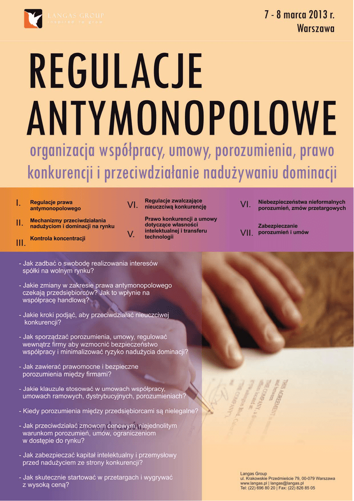 REGULACJE ANTYMONOPOLOWE organizacja współpracy, umowy, porozumienia, prawo konkurencji i przeciwdziałanie nadużywaniu dominacji Szanowni Państwo KLUCZOWE ZAGADNIENIA: Jak zadbać o swobodę realizowania interesów gospodarczych na wolnym rynku? W jaki sposób organizować i realizować współpracę między firmami, aby zabezpieczać spółki przed ryzykiem naruszenia prawa antymonopolowego? Polityka konkurencji w UE i w Polsce ma przynosić gwarancję przed zniekształceniami na wolnym rynku. Interes konsumentów jest tutaj kluczowy, chodzi bowiem o dostęp do różnorodnych produktów i usług po zbliżonych cenach. Jak wygląda polski rynek? W jakim stopniu interesy firm w zakresie swobodnego funkcjonowania są zaspokojone? Jak przeciwdziałać zmowom cenowym, niejednolitym warunkom porozumień, umów, ograniczeniom w dostępie do rynku? Jak działać w sytuacjach nieuczciwych warunków współpracy, niejasnym porozumieniom, na co zwracać uwagę? Zapraszamy do udziału w szkoleniu podczas, którego dowiedzą się Państwo: − Jak zadbać o swobodę realizowania interesów spółki na wolnym rynku? − Jakie zmiany w zakresie prawa antymonopolowego czekają przedsiębiorców? − W jaki sposób nadzorowany jest rynek pod kątem dominacji i jakie są konsekwencje nieprzestrzegania przepisów antymonopolowych? − Jakie kroki podjąć, aby przeciwdziałać nieuczciwej konkurencji? − Jak stosować regulacje prawne wobec niedozwolonych działań konkurencji? − Jak sporządzać porozumienia, umowy, regulować wewnątrz firmy aby wzmocnić bezpieczeństwo współpracy i minimalizować ryzyko nadużycia dominacji? − Jak zawierać prawomocne i bezpieczne porozumienia między firmami? − Jakie klauzule stosować w umowach współpracy, umowach ramowych, dystrybucyjnych, porozumieniach? − Kiedy porozumienia między przedsiębiorcami są nielegalne? − Jak przeciwdziałać zmowom cenowym, niejednolitym warunkom porozumień, umów, ograniczeniom w dostępie do rynku? − Jak zabezpieczać kapitał intelektualny i przemysłowy przed nadużyciem ze strony konkurencji? − Jak skutecznie startować w przetargach i wygrywać z wysoką ceną? W przypadku jakichkolwiek pytań Proszę o kontakt telefoniczny z zespołem Langas Group pod numerem telefonu (22) 696 80 20, lub za pomocą poczty elektronicznej: [email protected] Barbara Zielińska Kierownik Projektu 1. Regulacje prawa antymonopolowego 2. Mechanizmy przeciwdziałania nadużyciom i dominacji na rynku 3. Kontrola koncentracji 4. Regulacje zwalczające nieuczciwą konkurencję 5. Zabezpieczanie porozumień i umów 6. Niebezpieczeństwa nieformalnych porozumień, zmów przetargowych 7. Prawo konkurencji a umowy dotyczące własności intelektualnej i transferu technologii SZKOLENIE SKIEROWANE DO: − − − Kierowników, menedżerów działów prawnych Kierowników Biura Zarządu Menedżerów kontraktów i umów METODOLOGIA: Szkolenie nastawione jest na zagadnienia praktyczne. Podczas zajęć omówione zostaną kluczowe elementy prawa antymonopolowego oraz innych regulacji prawa gospodarczego jak i formalnych rozwiązań wspierających działania firmy w stosowaniu dobrych i zgodnych z prawem praktyk rynkowych. Eksperci poprzez wykłady, dyskusje, analizy zapisów, case studies będą szczegółowo pogłębiać tematy związane z najbardziej wrażliwymi aspektami regulacji antymonopolowych. Langas Group ul. Krakowskie Przedmieście 79, 00-079 Warszawa www.langas.pl | [email protected] Tel: (22) 696 80 20 | Fax: (22) 826 85 05 REGULACJE ANTYMONOPOLOWE organizacja współpracy, umowy, porozumienia, prawo konkurencji i przeciwdziałanie nadużywaniu dominacji DZIEŃ II O C H R O N A I N T E R E S Ó W K O N T R O L A D O M I N A C J I P O R O Z U M I E N I A Z A P O B I E G A N I E N I E U C Z C I W E J K O N K U R E N C J I DZIEŃ I OCHRONA INTERESÓW SPÓŁKI W UJĘCIU PRAWA KONKURENCJI Jak chronić firmę przed ryzykiem naruszenia prawa antymonopolowego i nadużywania dominacji ze strony konkurencji? − − − − − − Akty prawne i kluczowe zapisy w zakresie ochrony konkurencji; gałęzie prawa konkurencji Polskie a europejskie przepisy regulujące kwestie konkurencji Organy ochrony konkurencji (w Polsce i w UE) Procedury kontrolne organów antymonopolowych Postępowanie w sprawach pomocy publicznej w kontekście prawa antymonopolowego Ceny transakcyjne – prawidłowy wybór i stosowane metody, wymagane procedury (w Polsce, w UE) KONTROLA KONCENTRACJI I PRZECIWDZIAŁANIE POZYCJI DOMINUJĄCEJ W PRAKTYCE POLSKICH FIRM W jaki sposób nadzorowany jest rynek pod kątem dominacji i jakie są konsekwencje nieprzestrzegania przepisów antymonopolowych? − − − − − Jak jest kontrolowana koncentracja (fuzje) w Polsce i Unii Europejskiej? Jak wygląda nadużywanie pozycji dominującej w świetle regulacji KSH i innych ustaw Zwolnienia, wyłączenia i wyjątki w zakresie kontroli koncentracji Konsekwencje w przypadku uznania praktyki za ograniczającą konkurencję, a konsekwencje w przypadku naruszenia zbiorowych interesów konsumentów CASE STUDY: przepisy, orzeczenia sądów oraz organów POROZUMIENIA OGRANICZAJĄCE KONKURENCJĘ Jak zawierać prawomocne i bezpieczne porozumienia między firmami? − − − − − − − − − Praktyki ograniczające porozumienia Jakiego rodzaju porozumienia stosuje się i jaka jest ich prawna konstrukcja ora skuteczność (pionowe i poziome)? Jakie są przesłanki uznania porozumienia za ograniczające konkurencję? Prawomocna konstrukcja uzgodnień między przedsiębiorcami Porozumienia pomiędzy firmami konkurującymi, a porozumienia pomiędzy przedsiębiorcami, którzy nie są konkurentami Uchwały lub inne akty świadczące o porozumieniu CASE STUDY: zapisy umów mogące stanowić podstawę dla postępowania przeciwko przedsiębiorcom Jak postępować w razie postępowania przed Prezesem UOKiK? – zasada „współdziałania”, preferencje dla „ujawniającego informacje o poroz