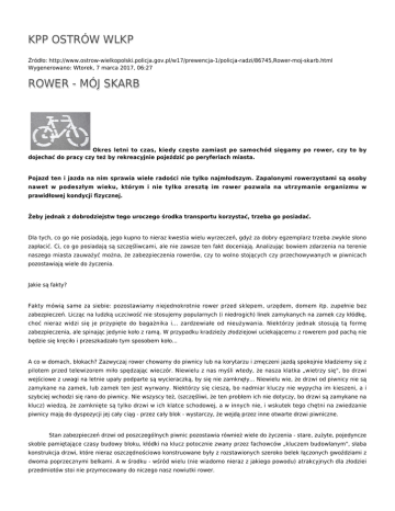 KPP OSTRÓW WLKP Źródło: http://www.ostrow-wielkopolski.policja.gov.pl/w17/prewencja-1/policja-radzi/86745,Rower-moj-skarb.html Wygenerowano: Wtorek, 7 marca 2017, 06:27 ROWER - MÓJ SKARB Okres letni to czas, kiedy często zamiast po samochód sięgamy po rower, czy to by dojechać do pracy czy też by rekreacyjnie pojeździć po peryferiach miasta. Pojazd ten i jazda na nim sprawia wiele radości nie tylko najmłodszym. Zapalonymi rowerzystami są osoby nawet w podeszłym wieku, którym i nie tylko zresztą im rower pozwala na utrzymanie organizmu w prawidłowej kondycji fizycznej. Żeby jednak z dobrodziejstw tego uroczego środka transportu korzystać, trzeba go posiadać. Dla tych, co go nie posiadają, jego kupno to nieraz kwestia wielu wyrzeczeń, gdyż za dobry egzemplarz trzeba zwykle słono zapłacić. Ci, co go posiadają są szczęśliwcami, ale nie zawsze ten fakt doceniają. Analizując bowiem zdarzenia na terenie naszego miasta zauważyć można, że zabezpieczenia rowerów, czy to wolno stojących czy przechowywanych w piwnicach pozostawiają wiele do życzenia. Jakie są fakty? Fakty mówią same za siebie: pozostawiamy niejednokrotnie rower przed sklepem, urzędem, domem itp. zupełnie bez zabezpieczeń. Licząc na ludzką uczciwość nie stosujemy popularnych (i niedrogich) linek zamykanych na zamek czy kłódkę, choć nieraz widzi się je przypięte do bagażnika i... zardzewiałe od nieużywania. Niektórzy jednak stosują tą formę zabezpieczenia, ale spinając jedynie koło z ramą. W przypadku kradzieży złodziejowi uciekającemu z rowerem pod pachą nie będzie się kręciło i przeszkadzało tym sposobem koło... A co w domach, blokach? Zazwyczaj rower chowamy do piwnicy lub na korytarzu i zmęczeni jazdą spokojnie kładziemy się z pilotem przed telewizorem miło spędzając wieczór. Niewielu z nas myśli wtedy, że nasza klatka „wietrzy się", bo drzwi wejściowe z uwagi na letnie upały podparte są wycieraczką, by się nie zamknęły... Niewielu wie, że drzwi od piwnicy nie są zamykane na zamek, lub zamek ten jest wyrwany. Niektórzy się cieszą, bo nadmiar kluczy nie wypycha im kieszeni, a i szybciej wchodzi się rano do piwnicy. Nie wszyscy też, (szczęśliwi, że ten problem ich nie dotyczy, bo drzwi są zamykane na klucz) wiedzą, że zamknięte są tylko drzwi w ich klatce schodowej, a w innych nie, i wskutek tego chętni na zwiedzanie piwnicy mają do dyspozycji jej cały ciąg - przez cały blok - wystarczy, że wejdą przez inne otwarte drzwi piwniczne. Stan zabezpieczeń drzwi od poszczególnych piwnic pozostawia również wiele do życzenia - stare, zużyte, pojedyncze skoble pamiętające czasy budowy bloku, kłódki na klucz potocznie zwany przez fachowców „kluczem budowlanym", słaba konstrukcja drzwi, które nieraz oszczędnościowo konstruowane były z rozstawionych szeroko belek łączonych gwoździami z dwoma poprzecznymi belkami. A w środku - wśród wielu (nie wiadomo nieraz z jakiego powodu) atrakcyjnych dla złodziei przedmiotów stoi nie przymocowany do niczego nasz nowiutki rower. Co robić? Oto kilka porad, jak ustrzec się przed kradzieżą, jak utrudnić działanie złodziejowi: - stosujmy linki rowerowe zawsze, odchodząc nawet na chwilę przypinajmy rower do nieruchomej części otoczenia - stojaka na rowery, jak go nie ma to poręczy, metalowego ogrodzenia, rurki itp. Linka powinna trzymać nie koło, które łatwo zdjąć, ale ramę z kołem; - wchodząc do sklepu starajmy się, żeby nasz (przypięty) rower był w zasięgu naszego wzroku; - zamykajmy zawsze drzwi naszej klatki schodowej. Robimy to nie tylko dla siebie ale również w interesie wszystkich mieszkańców naszej klatki. I odwrotnie - nie zamknięcie drzwi narazić może na straty nie tylko sąsiadów ale i nas; - zamykajmy drzwi do piwnicy, tam też jest nasze mienie, część naszego gospodarstwa; - jeżeli możemy, wnioskujmy o postawienie ścianek działowych pomiędzy piwnicami poszczególnych klatek; - zadbajmy o jak najlepsze zabezpieczenie naszej piwnicy. Czym więcej zabezpieczeń tym więcej pracy musi wykonać złodziej, żeby się do niej dostać, tym więcej czasu mu to zajmie - złodzieja czas goni - zawsze ktoś może go zastać przy majstrowaniu, więc dobrze zabezpieczone piwnice będzie omijał - po co się męczyć, skoro obok jest tylko mała kłódeczka? - miejmy oczy otwarte na to, kto wchodzi do naszej klatki schodowej, gdyż często wpuszczamy bez sprawdzenia byle kogo, często wystarczy samo przyciśnięcie guzika domofonu, by drzwi otwarły się a nikt nie sprawdzi, kogo wpuścił, kto wszedł. - gdy w naszym bloku nie ma domofonów wnioskujmy o ich zamontowanie; - zwracajmy uwagę na osoby kręcące się podejrzanie w okolicy naszego bloku, szczególnie po zmroku, zapamiętajmy jakieś szczegóły ich wyglądu, pomoże to, gdy nazajutrz okaże się, że dokonano włamania; - gdy ktoś kręci się w naszej piwnicy zadzwońmy na policję, niech policjanci sprawdzą w jakim celu ktoś penetruje zakątki naszego bloku; - znakujmy nasze rowery, w przypadku ich kradzieży łatwiej zidentyfikować rower, jako naszą własność, kiedy zostanie odnaleziony, czy odzyskany przez policję. Znakowanie rowerów prowadzi Policja i Straż Miejska - można przyjechać w każdej chwili (w godzinach urzędowania); - o wszystkich podejrzanych osobach zauważonych w otoczeniu naszego bloku, które na przykład coś wynoszą z piwnicy, wchodzą lub wychodzą z niej bez powodu zawiadamiajmy policję, starajmy się postępować zgodnie z zasadami społeczeństwa obywatelskiego - zwracajmy uwagę nie tylko na nasze mienie ale również na sąsiada, on postąpi tak samo. autor: kom. Krzysztof Kula Ocena: 0/5 (0) Tweetnij