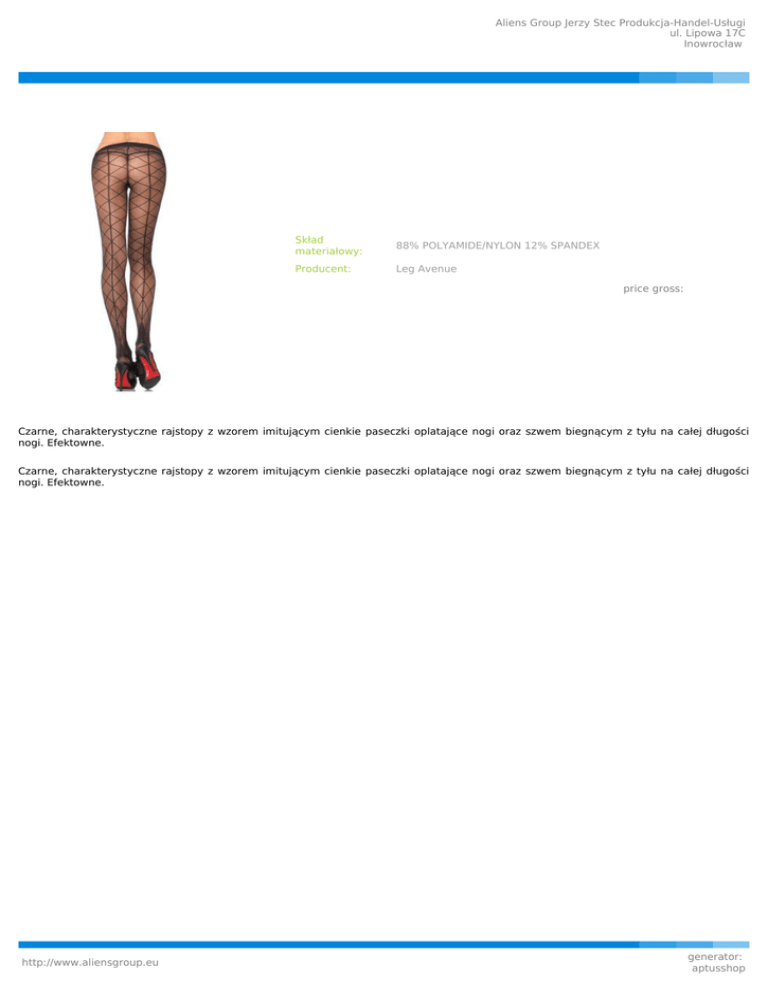 Aliens Group Jerzy Stec Produkcja-Handel-Usługi ul. Lipowa 17C Inowrocław Skład materiałowy: 88% POLYAMIDE/NYLON 12% SPANDEX Producent: Leg Avenue price gross: Czarne, charakterystyczne rajstopy z wzorem imitującym cienkie paseczki oplatające nogi oraz szwem biegnącym z tyłu na całej długości nogi. Efektowne. Czarne, charakterystyczne rajstopy z wzorem imitującym cienkie paseczki oplatające nogi oraz szwem biegnącym z tyłu na całej długości nogi. Efektowne. http://www.aliensgroup.eu generator: aptusshop
