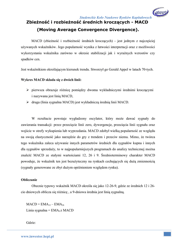 Studenckie Koło Naukowe Rynków Kapitałowych Zbieżność i rozbieżność średnich kroczących - MACD (Moving Average Convergence Divergence). MACD (zbieżność i rozbieżność średnich kroczących) - jest jednym z najczęściej używanych wskaźników. Jego popularność wynika z łatwości interpretacji oraz z możliwości wykorzystania wskaźnika zarówno w okresie stabilizacji jak i wyraźnych wzrostów czy spadków cen. Jest wskaźnikiem określającym kierunek trendu. Stworzył go Gerald Appel w latach 70-tych. Wykres MACD składa się z dwóch linii: pierwsza obrazuje różnicę pomiędzy dwoma wykładniczymi średnimi kroczącymi i nazywana jest linią MACD, druga (linia sygnalna MACD) jest wykładniczą średnią linii MACD. W rezultacie powstaje wygładzony oscylator, który może dawać sygnały do zawierania transakcji: przez przecięcie linii zero, dywergencje, przecięcia linii sygnału oraz wejście w strefy wykupienia lub wyprzedania. MACD zdobył wielką popularność ze względu na swoją elastyczność jako narzędzie do gry z trendem i przeciw niemu. Mimo, że twórca tego wskaźnika zaleca używanie innych parametrów średnich dla sygnałów kupna i innych dla sygnałów sprzedaży, to w najpopularniejszych programach do analizy technicznej można znaleźć MACD ze stałymi wartościami 12, 26 i 9. Średnioterminowy charakter MACD powoduje, że wskaźnik ten jest bezużyteczny na rynkach cechujących się dużą zmiennością (sygnały generowane ze zbyt dużym opóźnieniem względem rynku). Obliczanie Obecnie typowy wskaźnik MACD określa się jako 12-26-9, gdzie ze średnich 12 i 26cio dniowych oblicza się różnicę , a 9-dniowa średnia jest linią sygnalną. MACD = EMA12 – EMA26 Linia sygnalna = EMA9 z MACD Gdzie: www.inwestor.hepi.pl 3 Studenckie Koło Naukowe Rynków Kapitałowych EMA - Wykładnicza średnia krocząca. Poziomy wykupienia i wyprzedania MACD można stosować do rozpoznawania momentów, w których rynek staje się wykupiony lub wyprzedany, kiedy prawdopodobieństwo ruchu w przeciwnym kierunku rośnie. Appel twierdził, że rynek staje się wykupiony lub wyprzedany, gdy linia sygnalna wskaźnika przekracza poziomy dodatnie w przedziale (1,2;2,5) lub w przedziale ujemnym (-1,2;-2,5) na skali MACD. Gdy wspomniana linia osiąga któryś z tych krytycznych obszarów, wtedy każde przecięcie należy traktować jako odpowiedni sygnał. Ignorując przecięcia w obszarze neutralnym unikamy wielu mylnych sygnałów. Trzeba pamiętać, że MACD sprawdza się najlepiej jako narzędzie rozpoznawania długoterminowych trendów, a nie jako źródło sygnałów dla krótkoterminowej spekulacji. Na sygnały pojawiające się w środkowym obszarze wykresu MACD należy reagować tylko wtedy, gdy inny wiarygodny wskaźnik potwierdza, że otwarta pozycja będzie zgodna z kierunkiem trendu. Sygnały Jedną z najpopularniejszych strategii używania MACD, jest poszukiwanie przecięć MACD z linią sygnalną. Jak widać na załączonym wykresie (Wykres.1) każde przebicie od dołu linii sygnalnej (czarna, przerywana linia) przez MACD (niebieska linia) jest sygnałem kupna. Wyjątek: Gdy nieco ponad poziomem zerowym dochodzi do łagodnego spadku a następnie wzrostu wskaźnika, przy czym następuje przebicie w górę linii sygnalnej - zostaje najczęściej wygenerowany sygnał kupna zapowiadający długą zwyżkę. Rynku niedźwiedzia (spadki kursu) można się spodziewać gdy zachodzi odwrotna sytuacja, czyli MACD spada poniżej linii sygnalnej. Szczególnie silne sygnały pojawią się w strefach wykupienia (zalecenie sprzedaży)/wyprzedania (zalecenie kupna). Niestety poziomy te nie są jednoznacznie określone i trzeba to zrobić samemu na podstawie danych historycznych. www.inwestor.hepi.pl 3 Studenckie Koło Naukowe Rynków Kapitałowych Wykres 1. Następną strategią umożliwiającą handlowanie, którą warto przedstawić to wykorzystanie poziomu zero ( linia czerwona) i linii MACD do generowania sygnałów kupna i sprzedaży (Wykres 2.). www.inwestor.hepi.pl 3 Studenckie Koło Naukowe Rynków Kapitałowych Wykres 2. Przy analizie zachowań MACD warto zwrócić uwagę także na dywergencje. W tym celu służy histogram. Histogram jest wskaźnikiem określającym kierunek trendu. Wykres histogramu prezentowany jest w postaci pionowych słupków obrazujących odległość pomiędzy MACD, a linią sygnalną. Sygnały płynące z histogramu są wiec takie same jak sygnały wynikające z przecięć wspomnianych linii. Histogram został stworzony w celu łatwiejszej identyfikacji rynków byka (wzrosty kursu) i niedźwiedzia (spadki kursu). Histogram ma linię równowagi umieszczoną w zerze. Jeżeli słupki rosną powyżej poziomu zera oznacza to, że rodzi się nowy trend wzrostowy, zniżki powyżej poziomu równowagi ostrzegają przed słabnącym trendem. Analogicznie jest poniżej zera. Zniżki w tej strefie traktowane są jako silny rynek niedźwiedzia (spadki kursu). Trend spadkowy słabnie gdy nie towarzyszą mu zniżki histogramu pod poziomem równowagi (poziom zero). www.inwestor.hepi.pl 3 Studenckie Koło Naukowe Rynków Kapitałowych Rynku byka (wzrosty kursu) można się spodziewać gdy kolejny, niższy dołek na wykresie cenowym nie jest potwierdzany nowym dołkiem na wykresie MACD (Wykres 3.). Jeżeli natomiast MACD nie chce rosnąć, a tendencja ta jest kontynuowana na wykresie cenowym pojawia się negatywna dywergencja zapowiadająca spadki. Podobnie jak w przypadku przecięcia MACD i linii sygnalnej najwiarygodniejsze dywergencje pojawiają się w strefach wykupienia/wyprzedania. Wykres 3. Rynku niedźwiedzia (spadki kursu) można się spodziewać gdy kolejny, wyższy szczyt na wykresie cenowym nie jest potwierdzany nowym szczytem na wykresie MACD (Wykres 4.). Mamy wtedy do czynienia z dywergencją byka. www.inwestor.hepi.pl 3 Studenckie Koło Naukowe Rynków Kapitałowych Wykres 4. Podsumowanie: Sygnał kupna zostaje wygenerowany, gdy MAC