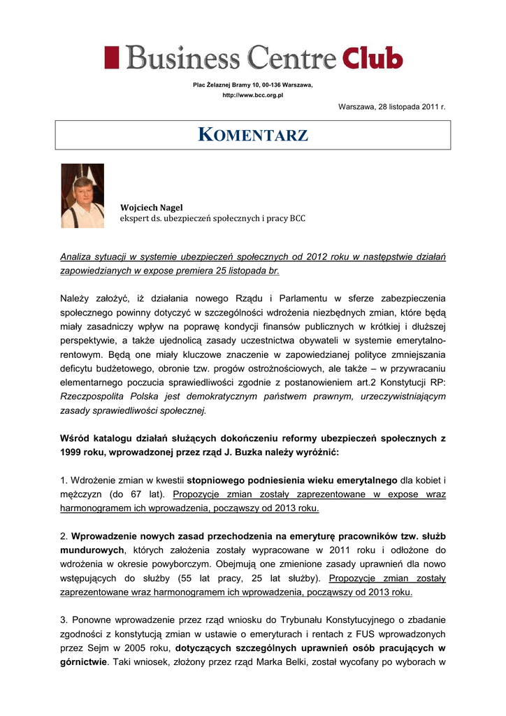 Plac Żelaznej Bramy 10, 00-136 Warszawa, http://www.bcc.org.pl Warszawa, 28 listopada 2011 r. KOMENTARZ Wojciech Nagel ekspert ds. ubezpieczeń społecznych i pracy BCC Analiza sytuacji w systemie ubezpieczeń społecznych od 2012 roku w następstwie działań zapowiedzianych w expose premiera 25 listopada br. Należy założyć, iż działania nowego Rządu i Parlamentu w sferze zabezpieczenia społecznego powinny dotyczyć w szczególności wdrożenia niezbędnych zmian, które będą miały zasadniczy wpływ na poprawę kondycji finansów publicznych w krótkiej i dłuższej perspektywie, a także ujednolicą zasady uczestnictwa obywateli w systemie emerytalnorentowym. Będą one miały kluczowe znaczenie w zapowiedzianej polityce zmniejszania deficytu budżetowego, obronie tzw. progów ostrożnościowych, ale także – w przywracaniu elementarnego poczucia sprawiedliwości zgodnie z postanowieniem art.2 Konstytucji RP: Rzeczpospolita Polska jest demokratycznym państwem prawnym, urzeczywistniającym zasady sprawiedliwości społecznej. Wśród katalogu działań służących dokończeniu reformy ubezpieczeń społecznych z 1999 roku, wprowadzonej przez rząd J. Buzka należy wyróżnić: 1. Wdrożenie zmian w kwestii stopniowego podniesienia wieku emerytalnego dla kobiet i mężczyzn (do 67 lat). Propozycje zmian zostały zaprezentowane w expose wraz harmonogramem ich wprowadzenia, począwszy od 2013 roku. 2. Wprowadzenie nowych zasad przechodzenia na emeryturę pracowników tzw. służb mundurowych, których założenia zostały wypracowane w 2011 roku i odłożone do wdrożenia w okresie powyborczym. Obejmują one zmienione zasady uprawnień dla nowo wstępujących do służby (55 lat pracy, 25 lat służby). Propozycje zmian zostały zaprezentowane wraz harmonogramem ich wprowadzenia, począwszy od 2013 roku. 3. Ponowne wprowadzenie przez rząd wniosku do Trybunału Konstytucyjnego o zbadanie zgodności z konstytucją zmian w ustawie o emeryturach i rentach z FUS wprowadzonych przez Sejm w 2005 roku, dotyczących szczególnych uprawnień osób pracujących w górnictwie. Taki wniosek, złożony przez rząd Marka Belki, został wycofany po wyborach w 2005 r. przez rząd Kazimierza Marcinkiewicza. Obecny rząd nie rozważa wystąpienia do TK, a w expose zaprezentowano jedynie ograniczenie uprawnień do osób pracujących w dole kopalni, przy wydobyciu. Oznacza to de facto – zachowanie obecnego status quo. 4. Objęcie powszechnym systemem emerytalnym prokuratorów i sędziów, jako zgodne z pierwotnymi założeniami reformy ubezpieczeń społecznych z 1999 r., zostały one zmienione w procesie przyjmowania ustaw wprowadzających reformę emerytalną. Rząd nie przedstawił w tej kwestii zamierzeń, a expose ograniczyło się do zapowiedzi przeglądu przywilejów grup zawodowych. Zapowiedziano wprowadzenie mechanizmu zamrożenia mechanizmu automatycznej waloryzacji wynagrodzeń sędziów (począwszy od 2012 r.). 5. Wprowadzenie wielofunduszowości w OFE (różne strategie lokacyjne, w zależności od wieku uczestnika) oraz określenie płatnika wypłat świadczeń z otwartych funduszy emerytalnych po 2013 roku. Rząd nie przedstawił w tej kwestii zamierzeń do wykonania. 6. Dostosowanie systemu rentowego do emerytalnego po reformie, co oznaczać będzie zmianę systemu wyliczania wysokości przyznawanych rent, których obecne ustalanie przebiega wedle zasad obowiązujących przed reformą ubezpieczeń społecznych z 1999 roku. Problem ten nie pojawił się w expose, aczkolwiek minister finansów wypowiedział się ostatnio na temat konieczności wprowadzenia zmian dostosowawczych. 7. Umacnianie systemu dobrowolnego oszczędzania na starość zarówno indywidualnego jak i poprzez tworzenie zakładowych programów emerytalnych o partycypacyjnym sposobie opłacania składek (na wzór brytyjski). Rząd nie posiada w tej kwestii zamierzeń do wykonania w zakresie zmian w ustawie o PPE. Dla osób indywidualnych wprowadzono możliwość oszczędzania na kontach IKZE, z ulgą podatkową w PIT począwszy od 2012 roku. Przywileje emerytalne w Polsce, które obejmują wybrane grupy zawodowe są bardzo kosztowne i nie znajdują uzasadnienia zarówno z punktu widzenia możliwości finansowych państwa jak i równego traktowania obywateli wobec stanowionego prawa. Naruszają one zasadę sprawiedliwości społecznej i uniemożliwiają głębszą reformę finansów publicznych. Budżet państwa corocznie asygnuje kwotę ponad 20 mld zł na opłacanie przywilejów emerytalnych w tym: • Funkcjonariuszy i żołnierzy (z możliwością przechodzenia na emeryturę po 15 latach pracy) – ok. 11 mld zł rocznie. W tej kwestii expose zawiera propozycje ograniczenia przywilejów związane z podwyższeniem lat służby (do 25 lat) oraz wieku przejścia na emeryturę mundurową (55 lat). Rozwiązanie ostatnie (wiek emerytalny) nie zostało wynegocjowane ze stroną związkową, która podtrzymuje przejście na emeryturę w wieku 50 lat. • Prokuratorów, sędziów, funkcjonariuszy służby więziennej (j.w). – ok. 1,2 mld zł rocznie. • Górników, wyłączonych z rozwiązań tzw. emerytur pomostowych (z możliwością przechodzenia na emeryturę po 25 latach pracy pod ziemią) – ok. 8,2 mld zł rocznie. Zagrożenia dla reform zapowiedzianych w expose Premiera. BCC uważa, iż brak woli politycznej Rządu w podjęciu działań na rzecz likwidacji przywilejów emerytalnych zastępowanych fiskalizmem podatkowym, będzie prowadził do następujących niekorzystnych skutków dla obywateli i przedsiębiorców: • Ryzykiem nie uzyskania akceptacji społecznej dla podwyższenia wieku emerytalnego, z uwagi na prawną nierówność traktowania pracowników ze względu na charakter świadczonej przez nich pracy. • Ryzykiem stopniowego podnoszenia podatków bezpośrednich – w PIT i CIT, w kierunku progresywnym, wprowadzenia trzeciego progu podatkowego dla osób lepiej zarabiających co podwyższa ryzyko