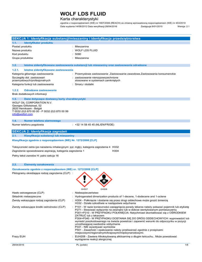 WOLF LDS FLUID Karta charakterystyki zgodnie z rozporządzeniem (WE) nr 1907/2006 (REACH) ze zmianą wprowadzoną rozporządzeniem (WE) nr 453/2010 Data wydania:14/08/2012 Data weryfikacji:28/04/2016 Zastępuje:9/01/2015 Wersja: 2.1 SEKCJA 1: Identyfikacja substancji/mieszaniny i identyfikacja przedsiębiorstwa 1.1. Identyfikator produktu Postać produktu : Mieszanina Nazwa produktu : WOLF LDS FLUID Kod produktu : 5090 Grupa produktów : Mieszanina 1.2. Istotne zidentyfikowane zastosowania substancji lub mieszaniny oraz zastosowania odradzane 1.2.1. Istotne zidentyfikowane zastosowania Kategoria głównego zastosowania : Przemysłowe zastosowanie ,Zastosowanie zawodowe,Zastosowania konsumenckie Szczegóły dot. zastosowań przemysłowych/profesjonalnych : zastosowanie nierozpowszechnione stosowane w systemach zamkniętych Kategoria funkcji lub zastosowania : Smary i dodatki 1.2.2. Odradzane zastosowanie Brak dodatkowych informacji 1.3. Dane dotyczące dostawcy karty charakterystyki WOLF OIL CORPORATION N.V. Georges Gilliotstraat, 52 2620 Hemiksem - België T 0032 (0)3 870 00 00 - F 0032 (0)3 870 00 99 [email protected] 1.4. Numer telefonu alarmowego Numer telefonu pogotowia : +32 14 58 45 45 (NL/EN/FR/DE) SEKCJA 2: Identyfikacja zagrożeń 2.1. Klasyfikacja substancji lub mieszaniny Klasyfikacja zgodnie z rozporządzeniem (WE) Nr. 1272/2008 [CLP]Mieszanina/Substancja: Karta SDS UE 2015: Zgodnie z Rozporządzeniem (UE) 2015/830 (Załącznik II Rozporządzenia REACH) Toksyczność ostra (po narażeniu inhalacyjnym: pył, mgły), kategoria zagrożenia 4 H332 Zagrożenie spowodowane aspiracją, kategoria zagrożenia 1 H304 Pełny tekst zwrotów H: patrz sekcja 16 2.2. Elementy oznakowania Oznakowanie zgodnie z rozporządzeniem (WE) nr. 1272/2008 [CLP] Extra labelling to displayExtra classification(s) to display Piktogramy określające rodzaj zagrożenia (CLP) : GHS07 GHS08 Hasło ostrzegawcze (CLP) : Niebezpieczeństwo Składniki niebezpieczne : Hydrogenated dimerization products of 1-decene, 1-dodecene and 1-octene Zwroty wskazujące rodzaj zagrożenia (CLP) : H304 - Połknięcie i dostanie się przez drogi oddechowe może grozić śmiercią H332 - Działa szkodliwie w następstwie wdychania Zwroty wskazujące środki ostrożności (CLP) : P101 - W razie konieczności zasięgnięcia porady lekarza należy pokazać pojemnik lub etykietę P271 - Stosować wyłącznie na zewnątrz lub w dobrze wentylowanym pomieszczeniu P301+P310 - W PRZYPADKU POŁKNIĘCIA: Natychmiast skontaktować się z OŚRODKIEM ZATRUĆ lub z lekarzem P304+P340 - W PRZYPADKU DOSTANIA SIĘ DO DRÓG ODDECHOWYCH: wyprowadzić lub wynieść poszkodowanego na świeże powietrze i zapewnić warunki do odpoczynku w pozycji umożliwiającej swobodne oddychanie P331 - NIE wywoływać wymiotów P501 - Zawartość i opakowanie należy przetwarzać zgodnie z przepisami miejscowymi/regionalnymi/krajowymi/międzynarodowymi. Frazy EUH : EUH208 - Zawiera Alkoksylowaną alkiloaminę o długim łańcuchu.. Może powodować wystąpienie reakcji alergicznej 28/04/2016 PL (polski) 1/8 WOLF LDS FLUID Karta charakterystyki zgodnie z rozporządzeniem (WE) nr 1907/2006 (REACH) ze zmianą wprowadzoną rozporządzeniem (WE) nr 453/2010 Zatyczka zabezpieczająca, której nie mogą otworzyć dzieci. : Nie Ostrzeżenia wyczuwalne dotykiem : Nie 2.3. Inne zagrożenia Brak dodatkowych informacji SEKCJA 3: Skład/informacja o składnikach 3.1. Substancja Nie dotyczy 3.2. Mieszanina Nazwa Identyfikator produktu % Klasyfikacja zgodnie z rozporządzeniem (WE) Nr. 1272/2008 [CLP] Hydrogenated dimerization products of 1-decene, 1-dodecene and 1-octene (Numer WE) 700-308-1 (REACH-nr) 01-2119411393-49 < 80 Acute Tox. 4 (Inhalation), H332 Asp. Tox. 1, H304 < 0,25 Acute Tox. 4 (Oral), H302 Skin Corr. 1B, H314 Skin Sens. 1, H317 Aquatic Chronic 3, H412 Alkoksylowaną alkiloaminę o długim łańcuchu. Dodecyl methacrylate (Numer CAS) 142-90-5 (Numer WE) 205-570-6 (Numer indeksowy) 607-247-00-9 < 0,25 Skin Irrit. 2, H315 Eye Irrit. 2, H319 STOT SE 3, H335 Aquatic Acute 1, H400 Aquatic Chronic 1, H410 Xylene (mix) (Numer CAS) 1330-20-7 (Numer WE) 215-535-7 (Numer indeksowy) 601-022-00-9 < 0,008 Flam. Liq. 3, H226 Acute Tox. 4 (Dermal), H312 Acute Tox. 4 (Inhalation), H332 Skin Irrit. 2, H315 Eye Irrit. 2, H319 STOT SE 3, H335 STOT RE 2, H373 Asp. Tox. 1, H304 Aquatic Chronic 3, H412 Ethylbenzene (Numer CAS) 100-41-4 (Numer WE) 202-849-4 (Numer indeksowy) 601-023-00-4 < 0,0016 Flam. Liq. 2, H225 Acute Tox. 4 (Inhalation), H332 STOT RE 2, H373 Asp. Tox. 1, H304 Aquatic Chronic 3, H412 Pełne brzmienie sformułowań H: patrz sekcja 16 SEKCJA 4: Środki pierwszej pomocy 4.1. Opis środków pierwszej pomocy Pierwsza pomoc - środki po zainhalowaniu : Raczej nie wymaga zastosowania pierwszej pomocy. Pierwsza pomoc - środki po kontakcie ze skórą : Skórę umyć wodą i delikatnym mydłem. Pierwsza pomoc - środki po kontakcie z oczami : W razie kontaktu z oczami natychmiast je przemyć czystą wodą przez 10-15 minut. Pierwsza pomoc - środki po połknięciu : Nie wywoływać wymiotów. Wypłukać usta. Natychmiast zasięgnąć porady/zgłosić się pod opiekę lekarza. 4.2. Najważniejsze ostre i opóźnione objawy oraz skutki narażenia Symptomy/urazy w przypadku inhalacji : Wdychanie par może powodować podrażnienie dróg oddechowych. Działa szkodliwie w następstwie wdychania. Symptomy/urazy w przypadku kontaktu ze skórą : Raczej nie stanowi większego zagrożenia dla skóry w spodziewanych warunkach normalnego użycia. Może powodować reakcję alergiczną skóry. Symptomy/urazy w przypadku kontaktu z oczami : Raczej nie stanowi większego zagrożenia przy kontakcie z oczami w spodziewanych warunkach normalnego użycia. Symptomy/urazy w przypadku połknięcia : May cause gastrointestinal irritation, nausea, vomiting and diarrhoea. Połknięcie i dostanie się przez drogi oddechowe może grozić śmiercią. Keep under medical supervision for at least 48 hours.
