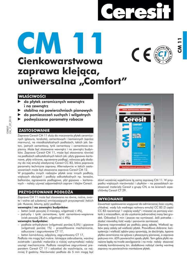 CERESIT CM_11_KT_09.10 Cienkowarstwowa zaprawa klejąca, uniwersalna „Comfort” WŁAŚCIWOŚCI do płytek ceramicznych wewnątrz i na zewnątrz stabilna na powierzchniach pionowych do pomieszczeń suchych i wilgotnych podwyższone parametry robocze ZASTOSOWANIE Zaprawa Ceresit CM 11 służy do mocowania płytek ceramicznych (glazura, terakota), cementowych i kamiennych (oprócz marmuru), na nieodkształcalnych podłożach, takich jak: beton, jastrych cementowy, tynk cementowy i cementowo-wapienny. Może być stosowana wewnątrz i na zewnątrz budynków. Zaprawa Ceresit CM 11, może być stosowana również na podłożach odkształcalnych takich jak: płyty gipsowo-kartonowe, płyty wiórowe, ogrzewane podłogi, wówczas gdy dodamy do niej emulsji elastycznej Ceresit CC 83, która poprawia parametry techniczne zaprawy. Alternatywnie w takich zastosowaniach może być stosowana zaprawa Ceresit CM 12. W przypadku innych rodzajów płytek oraz innych podłoży, większych obciążeń i podłoży odkształcalnych np. tarasów, balkonów, ogrzewania podłogowe, płyt gipsowo – kartonowych – należy używać odpowiednich zapraw i klejów Ceresit. PRZYGOTOWANIE PODŁOŻA Zaprawa CM 11 może być stosowana na równe, nośne, zwarte i wolne od substancji zmniejszających przyczepność (takich jak: tłuszcze, bitumy, pyły) podłoża: wewnątrz i na zewnątrz budynków: – beton (wiek powyżej 3 miesięcy, wilgotność £ 4%), – jastrychy i tynki cementowe, tynki cementowo-wapienne (wiek powyżej 28 dni, wilgotność £ 4%); wewnątrz budynków: – podłoża anhydrytowe (wilgotność poniżej 0,5%) i gipsowe (wilgotność poniżej 1%) – przeszlifowane mechanicznie, odkurzone i zagruntowane CT 17, – beton komórkowy, odpylony, zagruntowany CT 17, Podłoża nie mogą być mokre. Istniejące zabrudzenia, warstwy zwietrzałe i powłoki malarskie o niskiej wytrzymałości należy usunąć mechanicznie. Podłoża nasiąkliwe zagruntować preparatem Ceresit CT 17 i odczekać do wyschnięcia, co najmniej 2 godziny. Nierówności podłoża do 5 mm mogą być dzień wcześniej wypełnione tą samą zaprawą CM 11. W przypadku większych nierówności i ubytków – na posadzkach zastosować materiały Ceresit z grupy CN, a na ścianach szpachlówkę Ceresit CT 29. WYKONANIE Zawartość opakowania wsypywać do odmierzonej ilości czystej, chłodnej wody lub wodnego roztworu emulsji CC 83 (2 części CC 83 rozcieńczyć 1 częścią wody)* i mieszać za pomocą wiertarki z mieszadłem, aż do uzyskania jednorodnej masy bez grudek. Odczekać 5 min i jeszcze raz wymieszać. Jeśli potrzeba – dodać niewielką ilość wody i ponownie zamieszać. Zaprawę rozprowadzać po podłożu pacą zębatą. Wielkość zębów pacy zależy od wielkości płytek. Prawidłowo dobrane: konsystencja i wielkość zębów pacy sprawiają, że dociśnięta, typowa płytka ceramiczna nie spływa z płaszczyzny pionowej, a zaprawa pokrywa min. 65% powierzchni spodu płytki. Tam gdzie płytki narażone będą na trwałe zawilgocenie i na mróz należy stosować metodę kombinowaną tzn. dodatkowo nałożyć cienką warstwę zaprawy na powierzchnie montażowe płytek. CM 11 CM 11 UWAGA Prace należy wykonywać w suchych warunkach, przy temperaturze powietrza i podłoża od +5°C do +25°C. Wszelkie dane odnoszą się do temperatury +23°C i wilgotności względnej powietrza 50%. W innych warunkach należy uwzględnić szybsze lub wolniejsze twardnienie materiału. CM 11 zawiera cement i po zmieszaniu z wodą ma odczyn alkaliczny. W związku z tym należy chronić naskórek i oczy. W przypadku kontaktu materiału z oczami, płukać je obficie wodą i zasięgnąć porady lekarza. ZALECENIA Niniejsza karta techniczna określa zakres stosowania materiału i zalecany sposób prowadzenia robót, ale nie może zastąpić zawodowego przygotowania wykonawcy. Oprócz podanych zaleceń prace należy wykonywać zgodnie ze sztuką budowlaną i zasadami BHP. Producent gwarantuje jakość wyrobu, natomiast nie ma wpływu na warunki i sposób jego użycia. W przypadku wątpliwości należy wykonać własne próby stosowania. Producent zaleca stosowanie odpowiednich produktów wchodzących w skład systemowych rozwiązań. – Do fugowania należy użyć fugę Ceresit CE 40 Aquastatic a na podłożach narażonych na zwiększoną agresję chemiczną i mechaniczną (tarasy, balkony, ciągi komunikacyjne) stosować fugę Ceresit CE 43 Grand’Elit. – W celu dodatkowego zabezpieczenia fug i okładzin ceramicznych przed zabrudzeniami poprzez hydrofobizację powierzchni, należy stosować silikonowy impregnat Ceresit CT 10. Wraz z ukazaniem się tej karty technicznej tracą ważność karty wcześniejsze. SKŁADOWANIE Do 12 miesięcy od daty produkcji, przy składowaniu na paletach, w suchych warunkach i w oryginalnych, nieuszkodzonych opakowaniach. DANE TECHNICZNE Baza: mieszanka cementów z wypełniaczami mineralnymi i modyfikatorami Gęstość nasypowa: ok. 1,45 kg/dm3 Proporcje mieszania: ok. 1,1 l wody (0,7 l CC 83 + 0,4 l wody)* na 5 kg ok. 5,5 l wody (3,5 l CC 83 + 2,0 l wody)* na 25 kg Temperatura stosowania: od +5°C do +25°C Czas wstępnego dojrzewania: ok. 5 min Czas zużycia: do 2 godz. (90 min)* Czas otwarty (wg normy PN-EN 12004): przyczepność > 0,5 MPa Spływ (wg normy PN-EN 12004): < 0,5 mm Spoinowanie: po 24 godz. Przyczepność (wg normy PN-EN 12004): - początkowa: > 0,5 MPa - po zanurzeniu w wodzie: > 0,5 MPa - po starzeniu termicznym: > 0,5 MPa - po cyklach zamrażania i rozmrażania: > 0,5 MPa Odporność na temperaturę: Reakcja na ogień: CERESIT CM_11_KT_09.10 CM 11 Płytek nie moczyć w wodzie! Układać je na zaprawie i dociskać, póki jeszcze zaprawa lepi się do rąk. Nie układać płytek na styk! Zachować szerokość spoin w zależności od wielkości płytek i warunków eksploatacji. Świeże zabrudzenia zaprawą zmywać wodą, a stwardniałe usuwać mechanicznie. Spoinować nie wcześniej niż po 24 g