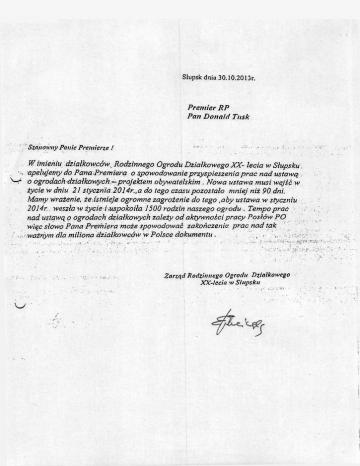 Słupsk dnia 30.10.2013r. Premier RP Pan Donald Tusk Szanowny Panic Premierze / ' •••• W imieniu działkowców. Rodzinnego Ogrodu Działkowego XX- lecia w> Słupsku •; apelujemy do Pana Premierą o spowodowanie przyspieszenia prać nad ustawą W o ogrodach działkowych - projektem obywatelskim . Nowa ustawa musi wejść w życie w dniu 21 stycznia 2014r., a do tego czasu pozostało mniej niż 90 dni. Mamy wrażenie, że istnieje ogromne zagrożenie do tego ,aby ustawa w styczniu 20l 4r.weszła w życie i mpokóiła 1500 rodzin naszego ogrodu . Tempo prac nad ustawą o ogrodach działkowych zależy od aktywności pracy Posłów PO więc słowo Pana Prtrhiera może spowodować zakończenie prac nad tak . ważnym dla miliona działkowców w Polsce dokumentu. , : •">•• Zarząd Rodzinnego Ogrodu Działkowego XX-lccia w Słupsku W