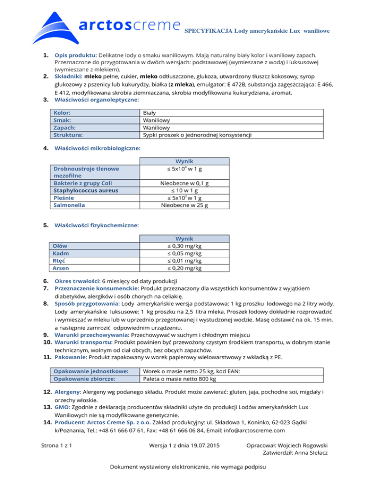 SPECYFIKACJA Lody amerykańskie Lux waniliowe 1. Opis produktu: Delikatne lody o smaku waniliowym. Mają naturalny biały kolor i waniliowy zapach. 2. Przeznaczone do przygotowania w dwóch wersjach: podstawowej (wymieszane z wodą) i luksusowej (wymieszane z mlekiem). Składniki: mleko pełne, cukier, mleko odtłuszczone, glukoza, utwardzony tłuszcz kokosowy, syrop glukozowy z pszenicy lub kukurydzy, białka (z mleka), emulgator: E 472B, substancja zagęszczająca: E 466, 3. E 412, modyfikowana skrobia ziemniaczana, skrobia modyfikowana kukurydziana, aromat. Właściwości organoleptyczne: Kolor: Smak: Zapach: Struktura: Biały Waniliowy Waniliowy Sypki proszek o jednorodnej konsystencji 4. Właściwości mikrobiologiczne: Drobnoustroje tlenowe mezofilne Bakterie z grupy Coli Staphylococcus aureus Pleśnie Salmonella Wynik ≤ 5x104 w 1 g Nieobecne w 0,1 g ≤ 10 w 1 g ≤ 5x102 w 1 g Nieobecne w 25 g 5. Właściwości fizykochemiczne: Wynik ≤ 0,30 mg/kg ≤ 0,05 mg/kg ≤ 0,01 mg/kg ≤ 0,20 mg/kg Ołów Kadm Rtęć Arsen 6. Okres trwałości: 6 miesięcy od daty produkcji 7. Przeznaczenie konsumenckie: Produkt przeznaczony dla wszystkich konsumentów z wyjątkiem diabetyków, alergików i osób chorych na celiakię. 8. Sposób przygotowania: Lody amerykańskie wersja podstawowa: 1 kg proszku lodowego na 2 litry wody. Lody amerykańskie luksusowe: 1 kg proszku na 2,5 litra mleka. Proszek lodowy dokładnie rozprowadzić i wymieszać w mleku lub w uprzednio przegotowanej i wystudzonej wodzie. Masę odstawić na ok. 15 min. a następnie zamrozić odpowiednim urządzeniu. 9. Warunki przechowywania: Przechowywać w suchym i chłodnym miejscu 10. Warunki transportu: Produkt powinien być przewożony czystym środkiem transportu, w dobrym stanie technicznym, wolnym od ciał obcych, bez obcych zapachów. 11. Pakowanie: Produkt zapakowany w worek papierowy wielowarstwowy z wkładką z PE. Opakowanie jednostkowe: Opakowanie zbiorcze: Worek o masie netto 25 kg, kod EAN: Paleta o masie netto 800 kg 12. Alergeny: Alergeny wg podanego składu. Produkt może zawierać: gluten, jaja, pochodne soi, migdały i orzechy włoskie. 13. GMO: Zgodnie z deklaracją producentów składniki użyte do produkcji Lodów amerykańskich Lux Waniliowych nie są modyfikowane genetycznie. 14. Producent: Arctos Creme Sp. z o.o. Zakład produkcyjny: ul. Składowa 1, Koninko, 62-023 Gądki k/Poznania, Tel.: +48 61 666 07 61, Fax: +48 61 666 06 84, Email: [email protected] Strona 1 z 1 Wersja 1 z dnia 19.07.2015 Opracował: Wojciech Rogowski Zatwierdził: Anna SIełacz Dokument wystawiony elektronicznie, nie wymaga podpisu