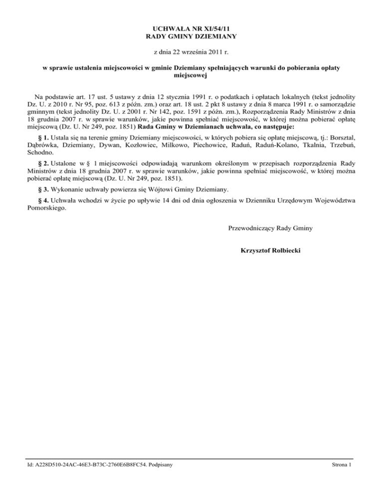 UCHWAŁA NR XI/54/11 RADY GMINY DZIEMIANY z dnia 22 września 2011 r. w sprawie ustalenia miejscowości w gminie Dziemiany spełniających warunki do pobierania opłaty miejscowej Na podstawie art. 17 ust. 5 ustawy z dnia 12 stycznia 1991 r. o podatkach i opłatach lokalnych (tekst jednolity Dz. U. z 2010 r. Nr 95, poz. 613 z późn. zm.) oraz art. 18 ust. 2 pkt 8 ustawy z dnia 8 marca 1991 r. o samorządzie gminnym (tekst jednolity Dz. U. z 2001 r. Nr 142, poz. 1591 z późn. zm.), Rozporządzenia Rady Ministrów z dnia 18 grudnia 2007 r. w sprawie warunków, jakie powinna spełniać miejscowość, w której można pobierać opłatę miejscową (Dz. U. Nr 249, poz. 1851) Rada Gminy w Dziemianach uchwala, co następuje: § 1. Ustala się na terenie gminy Dziemiany miejscowości, w których pobiera się opłatę miejscową, tj.: Borsztal, Dąbrówka, Dziemiany, Dywan, Kozłowiec, Milkowo, Piechowice, Raduń, RaduńKolano, Tkalnia, Trzebuń, Schodno. § 2. Ustalone w § 1 miejscowości odpowiadają warunkom określonym w przepisach rozporządzenia Rady Ministrów z dnia 18 grudnia 2007 r. w sprawie warunków, jakie powinna spełniać miejscowość, w której można pobierać opłatę miejscową (Dz. U. Nr 249, poz. 1851). § 3. Wykonanie uchwały powierza się Wójtowi Gminy Dziemiany. § 4. Uchwała wchodzi w życie po upływie 14 dni od dnia ogłoszenia w Dzienniku Urzędowym Województwa Pomorskiego. Przewodniczący Rady Gminy Krzysztof Rolbiecki Id: A228D51024AC46E3B73C2760E6B8FC54. Podpisany Strona 1 Uzasadnienie Zgodnie z art. 17 ust. 5 ustawy o podatkach i opłatach lokalnych Rada Gminy ustala miejscowości odpowiadające warunkom określonym w przepisach rozporządzenia Rady Ministrów z dnia 18 grudnia 2007 r. w sprawie warunków, jakie powinna spełniać miejscowość, w której można pobierać opłatę miejscową. Za miejscowości spełniające warunki klimatyczne, krajobrazowe oraz umożliwiające pobyt osób w celach turystycznych, wypoczynkowych lub szkoleniowych Rada Gminy Dziemiany uznała miejscowości: Borsztal, Dąbrówka, Dziemiany, Dywan, Kozłowiec, Milkowo, Piechowice, Raduń, RaduńKolano, Tkalnia, Trzebuń, Schodno. Powyższe rozporządzenie w kwestii warunków klimatycznych określiło, że spełniają je miejscowości, w których powietrze musi być wolne od zanieczyszczeń przekraczających dopuszczalne stężenia dla obszarów poza aglomeracjami liczącymi ponad 250 tys. mieszkańców, ustalane na podstawie przepisów o ochronie środowiska. Zgodnie z dostępnymi na stronie Wojewódzkiego Inspektoratu Ochrony Środowiska w Gdańsku (www.gdansk.gov.pl) danymi na temat jakości powietrza w Województwie Pomorskim, na terenie Gminy Dziemiany nie występują zanieczyszczenia w powietrzu. Ponadto pomimo lokalizacji na terenie Gminy Dziemiany masztu telefonii komórkowej natężenie pól elektromagnetycznych nie przekracza dopuszczalnych norm. Nadmienia się, iż na terenie Gminy Dziemiany nie występuje duże natężenie ruchu samochodowego, kolejowego, ani też przemysł ciężki, które mogą generować znaczące ilości decybeli. Minimalne warunki krajobrazowe są spełnione, jeżeli na terenie gminy, na której położona jest miejscowość, występuje jeden z elementów środowiska przyrodniczego istotnego dla wypoczynku lub jeden z walorów krajoznawczych. Do elementów środowiska przyrodniczego istotnych dla środowiska, a które występują w gminie Dziemiany, zaliczyć należy: szatę roślinną (lasy i użytki rolne zajmują łącznie ponad 80 % powierzchni gminy), wody – występowanie jezior (J. Rzuno, J. Cheb, J. Słupinko, J. Lipno, J. Lipionko, J. Radolne, J. Wdzydze, J. Schodno, J. Bielawy, J. Osty, J. Dywańskie). Spełnienie warunków krajoznawczych przejawia się poprzez występowanie w Gminie Dziemiany między innymi następujących elementów: położenie Gminy Dziemiany na terenie Wdzydzkiego Parku Krajobrazowego, osobliwości flory i fauny: stwierdzono liczną grupę roślin m.in storczyki, rosiczka, lobelia wodna, poryblin jeziorny, widłak spłaszczony, paprotka zwyczajna, kalina koralowa, mącznica lekarska, turzyca bagienna, porosty, faunę obok gatunków pospolitych reprezentują gatunki rzadkie i chronione, zwłaszcza wśród ptaków : tracz długodzioby ( ok 70% rodzimej populacji), tracz nurogęś, puchacz, sowa uszata, orzeł bielik, rezerwat przyrody Brzeg Jeziora Cheb – planowany florystyczny rezerwat przyrody, rezerwat przyrody Lipno i Lipionko – postulowany rezerwat ptasi i torfowiskowy, rezerwat przyrody Motowęże – postulowany rezerwat torfowiskowo – krajobrazowy, rezerwat przyrody Wda – Trzebiocha – postulowany faunistyczny rezerwat przyrody, pomniki przyrody (m. in. dąb szypułkowy, klon pospolity, jałowiec pospolity, buk pospolity, brzoza brodawkowata), kąpielisko wiejskie w Dziemianach, Ścieżka przyrodnicza nad jeziorem Rzuno , Rowerowa Ścieżka Przyrodnicza "Pętla Lipno", Trasa rowerowa A 29,5 km (Dziemiany Borsztal Turzonka – Kalisz Słupinko Dąbrówka Piechowice – Dziemiany), Trasa rowerowa B 37 km (Dziemiany Dywan Sominy Trzebuń Raduń Jastrzębie Piechowice – Dziemiany), Id: A228D51024AC46E3B73C2760E6B8FC54. Podpisany Strona 1 pomnik upamiętniający ofiary obozu Westpreussen Sophienwalde filia obozu KL Stutthof, która w okresie od sierpnia 1944 do lutego 1945 znajdowała się w Dziemianach, imprezy kulturalne: Dni Dziemian, festyny wiejskie w sołectwach w gminie Dziemiany, koncerty plenerowe, dożynki. Minimalne warunki umożliwiające pobyt w celach turystycznych, wypoczynkowych lub szkoleniowych spełniają miejscowości, w których istnieje baza noclegowa w obiektach hotelarskich lub innych obiektach, w których mogą być świadczone usługi hotelarskie w rozumieniu przepisów o usługach turystycznych. Zgodnie z art. 3 ust. 8 w/w ustawy, są to: „krótkotrwałe, ogólnie dostępne wynajmowanie domów, mieszkań, pokoi, miejsc noclegowych, a także miejsc na ustawianie namiotów l