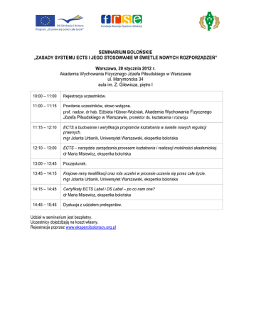 SEMINARIUM BOLOŃSKIE „ZASADY SYSTEMU ECTS I JEGO STOSOWANIE W ŚWIETLE NOWYCH ROZPORZĄDZEŃ” Warszawa, 20 stycznia 2012 r. Akademia Wychowania Fizycznego Józefa Piłsudskiego w Warszawie ul. Marymoncka 34 aula im. Z. Gilewicza, piętro I 10:00 – 11:00 Rejestracja uczestników. 11:00 – 11:15 Powitanie uczestników, słowo wstępne. prof. nadzw. dr hab. ElŜbieta Hübner-Woźniak, Akademia Wychowania Fizycznego Józefa Piłsudskiego w Warszawie, prorektor ds. kształcenia i rozwoju 11:15 – 12:10 ECTS a budowanie i weryfikacja programów kształcenia w świetle nowych regulacji prawnych. mgr Jolanta Urbanik, Uniwersytet Warszawski, ekspertka bolońska 12:10 – 13:00 ECTS – narzędzie zarządzania procesem kształcenia i realizacji mobilności akademickiej. dr Maria Misiewicz, ekspertka bolońska 13:00 – 13:45 Poczęstunek. 13:45 – 14:15 Krajowe ramy kwalifikacji oraz rola uczelni w procesie uczenia się przez całe Ŝycie. mgr Jolanta Urbanik, Uniwersytet Warszawski, ekspertka bolońska 14:15 – 14:45 Certyfikaty ECTS Label i DS Label – po co nam one? dr Maria Misiewicz, ekspertka bolońska 14:45 – 15:45 Dyskusja z udziałem prelegentów. Udział w seminarium jest bezpłatny. Uczestnicy dojeŜdŜają na koszt własny. Rejestracja poprzez www.ekspercibolonscy.org.pl