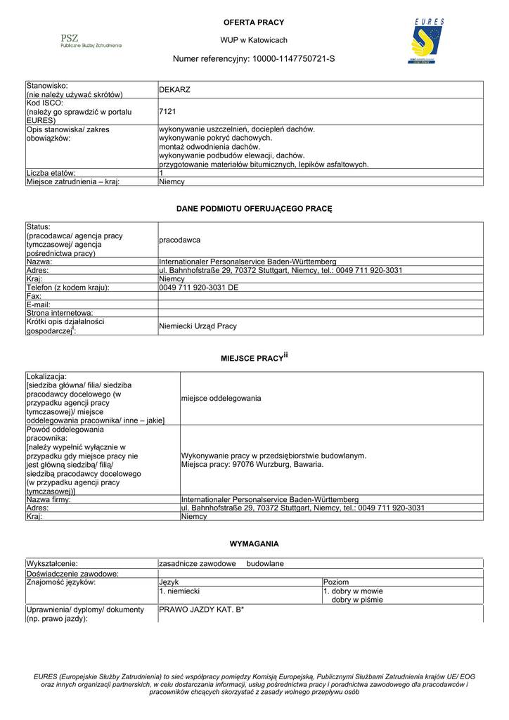 OFERTA PRACY WUP w Katowicach Numer referencyjny: 10000-1147750721-S Stanowisko: (nie należy używać skrótów) Kod ISCO: (należy go sprawdzić w portalu EURES) Opis stanowiska/ zakres obowiązków: Liczba etatów: Miejsce zatrudnienia – kraj: DEKARZ 7121 wykonywanie uszczelnień, dociepleń dachów. wykonywanie pokryć dachowych. montaż odwodnienia dachów. wykonywanie podbudów elewacji, dachów. przygotowanie materiałów bitumicznych, lepików asfaltowych. 1 Niemcy DANE PODMIOTU OFERUJĄCEGO PRACĘ Status: (pracodawca/ agencja pracy tymczasowej/ agencja pośrednictwa pracy) Nazwa: Adres: Kraj: Telefon (z kodem kraju): Fax: E-mail: Strona internetowa: Krótki opis działalności gospodarczeji: pracodawca Internationaler Personalservice Baden-Württemberg ul. Bahnhofstraße 29, 70372 Stuttgart, Niemcy, tel.: 0049 711 920-3031 Niemcy 0049 711 920-3031 DE Niemiecki Urząd Pracy MIEJSCE PRACYii Lokalizacja: [siedziba główna/ filia/ siedziba pracodawcy docelowego (w przypadku agencji pracy tymczasowej)/ miejsce oddelegowania pracownika/ inne – jakie] Powód oddelegowania pracownika: [należy wypełnić wyłącznie w przypadku gdy miejsce pracy nie jest główną siedzibą/ filią/ siedzibą pracodawcy docelowego (w przypadku agencji pracy tymczasowej)] Nazwa firmy: Adres: Kraj: miejsce oddelegowania Wykonywanie pracy w przedsiębiorstwie budowlanym. Miejsca pracy: 97076 Wurzburg, Bawaria. Internationaler Personalservice Baden-Württemberg ul. Bahnhofstraße 29, 70372 Stuttgart, Niemcy, tel.: 0049 711 920-3031 Niemcy WYMAGANIA Wykształcenie: Doświadczenie zawodowe: Znajomość języków: zasadnicze zawodowe Uprawnienia/ dyplomy/ dokumenty (np. prawo jazdy): PRAWO JAZDY KAT. B* Język 1. niemiecki budowlane Poziom 1. dobry w mowie dobry w piśmie EURES (Europejskie Służby Zatrudnienia) to sieć współpracy pomiędzy Komisją Europejską, Publicznymi Służbami Zatrudnienia krajów UE/ EOG oraz innych organizacji partnerskich, w celu dostarczania informacji, usług pośrednictwa pracy i poradnictwa zawodowego dla pracodawców i pracowników chcących skorzystać z zasady wolnego przepływu osób Inne istotne wymagania: konieczne wykształcenie budowlane w branży pokryć dachowych, izolacji dachowych lub pokrewne. pożądane doświadczenie zawodowe. konieczne prawo jazdy kat. B w celu dojazu do klientów. Prawo jazdy kat. C1E będzie atutem. konieczna min. komunikatywna znajomość języka niemieckiego. WYNAGRODZENIE I WARUNKI ZATRUDNIENIA Wysokość pensji brutto: Wysokość pensji netto: Waluta, w jakiej wypłacana jest pensja: Rodzaj stawki wynagrodzenia: (godzinowa/ tygodniowa/ miesięczna/ roczna/ inna) Premie: Dodatkowe świadczenia (zakwaterowanie, wyżywienie, koszty związane ze zmianą miejsca zamieszkania, koszty podróży itp.): Nazwa firmy, z którą zostanie podpisana umowa: Rodzaj umowy: (umowa o pracę, umowa zlecenia, wolontariat, praktyka zawodowa/ staż, praca zdalna, agencja pracy tymczasowej, inne): Wymiar czasu pracy (praca na pełen etat/ część etatu): Czas trwania umowy: (nieokreślony/ określony) 2.595,00 Liczba godzin tygodniowo: Zmiany i praca w dni wolne: Data rozpoczęcia: Inne informacje: 40,00 Brak zmianowości. 2017-02-03 Całoroczne zatrudnienie bez przerw w sezonie zimowym. Euro Czasowy ze stawką miesięczną Wynagrodzenie: € 2595 brutto / miesiąc. Brak układu zbiorowego pracy. Pracodawca pomaga w poszukiwaniu zakwaterowania oraz w postępowaniach przed niemieckimi urzędami związanych z organizacją pobytu. Internationaler Personalservice Baden-Württemberg umowa o pracę pełny etat nieokreślony Data wygaśnięcia umowy (w przypadku umowy na czas określony): 2017-12-31 SPOSÓB SKŁADANIA WNIOSKU Wymagane dokumenty (list motywacyjny, CV itp.): Język, w którym muszą być sporządzone przedkładane dokumenty: Do kogo należy wysłać dokumenty: (do pracodawcy/ doradcy EURES) Gdzie należy wysłać dokumenty: (adres, adres e-mail, nr faksu z kodem kraju itp.) Dane teleadresowe doradcy EURES lub przedstawiciela pracodawcy: (nazwisko, adres, telefon, fax, e-mail itp.) CV wraz z dokumentami potwierdzającymi kwalifikacje (świadectwa, uprawnienia) niemiecki do doradcy EURES z EOG e-mail wraz z podaniem numeru referencyjnego oferty: SB- 235. [email protected] Bundesagentur für Arbeit Zentrale Auslands- und Fachvermittlung (ZAV) Bahnhofstraße 29 70372 Stuttgart DODATKOWE INFORMACJE Skontaktujemy się z wybranymi kandydatami. Pracodawca chętnie skontaktuje się telefonicznie poprzez Skype. WAŻNOŚĆ 2017-02-03 Data publikacji: Termin przedkładania podań o pracę / 2017-12-31 zakończenia ważności oferty: Uprzejmie informujemy, że skontaktujemy się wyłącznie z wybranymi kandydatami. UWAGA: EURES (Europejskie Służby Zatrudnienia) to sieć współpracy pomiędzy Komisją Europejską, Publicznymi Służbami Zatrudnienia krajów UE/ EOG oraz innych organizacji partnerskich, w celu dostarczania informacji, usług pośrednictwa pracy i poradnictwa zawodowego dla pracodawców i pracowników chcących skorzystać z zasady wolnego przepływu osób 1. Umowa z zagranicznym pracodawcą jest zawierana, co do zasady, zgodnie z prawem kraju zatrudnienia. Oznacza to, że wszystkie roszczenia odnośnie warunków, które obejmuje umowa, można kierować wyłącznie do odpowiedniego sądu w kraju zatrudnienia. Publiczne służby zatrudnienia (EURES) nie mogą pośredniczyć ani reprezentować pracownika w sądzie kraju zatrudnienia w przypadku sporu z pracodawcą. 2. Publiczne służby zatrudnienia (EURES) dokładają wszelkich starań, aby zapewnić rzetelność i wiarygodność ofert pracy zgłoszonych w lokalnym urzędzie pracy. Należy wyjaśnić, że oferta pracy została zgłoszona przez stronę trzecią i EURES nie odpowiada za ewentualne rozbieżności między warunkami pracy określonymi w ofercie pracy i warunkami oferowanymi przez potencjalnego pracodawcę. 3. Publiczne służby zatrudnienia (EURES) informują, że będą zbierać, 
