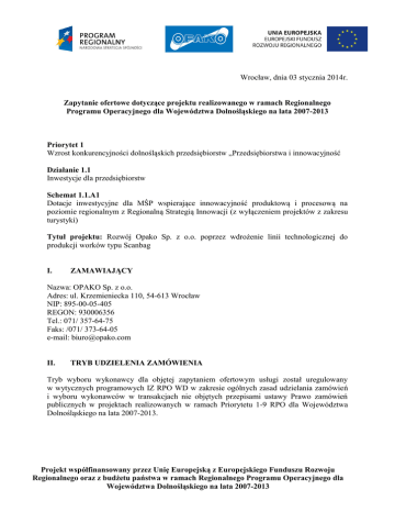 Wrocław, dnia 03 stycznia 2014r. Zapytanie ofertowe dotyczące projektu realizowanego w ramach Regionalnego Programu Operacyjnego dla Województwa Dolnośląskiego na lata 2007-2013 Priorytet 1 Wzrost konkurencyjności dolnośląskich przedsiębiorstw „Przedsiębiorstwa i innowacyjność Działanie 1.1 Inwestycje dla przedsiębiorstw Schemat 1.1.A1 Dotacje inwestycyjne dla MŚP wspierające innowacyjność produktową i procesową na poziomie regionalnym z Regionalną Strategią Innowacji (z wyłączeniem projektów z zakresu turystyki) Tytuł projektu: Rozwój Opako Sp. z o.o. poprzez wdrożenie linii technologicznej do produkcji worków typu Scanbag I. ZAMAWIAJĄCY Nazwa: OPAKO Sp. z o.o. Adres: ul. Krzemieniecka 110, 54-613 Wrocław NIP: 895-00-05-405 REGON: 930006356 Tel.: 071/ 357-64-75 Faks: /071/ 373-64-05 e-mail: [email protected] II. TRYB UDZIELENIA ZAMÓWIENIA Tryb wyboru wykonawcy dla objętej zapytaniem ofertowym usługi został uregulowany w wytycznych programowych IZ RPO WD w zakresie ogólnych zasad udzielania zamówień i wyboru wykonawców w transakcjach nie objętych przepisami ustawy Prawo zamówień publicznych w projektach realizowanych w ramach Priorytetu 1-9 RPO dla Województwa Dolnośląskiego na lata 2007-2013. Projekt współfinansowany przez Unię Europejską z Europejskiego Funduszu Rozwoju Regionalnego oraz z budżetu państwa w ramach Regionalnego Programu Operacyjnego dla Województwa Dolnośląskiego na lata 2007-2013 III. OPIS PRZEDMIOTU ZAMÓWIENIA Przedmiotem zamówienie jest dopalacz gazów odlotowych (1 sztuka). Dopalacz (katalityczny lub termiczny) do redukcji lotnych związków organicznych powstających przy podstawowej produkcji wraz z opcją magazynowania i zagospodarowania ciepła powstającego w procesie utleniania par rozpuszczalników z możliwością wykorzystania do ogrzewania w procesach technologicznych lub socjalnych. Kryterium techniczne Maksymalne wartości brzegowe zakupywanych urządzeń: Dopalacz: Przepływ dostosowany do redukcji: o mieszanki rozpuszczalników: etanol 85% octan etylu 10% etoksypropanol 5% o do 160 kg/h w okresie szczytowym (maksymalnie przez 2 godziny) o 300 T w/w rozpuszczalników rocznie tryb pracy – ciągły (tzw. czterobrygadówka) – średnio 300 dni pracy w roku Redukcja LZO zapewniająca emisję ≤ 50 mgCorg/m3 Wyposażenie dodatkowe (prosimy o podanie kosztu i producenta): - system zdalnego (internet) monitorowania parametrów pracy dopalacza i serwisowania przez dostawcę Wyposażenie dodatkowe (do wykorzystania, jeżeli będzie to uzasadnione rachunkiem ekonomicznym): Instalacja do odzysku i gromadzenia ciepła z powietrza wylotowego dopalacza z wymiennikiem ciepła do celów technologicznych (np. nagrzewania powietrza w suszarkach drukarek) lub centralnego ogrzewania: 1. Z wymiennikiem na roztwór wodno-glikolowy o temperaturze pracy do 95°C lub 2. Z innym systemem magazynowania i odzysku ciepła. Oferujący zobowiązany jest przedstawić wielkości zapotrzebowania na media oraz materiały eksploatacyjne; dla pracy normalnej, postojowej i rozruchu (pod rygorem nieuwzględnienia oferty). IV. WARUNKI UDZIAŁU W POSTĘPOWANIU Zamawiający nie dopuszcza składania ofert częściowych. Projekt współfinansowany przez Unię Europejską z Europejskiego Funduszu Rozwoju Regionalnego oraz z budżetu państwa w ramach Regionalnego Programu Operacyjnego dla Województwa Dolnośląskiego na lata 2007-2013 Kryterium, którym kierować się będzie Zamawiający przy wyborze najkorzystniejszej oferty wskazano w punkcie VI. Oferent powinien przedstawić wszystkie wymagane informacje pozwalające ocenić jego ofertę w ramach ww. kryteriów. V. TERMINI MIEJSCE WYKONANIA ZAMÓWIENIA Nazwa: OPAKO Sp. z o.o. Adres: ul. Krzemieniecka 110, 54-613 Wrocław NIP: 895-00-05-405 REGON: 930006356 Tel.: 071/ 357-64-75 Faks: /071/ 373-64-05 e-mail: [email protected] VI. KRYTERIA WYBORU OFERTY Zamawiający dokona oceny ofert na podstawie wyniku osiągniętej liczby punktów wyliczonych w oparciu o następujące kryteria i ustaloną punktację do 100 pkt (100% = 100 pkt) a) Punkty za kryterium „Cena netto” zostaną obliczone wg. następującego wzoru: Cena oferty najtańszej ----------------------------- x 75 Cena oferty badanej = liczba punktów „Cena netto” zawierać będzie zarówno koszt zakupu (czyli: wartość urządzenia, koszt transportu (loco Opako Wrocław), koszt kompletnego montażu z uruchomieniem (zatwierdzonym protokołem odbiorczym) i opcjonalnie, pełnego szkolenia operatorów do stopnia samodzielnej obsługi maszyny – prosimy o podanie kosztów poszczególnych pozycji), jak i koszt eksploatacji (wg podanego przez oferujących zapotrzebowania na media i materiały eksploatacyjne), liczone w okresie 10 lat działania, przy założeniu 300 dni pracy w trybie tzw. „czterobrygadówki” w roku, średnio. b) Punkty za kryterium „Czas reakcji serwisu” zostaną obliczone wg. następującego wzoru: Czas reakcji serwisu (liczba godzin) najkrótszy --------------------------------------------------------------Czas reakcji serwisu (liczba godzin) ofert badanej x 10 = liczba punktów Projekt współfinansowany przez Unię Europejską z Europejskiego Funduszu Rozwoju Regionalnego oraz z budżetu państwa w ramach Regionalnego Programu Operacyjnego dla Województwa Dolnośląskiego na lata 2007-2013 c) Punkty za kryterium „Cena godziny serwisowej” zostaną obliczone wg. następującego wzoru: Cena godziny serwisowej najniższa ---------------------------------------------------Cena godziny serwisowej ofert badanej x 10 = liczba punktów d) Punkty za kryterium „Termin dostawy” zostaną obliczone wg. następującego wzoru: Termin dostawy - najkrótszy --------------------------------------- x Termin dostawy – oferty badanej 5 = liczba punktów Liczby punktów za poszczególne kryteria zostaną zsumowane i będą stanowić końcową ocenę oferty. Za najkorzystniejszą zostanie uznana oferta, która 