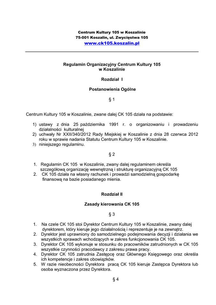 www.ck105.koszalin.pl Regulamin Organizacyjny Centrum Kultury