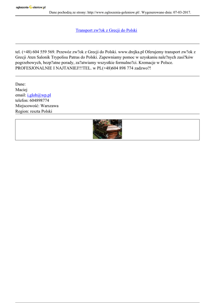 Dane pochodzą ze strony: http://www.ogloszenia-goleniow.pl/. Wygenerowano dnia: 07-03-2017. Transport zw?ok z Grecji do Polski tel. (+48) 604 559 569. Przewóz zw?ok z Grecji do Polski. www.drejka.pl Oferujemy transport zw?ok z Grecji Aten Salonik Trypolisu Patras do Polski. Zapewniamy pomoc w uzyskaniu nale?nych zasi?ków pogrzebowych, bezp?atne porady, za?atwiamy wszystkie formalno?ci. Kremacje w Polsce. PROFESJONALNIE I NAJTANIEJ!!!TEL. w PL(+48)604 898 774 zadzwo?! Dane: Maciej email: [email protected] telefon: 604898774 Miejscowość: Warszawa Region: reszta Polski