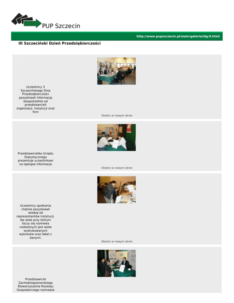 PUP Szczecin http://www.pupszczecin.pl/main/galeria/idg:9.html III Szczeciński Dzień Przedsiębiorczości Uczestnicy 3 Szczecińskiego Dnia Przedsiębiorczości pozyskiwali informację bezpośrednio od przedstawicieli organizacji, instytucji oraz firm Otwórz w nowym oknie Przedstawicielka Urzędu Statystycznego prezentuje uczestnikowi na laptopie informacje Otwórz w nowym oknie Uczestnicy spotkania chętnie pozyskiwali wiedzę od reprezentantów instytucji. Na stole przy którym toczy się rozmowa rozłożonych jest wiele wydrukowanych wykresów oraz tabel z danymi. Otwórz w nowym oknie Przedstawiciel Zachodniopomorskiego Stowarzyszenia Rozwoju Gospodarczego rozmawia z uczestniczkami spotkania Otwórz w nowym oknie Uczestniczka spotkania rozmawia z przedstawicielami instytucji trzymając w dłoniach folder reklamowy Otwórz w nowym oknie Przedstawiciele Zakładu Ubezpieczeń Społecznych przekazują informację uczestnikowi Otwórz w nowym oknie Uczestnicy spotkania przeglądają kolorowe foldery Otwórz w nowym oknie Przedstawiciele i uczestnicy 3 Szczecińskiego Dnia Przedsiębiorczości Otwórz w nowym oknie Przedstawiciele Powiatowego Urzędu Pracy w Szczecinie informują uczestników spotkania o zakresie usług jakie oferuje PUP Otwórz w nowym oknie Przedstawiciele i uczestnicy 3 Szczecińskiego Dnia Przedsiębiorczości Otwórz w nowym oknie Przedstawicielka Referatu Działalności Gospodarczej Urzędu Miasta Szczecina podczas rozmowy z uczestnikiem spotkania Otwórz w nowym oknie Przedstawiciele Wojewódzkiego Urzędu Pracy w Szczecinie w trakcie rozmowy z uczestnikiem 3 Szczecińskiego Dnia Przedsiębiorczości Otwórz w nowym oknie Młodzi uczestnicy spotkania w trakcie rozmowy z przedstawicielką akademickiego inkubatora przedsiębiorczości Uniwersytetu Szczecińskiego Otwórz w nowym oknie