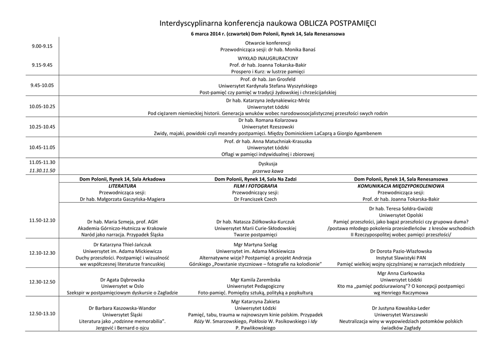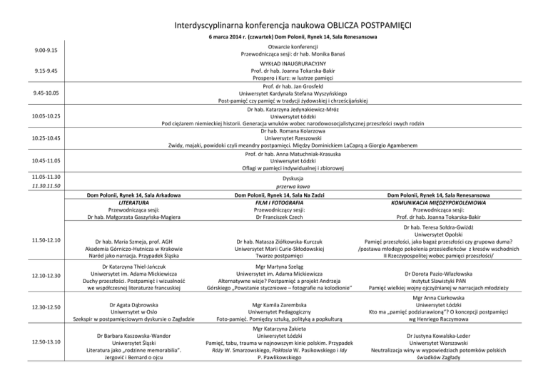 Interdyscyplinarna konferencja naukowa OBLICZA POSTPAMIĘCI 6 marca 2014 r. (czwartek) Dom Polonii, Rynek 14, Sala Renesansowa Otwarcie konferencji Przewodnicząca sesji: dr hab. Monika Banaś 9.00-9.15 9.15-9.45 9.45-10.05 10.05-10.25 10.25-10.45 10.45-11.05 WYKŁAD INAUGRURACYJNY Prof. dr hab. Joanna Tokarska-Bakir Prospero i Kurz: w lustrze pamięci Prof. dr hab. Jan Grosfeld Uniwersytet Kardynała Stefana Wyszyńskiego Post-pamięć czy pamięć w tradycji żydowskiej i chrześcijańskiej Dr hab. Katarzyna Jedynakiewicz-Mróz Uniwersytet Łódzki Pod ciężarem niemieckiej historii. Generacja wnuków wobec narodowosocjalistycznej przeszłości swych rodzin Dr hab. Romana Kolarzowa Uniwersytet Rzeszowski Zwidy, majaki, powidoki czyli meandry postpamięci. Między Dominickiem LaCaprą a Giorgio Agambenem Prof. dr hab. Anna Matuchniak-Krasuska Uniwersytet Łódzki Oflagi w pamięci indywidualnej i zbiorowej 11.05-11.30 Dyskusja przerwa kawa Dom Polonii, Rynek 14, Sala Na Zadzi FILM I FOTOGRAFIA Przewodniczący sesji: Dr Franciszek Czech Dom Polonii, Rynek 14, Sala Renesansowa KOMUNIKACJA MIĘDZYPOKOLENIOWA Przewodnicząca sesji: Prof. dr hab. Joanna Tokarska-Bakir Dr hab. Maria Szmeja, prof. AGH Akademia Górniczo-Hutnicza w Krakowie Naród jako narracja. Przypadek Śląska Dr hab. Natasza Ziółkowska-Kurczuk Uniwersytet Marii Curie-Skłodowskiej Twarze postpamięci Dr hab. Teresa Sołdra-Gwiżdż Uniwersytet Opolski Pamięć przeszłości, jako bagaż przeszłości czy grupowa duma? /postawa młodego pokolenia przesiedleńców z kresów wschodnich II Rzeczypospolitej wobec pamięci przeszłości/ Dr Katarzyna Thiel-Jańczuk Uniwersytet im. Adama Mickiewicza Duchy przeszłości. Postpamięć i wizualność we współczesnej literaturze francuskiej Mgr Martyna Szeląg Uniwersytet im. Adama Mickiewicza Alternatywne wizje? Postpamięć a projekt Andrzeja Górskiego „Powstanie styczniowe – fotografie na kolodionie” Dr Dorota Pazio-Wlazłowska Instytut Slawistyki PAN Pamięć wielkiej wojny ojczyźnianej w narracjach młodzieży Dr Agata Dąbrowska Uniwersytet w Oslo Szekspir w postpamięciowym dyskursie o Zagładzie Mgr Kamila Zarembska Uniwersytet Pedagogiczny Foto-pamięć. Pomiędzy sztuką, polityką a popkulturą Mgr Anna Ciarkowska Uniwersytet Łódzki Kto ma „pamięć podziurawioną”? O koncepcji postpamięci wg Henriego Raczymowa Dr Barbara Kaszowska-Wandor Uniwersytet Śląski Literatura jako „rodzinne memorabilia”. Jergović i Bernard o ojcu Mgr Katarzyna Żakieta Uniwersytet Łódzki Pamięć, tabu, trauma w najnowszym kinie polskim. Przypadek Róży W. Smarzowskiego, Pokłosia W. Pasikowskiego i Idy P. Pawlikowskiego Dr Justyna Kowalska-Leder Uniwersytet Warszawski Neutralizacja winy w wypowiedziach potomków polskich świadków Zagłady 11.30.11.50 Dom Polonii, Rynek 14, Sala Arkadowa LITERATURA Przewodnicząca sesji: Dr hab. Małgorzata Gaszyńska-Magiera 11.50-12.10 12.10-12.30 12.30-12.50 12.50-13.10 13.10-13.30 13.30-13.50 14.00-15.30 15.30-15.50 15.50-16.10 16.10-16.30 16.30-16.50 16.50-17.10 17.10-17.30 17.30-17.50 17.50-18.10 18.10-18.30 18.30 Dr hab. Monika Banaś Uniwersytet Jagielloński Między norwegizacją i szwedyzacją. Proces rekonstrukcji samskiej tożsamości na początku XXI wieku Dr Piotr Kletowski Uniwersytet Jagielloński „Zbudować nowe Niemcy” - przepracowanie tematu wojny i hitleryzmu w "Nowym Kinie" niemieckim i współczesnych produkcjach filmowych znad Renu Dr Joanna Kabrońska Politechnika Gdańska Dzieło sztuki jako manifestacja postpamięci Dyskusja przerwa obiadowa NOWE MEDIA Przewodniczący sesji: Prof. dr hab. Tadeusz Paleczny Dyskusja przerwa obiadowa CIAŁO Przewodniczący sesji: Dr hab. Leszek Korporowicz Dyskusja przerwa obiadowa NARRACJE KOBIECE Przewodnicząca sesji: Dr Elżbieta Wiącek Dr Anna Kadykało Uniwersytet Jagielloński Kształtowanie pamięci o masowych represjach w rosyjskiej przestrzeni internetowej Dr hab. Jan Kajfosz Uniwersytet Śląski Reprezentacja legitymizująca i legitymizowana, czyli obraz przeszłości w percepcji magiczno-mitycznej Dr Małgorzata Okupnik Akademia Muzyczna im. I.J. Paderewskiego „Czy to jest zamiast, w zastępstwie zagłady?” O postpamięci w sytuacji śmiertelnej choroby Dr hab. Marek Kaźmierczak Uniwersytet im. Adama Mickiewicza Hipertekst jako medium postpamięci Dr Dorota Sajewska Uniwersytet Warszawski Ciało jako medium postpamięci we współczesnych praktykach rekonstrukcyjnych Dr Sylwia Karolak Uniwersytet im. Adama Mickiewicza Kobiece narracje postmemorialne Mgr Tomasz Szczęsny Uniwersytet Łódzki Wirtualna wojna Jacka Bławuta, czyli postpamięć w erze nowych mediów Mgr Sylwia Chutnik Uniwersytet Warszawski Post ciało. Projekt Dr Anna Włodarczyk Uniwersytet Jagielloński Kobiece ślady postpamięci w literaturze najnowszej. Miejsca. Emblematy. Przemilczenia Dyskusja przerwa kawa ETNICZNOŚĆ Przewodniczący sesji: Dr Wojciech Mazur Mgr Barbara Weżgowiec Uniwersytet Jagielloński Zaczyna się od domu. Tropami postpamięci we współczesnej prozie polskiej o polsko-niemieckim pograniczu Dyskusja przerwa kawa ARCHITEKTURA Przewodniczący sesji: Dr Piotr Winskowski Dyskusja przerwa kawa KOMERCJALIZACJA Przewodniczący sesji: Prof. UJ dr hab. Piotr Biliński Dr hab. Aurelia Kotkiewicz Uniwersytet Pedagogiczny Dom nad rzeką Moskwą i pamięć wielkiego terroru Dr Anna Czerner, Dr Elżbieta Nieroba Uniwersytet Opolski Postpamięć zinstytucjonalizowana – analiza jawnych i ukrytych funkcji ekspozycji muzealnej Dr hab. Beata Gaj Uniwersytet Opolski Post silesiae memoriam. Śląsk jako semantyczne nieporozumienie Dr Agnieszka Gębczyńska-Janowicz Politechnika Gdańska Historia II wojny światowej wpisana w krajobraz pamięci miast Dr Magdalena Banaszkiewicz Uniwersytet Jagielloński Post-pamięć „ciemnej turystyki”. O narracjach, etyce i doświadczaniu przeszłości Dr Karolina Golemo Uniwersytet Jagielloński Wspomnienie o kraju pochodzenia zapisane dźwi
