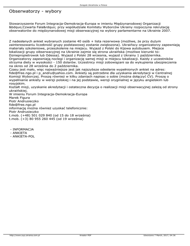 Związek Ukraińców w Polsce Obserwatorzy - wybory Stowarzyszenie Forum Integracja-Demokracja-Europa w imieniu Międzynarodowej Organizacji „Czwarta Fala” przy współudziale Komitetu Wyborców Ukrainy rozpoczyna rekrutację obserwatorów do międzynarodowej misji obserwacyjnej na wybory parlamentarne na Ukrainie 2007. Z nadesłanych ankiet wybranych zostanie 40 osób + lista rezerwowa (możliwe, że przy dużym zainteresowaniu liczebność grupy podstawowej zostanie zwiększona). Ukraińscy organizatorzy zapewniają materiały szkoleniowe, przeszkolenie na miejscu. Wyjazd z Polski do Kijowa autobusem. Miejsce lokalizacji grupy oibserwacyjnej na Ukrainie zajmie się strona ukraińska (możliwe kierunki to: Dzniepropietrowsk lub Odessa). Wyjazd z Polski 28 wrzesnia, wyjazd z Ukrainy 1 października. Organizatorzy zapewniają noclegi i organizację samej misji w miejscu lokalizacji. Każdy z uczestników otrzyma diety w wysokości - 150 dolarów. Uczestnicy misji zobowiązani sa do wykupienia ubezpieczenia na okres od 28 września do 2 października. Czasu jest mało, więc najważniejsze jest jak najszybsze odesłanie wypełnionych ankiet na adres: [email protected] i [email protected]. Ankiety są potrzebne dla uzyskania akredytacji w Centralnej Komisji Wyborczej. Proszę również w kilku zdaniach napisac o sobie (można dołączyć CV). Proszę o wypełnianie ankiety w wersji polskiej i na jej podstawie, wersji oryginalnej w języku angielskim lub rosyjskim. Kształt misji, uzyskanie akredytacji i ostateczna decyzja o realizacji misji obserwacyjnej zależą od strony ukraińskiej. W imieniu Forum Integracja-Demokracja-Europa Marek Figura Piotr Andrusieczko [email protected] informację można również uzyskać telefonicznie: Piotr Andrusieczko t.mob. (+48) 501 029 840 (od 15 do 18 września) t.mob. (+3) 80 955 260 445 (od 19 września) - INFORMACJA - ANKIETA - ANKIETA-POL http://www.zup.ukraina.com.pl Kreator PDF Utworzono 7 March, 2017, 04:36
