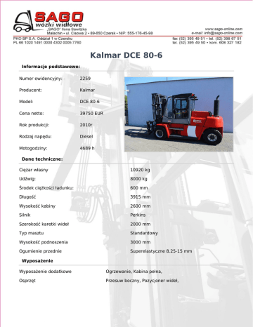 Kalmar DCE 80-6 Informacje podstawowe: Numer ewidencyjny: 2259 Producent: Kalmar Model: DCE 80-6 Cena netto: 39750 EUR Rok produkcji: 2010r Rodzaj napędu: Diesel Motogodziny: 4689 h Dane techniczne: Ciężar własny 10920 kg Udźwig: 8000 kg Środek ciężkości ładunku: 600 mm Długość 3915 mm Wysokość kabiny 2600 mm Silnik Perkins Szerokość karetki wideł 2000 mm Typ masztu Standardowy Wysokość podnoszenia 3000 mm Ogumienie przednie Superelastyczne 8.25-15 mm Wyposażenie Wyposażenie dodatkowe Ogrzewanie, Kabina pełna, Osprzęt Przesuw boczny, Pozycjoner wideł,