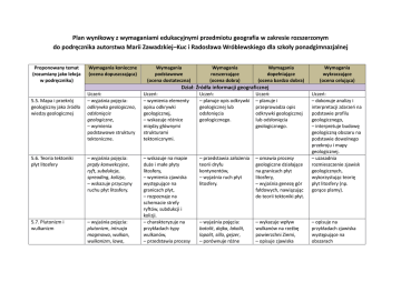 Plan wynikowy z wymaganiami edukacyjnymi przedmiotu geografia w zakresie rozszerzonym do podręcznika autorstwa Marii Zawadzkiej–Kuc i Radosława Wróblewskiego dla szkoły ponadgimnazjalnej Proponowany temat (rozumiany jako lekcja w podręczniku) Wymagania konieczne (ocena dopuszczająca) Wymagania podstawowe (ocena dostateczna) Wymagania rozszerzające (ocena dobra) Wymagania dopełniające (ocena bardzo dobra) Wymagania wykraczające (ocena celująca) Dział: Źródła informacji geograficznej Uczeo: – wyjaśnia pojęcia: odkrywka geologiczna, odsłonięcie geologiczne, – wymienia podstawowe struktury tektoniczne. Uczeo: – wymienia elementy opisu odkrywki geologicznej, – wskazuje różnice między głównymi strukturami tektonicznymi. Uczeo: – planuje opis odkrywki geologicznej lub odsłonięcia geologicznego. Uczeo: – planuje i przeprowadza opis odkrywki geologicznej lub odsłonięcia geologicznego. 5.6. Teoria tektoniki płyt litosfery – wyjaśnia pojęcia: prądy konwekcyjne, ryft, subdukcja, spreading, kolizja, – wskazuje przyczyny ruchu płyt litosfery. – przedstawia założenia teorii dryfu kontynentów, – wyjaśnia ruch płyt litosfery. – omawia procesy geologiczne działające na granicach płyt litosfery, – wyjaśnia genezę gór fałdowych, nawiązując do teorii tektoniki płyt. 5.7. Plutonizm i wulkanizm – wyjaśnia pojęcia: plutonizm, intruzja magmowa, wulkan, wulkanizm, lawa, – wskazuje na mapie duże i małe płyty litosfery, – wymienia zjawiska występujące na granicach płyt, – rozpoznaje na schemacie strefy ryftów, subdukcji i kolizji. – charakteryzuje na przykładach typy wulkanów, – przedstawia procesy – wyjaśnia pojęcia: batolit, dajka, lakolit, lopolit, silla, gejzer, – porównuje różne – wykazuje wpływ wulkanów na rzeźbę powierzchni Ziemi, – opisuje zjawiska 5.5. Mapa i przekrój geologiczny jako źródło wiedzy geologicznej Uczeo: – dokonuje analizy i interpretacji zdarzeo na podstawie profilu geologicznego, – interpretuje budowę geologiczną obszaru na podstawie dowolnego przekroju i mapy geologicznej. – uzasadnia rozmieszczenie zjawisk geologicznych, wykorzystując teorię płyt litosfery (np. gorące plamy). – opisuje na przykładach zjawiska występujące na obszarach 5.8. Trzęsienia ziemi 5.9. Procesy górotwórcze. Pionowe ruchy litosfery 5.10. Wietrzenie magma, krater, materiał piroklastyczny, stratowulkan, – omawia występowanie wulkanów na Ziemi, – wymienia produkty erupcji wulkanicznych. – wyjaśnia pojęcia: epicentrum, hipocentrum, fala sejsmiczna, sejsmograf, – wskazuje obszary sejsmiczne, pensejsmiczne i asejsmiczne na Ziemi. plutoniczne, – wskazuje na mapie świata przykłady obszarów wulkanicznych. formy intruzji magmowych, – przedstawia przebieg erupcji wulkanu, – charakteryzuje produkty erupcji wulkanicznych. występujące na obszarach wulkanicznych. – przedstawia przyczyny trzęsieo ziemi, – podaje różnice między hipocentrum a epicentrum. – omawia przebieg trzęsienia ziemi, – klasyfikuje trzęsienia ziemi ze względu na ich genezę. – wykazuje wpływ trzęsieo ziemi na jej rzeźbę powierzchni, – wyjaśnia związek między występowaniem obszarów trzęsieo ziemi a występowaniem zjawisk wulkanicznych oraz granicami płyt litosfery. – wyjaśnia pojęcia: górotwór, orogeneza, góry fałdowane, zrębowe, wulkaniczne, izostazja, uchy epejrogeniczne, – wskazuje obszary występowania ruchów skorupy ziemskiej, – wymienia podstawowe rodzaje gór. – wyjaśnia pojęcia: – wyjaśnia przyczyny ruchów skorupy ziemskiej, – wskazuje na mapie przykłady różnych rodzajów gór, – wymienia różnice między górami fałdowymi a zrębowymi. – wyjaśnia pojęcia: geosynklina, flisz, – charakteryzuje powstawanie różnych rodzajów gór, – podaje dowody istnienia ruchów skorupy ziemskiej, – porównuje ruchy izostatyczne i epejrogeniczne. – wykazuje wpływ ruchów skorupy ziemskiej na życie i gospodarkę człowieka. – wykazuje zależnośd – charakteryzuje – charakteryzuje wulkanicznych i postwulkanicznych, – wykazuje i uzasadnia negatywny i pozytywny wpływ zjawisk wulkanicznych na środowisko geograficzne. – formułuje związek między przebiegiem trzęsienia ziemi a jego potencjalnymi skutkami w zależności od odległości od epicentrum i jego zagospodarowania, – proponuje konkretne działania przeciwdziałające skutkom trzęsieo ziemi. – formułuje zależnośd między rozmieszczeniem geosynklin a występowaniem stref subdukcji, – opisuje zanik geosynklin. – formułuje przykłady 5.11. Zjawiska krasowe 5.12. Grawitacyjne ruchy masowe skał 5.13. Działalnośd rzek wietrzenie, zwietrzelina, wietrzenie fizyczne (rozpad blokowy, rozpad ziarnisty), chemiczne i biologiczne, – wyjaśnia, dlaczego wietrzenie nie powoduje zmian rzeźby, ale je przygotowuje. – wyjaśnia pojęcia: kras, kras powierzchniowy, kras podziemny, jaskinia, stalaktyty, stalagmity, stalagnaty, – wymienia formy krasu powierzchniowego, – wymienia formy krasu podziemnego. typu wietrzenia od strefy klimatów, – wymienia czynniki wpływające na przebieg wietrzenia: fizycznego, chemicznego i biologicznego. rodzaje wietrzenia (fizyczne, chemiczne i biologiczne). wietrzenie fizyczne, chemiczne i biologiczne oraz przedstawia efekty ich działania. zależności między rodzajem, tempem przebiegu i efektów wietrzenia od typu klimatu. – wymienia czynniki wpływające na tempo procesów krasowych, – wykazuje przyczyny rozpuszczania skał węglanowych przez wodę, – podaje przykłady obszarów na Ziemi, gdzie występują zjawiska krasowe. – wyjaśnia pojęcia: – wymienia przyczyny grawitacyjne ruchy dominujących ruchów masowe, odpadanie, masowych, obrywanie, osuwanie, – omawia efekt spływanie, spełzywanie, rzeźbotwórczy działania – podaje nazwy dominujących ruchów grawitacyjnych ruchów masowych skał. masowych skał. – ro