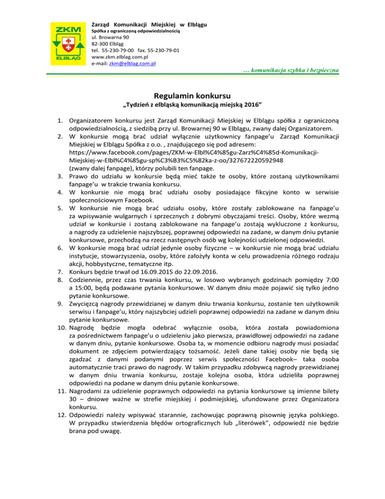 Zarząd Komunikacji Miejskiej w Elblągu Spółka z ograniczoną odpowiedzialnością ul. Browarna 90 82-300 Elbląg tel. 55-230-79-00 fax. 55-230-79-01 www.zkm.elblag.com.pl e-mail: [email protected] … komunikacja szybka i bezpieczna Regulamin konkursu „Tydzień z elbląską komunikacją miejską 2016” 1. Organizatorem konkursu jest Zarząd Komunikacji Miejskiej w Elblągu spółka z ograniczoną odpowiedzialnością, z siedzibą przy ul. Browarnej 90 w Elblągu, zwany dalej Organizatorem. 2. W konkursie mogą brać udział wyłącznie użytkownicy fanpage’u Zarząd Komunikacji Miejskiej w Elblągu Spółka z o.o. , znajdującego się pod adresem: https://www.facebook.com/pages/ZKM-w-Elbl%C4%85gu-Zarz%C4%85d-KomunikacjiMiejskiej-w-Elbl%C4%85gu-sp%C3%B3%C5%82ka-z-oo/327672220592948 (zwany dalej fanpage), którzy polubili ten fanpage. 3. Prawo do udziału w konkursie będą mieć także te osoby, które zostaną użytkownikami fanpage’u w trakcie trwania konkursu. 4. W konkursie nie mogą brać udziału osoby posiadające fikcyjne konto w serwisie społecznościowym Facebook. 5. W konkursie nie mogą brać udziału osoby, które zostały zablokowane na fanpage’u za wpisywanie wulgarnych i sprzecznych z dobrymi obyczajami treści. Osoby, które wezmą udział w konkursie i zostaną zablokowane na fanpage’u zostają wykluczone z konkursu, a nagrody za udzielenie najszybszej, poprawnej odpowiedzi na zadane, w danym dniu pytanie konkursowe, przechodzą na rzecz następnych osób wg kolejności udzielonej odpowiedzi. 6. W konkursie mogą brać udział jedynie osoby fizyczne – w konkursie nie mogą brać udziału instytucje, stowarzyszenia, osoby, które założyły konta w celu prowadzenia różnego rodzaju akcji, hobbystyczne, tematyczne itp. 7. Konkurs będzie trwał od 16.09.2015 do 22.09.2016. 8. Codziennie, przez czas trwania konkursu, w losowo wybranych godzinach pomiędzy 7:00 a 15:00, będą podawane pytania konkursowe. W danym dniu może pojawić się tylko jedno pytanie konkursowe. 9. Zwycięzcą nagrody przewidzianej w danym dniu trwania konkursu, zostanie ten użytkownik serwisu i fanpage’u, który najszybciej udzieli poprawnej odpowiedzi na zadane w danym dniu pytanie konkursowe. 10. Nagrodę będzie mogła odebrać wyłącznie osoba, która została powiadomiona za pośrednictwem fanpage’u o udzieleniu jako pierwsza, prawidłowej odpowiedzi na zadane w danym dniu, pytanie konkursowe. Osoba ta, w momencie odbioru nagrody musi posiadać dokument ze zdjęciem potwierdzający tożsamość. Jeżeli dane takiej osoby nie będą się zgadzać z danymi podanymi poprzez serwis społeczności Facebook– taka osoba automatycznie traci prawo do nagrody. W takim przypadku zdobywcą nagrody przewidzianej w danym dniu trwania konkursu, zostaje kolejna osoba, która udzieliła poprawnej odpowiedzi na podane w danym dniu pytanie konkursowe. 11. Nagrodami za udzielenie poprawnych odpowiedzi na pytania konkursowe są imienne bilety 30 – dniowe ważne w strefie miejskiej i podmiejskiej, ufundowane przez Organizatora konkursu. 12. Odpowiedzi należy wpisywać starannie, zachowując poprawną pisownię języka polskiego. W przypadku stwierdzenia błędów ortograficznych lub „literówek”, odpowiedź nie będzie brana pod uwagę. 13. Komentarze z odpowiedziami nie mogą zostać edytowane ani usuwane przez autorów. W przypadku stwierdzenia takiego faktu, jego autor traci prawo do nagrody, która przechodzi na rzecz kolejnej osoby wg kolejności odpowiedzi udzielonych na pytania konkursowe. 14. Podczas trwania całego konkursu każdy użytkownik fanpage’u może otrzymać tylko jedną nagrodę przewidzianą za najszybsze udzielenie poprawnej odpowiedzi na pytanie konkursowe. 15. O dacie rozpoczęcia okresu ważności biletu przewidzianego jako nagroda, decyduje osoba uhonorowana nagrodą, jednak rozpoczęcie okresu ważności biletu nie może nastąpić później niż w dniu 1 grudnia 2016 r. 16. Uczestnikami Konkursu nie mogą być pracownicy ZKM w Elblągu oraz członkowie rodzin wskazanych osób, do drugiego stopnia pokrewieństwa. 17. W przypadku naruszenia Regulaminu przez Uczestnika konkursu, Osoby Odpowiedzialne powołane przez Organizatora mogą Uczestnika wykluczyć na każdym etapie Konkursu. 18. Organizator zastrzega sobie prawo do zmiany zasad Konkursu nawet w trakcie jego trwania. Informacja o zmianach będzie umieszczona na fanpage’u ZKM w Elblągu w serwisie Facebook. Zmiany wchodzą w życie z dniem ich ogłoszenia na stronach internetowych. 19. Organizator nie ponosi kosztów związanych z dostarczeniem odpowiedzi na pytania konkursowe przez uczestników Konkursu. 20. Organizator nie ponosi odpowiedzialności za problemy techniczne, powstałe w trakcie przesyłania odpowiedzi konkursowych i wynikające z nich opóźnienia w nadejściu odpowiedzi. 21. Udział w konkursie jest równoznaczny z wyrażeniem zgody na przetwarzanie danych osobowych przez Zarząd Komunikacji Miejskiej w Elblągu spółka z ograniczoną odpowiedzialnością, z siedzibą przy ul. Browarnej 90 w Elblągu w celach związanych z konkursem. 22. Organizator informuje, że Konkurs nie jest organizowany, wspierany ani sponsorowany przez Serwis Facebook oraz, że właściciel Serwisu Facebook nie ponosi żadnej odpowiedzialności wobec Uczestników Konkursu. 23. Udział w konkursie jest równoznaczny z akceptacją powyższego Regulaminu.