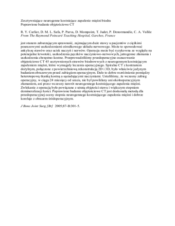 Zesztywniające neurogenne kostniejące zapalenie mięśni biodra Poprawione badanie objętościowe CT R. Y. Carlier, D. M. L. Safa, P. Parva, D. Mompoint, T. Judet, P. Denormandie, C. A. Vallée From The Raymond Poincaré Teaching Hospital, Garches, France jest stanem zaburzającym sprawność, zajmującym duże stawy u pacjentów z ciężkimi pourazowymi uszkodzeniami ośrodkowego układu nerwowego. Może to spowodować ankylozę stawów oraz ucisk naczyń i nerwów. Operacja może być ryzykowna ze względu na potencjalne krwotoki, uszkodzenia pęczków naczyniowo-nerwowych, jatrogenne złamania i uszkodzenia chrzęstno-kostne. Przeprowadziliśmy przedoperacyjne oszacowanie objętościowe CT 45 usztywnionych strawów biodrowwych z neurogennym kostniejącym zapaleniem mięśni, które wymagały leczenia operacyjnego. Spiralne CT z kontrastem dożylnym, połączone z powierzchniową rekonstrukcją 2D i 3D, było właściwie jedynym badaniem obrazowym przed zabiegiem operacyjnym. Dało to dobre rozróżnienie pomiędzy heterotopową tkanką kostną a sąsiadującymi naczyniami. Ustaliliśmy, że wczesny zabieg operacyjny, w ciągu 24 miesięcy od urazu, nie był powikłany ani okołooperacyjnym złamaniem, ani przez wczesny nawrót neurogennego kostniejącego zapalenia mięśni. Zwlekanie z operacją było powiązane z utratą objętości stawu i większym stopniem demineralizacji kości. Poprawione badanie objętościowe CT jest doskonałą metodą dla przedoperacyjnej oceny stopnia neurogennego kostniejącego zapalenia mięśni i dobrze koreluje z obrazem śródoperacyjnym. J Bone Joint Surg [Br] 2005;87-B:301-5.