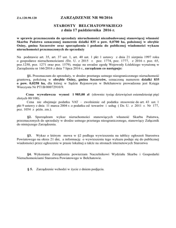ZA.120.90.120 ZARZĄDZENIE NR 90/2016 STAROSTY BEŁCHATOWSKIEGO z dnia 17 października 2016 r. w sprawie przeznaczenia do sprzedaży nieruchomości niezabudowanej stanowiącej własność Skarbu Państwa oznaczonej numerem działki 835 o pow. 0,0700 ha, położonej w obrębie Osiny, gmina Szczerców oraz sporządzenia i podania do publicznej wiadomości wykazu nieruchomości przeznaczonych do sprzedaży Na podstawie art. 35, art. 37 ust. 1, art. 40 ust. 1 pkt 1 ustawy z dnia 21 sierpnia 1997 roku o gospodarce nieruchomościami (Dz. U. z 2015 r. poz. 1774, poz. 1777, z 2016 r. poz. 65, poz.1250, poz. 1271 oraz poz. 1579), mając na uwadze zgodę Wojewody Łódzkiego wyrażoną w Zarządzeniu nr 166/2016 z dnia 7 lipca 2016 r., zarządzam co następuje: §1. Przeznaczam do sprzedaży, w drodze przetargu ustnego nieograniczonego nieruchomość gruntową, położoną w obrębie Osiny, gmina Szczerców, oznaczoną numerem działki 835 o pow. 0,0258 ha, dla której w Sądzie Rejonowym w Bełchatowie prowadzona jest Księga Wieczysta Nr PT1B/00072910/9. Cena wywoławcza wynosi 1 985,00 zł (słownie: tysiąc dziewięćset osiemdziesiąt pięć złotych 00/100). Cena nie obejmuje podatku VAT – zwolnienie od podatku stosownie do art. 43 ust. 1 pkt 9 ustawy z dnia 11 marca 2004 r. o podatku od towarów i usług ( Dz. U. z 2011 r. Nr 177, poz. 1054 z późn. zm.). §2. Sporządzam wykaz nieruchomości stanowiących własność Skarbu Państwa, przeznaczonych do sprzedaży w drodze ustnego przetargu nieograniczonego, stanowiący Załącznik do niniejszego Zarządzenia. §3. Wykaz o którym mowa w §2 podlega wywieszeniu na tablicy ogłoszeń Starostwa Powiatowego na okres 21 dni, a informację o wywieszeniu tego wykazu podaje się do publicznej wiadomości przez ogłoszenie w prasie lokalnej a także na stronach internetowych Starostwa §4. Wykonanie Zarządzenia powierzam Naczelnikowi Wydziału Skarbu i Gospodarki Nieruchomościami Starostwa Powiatowego w Bełchatowie. § 5. Zarządzenie wchodzi w życie z dniem podjęcia.