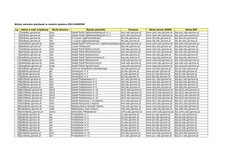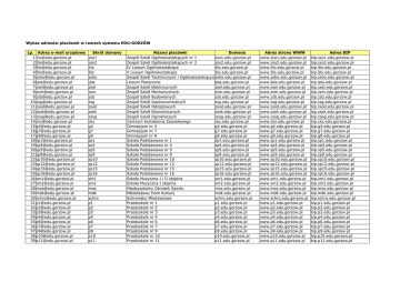 Wykaz adresów placówek w ramach systemu EDU-GORZÓW Lp. Adres e-mail urzędowy 1 [email protected] 2 [email protected] 3 [email protected] 4 [email protected] 5 [email protected] 6 [email protected] 7 [email protected] 8 [email protected] 9 [email protected] 10 [email protected] 11 [email protected] 12 [email protected] 13 [email protected] 14 [email protected] 15 [email protected] 16 [email protected] 17 [email protected] 18 [email protected] 19 [email protected] 20 [email protected] 21 [email protected] 22 [email protected] 23 [email protected] 24 [email protected] 25 [email protected] 26 [email protected] 27 [email protected] 28 [email protected] 29 [email protected] 30 [email protected] 31 [email protected] 32 [email protected] 33 [email protected] 34 [email protected] 35 [email protected] 36 [email protected] 37 [email protected] 38 [email protected] 39 [email protected] Skrót domeny zso1 zso2 4lo 5lo zstio lpla zsel zsm zsb zsg zsod zsek zsog ckz g4 g7 g9 sp1 sp4 sp5 sp9 sp10 sp12 sp15 sp16 sm1 sm2 mos mdk schro p1 p2 p3 p4 p6 p7 p9 p10 p11 Nazwa placówki Domena Zespół Szkół Ogólnokształcących nr 1 zso1.edu.gorzow.pl Zespół Szkół Ogólnokształcących nr 2 zso2.edu.gorzow.pl IV Liceum Ogólnokształcące 4lo.edu.gorzow.pl V Liceum Ogólnokształcące 5lo.edu.gorzow.pl Zespół Szkół Technicznych i Ogólnokształcącychzstio.edu.gorzow.pl Liceum Plastyczne lpla.edu.gorzow.pl Zespół Szkół Elektrycznych zsel.edu.gorzow.pl Zespół Szkół Mechanicznych zsm.edu.gorzow.pl Zespół Szkół Budowlanych zsb.edu.gorzow.pl Zespół Szkół Gastronomicznych zsg.edu.gorzow.pl Zespół Szkół Odzieżowych zsod.edu.gorzow.pl Zespół Szkół Ekonomicznych zsek.edu.gorzow.pl Zespół Szkół Ogrodniczych zsog.edu.gorzow.pl ckz.edu.gorzow.pl Centrum Kształcenia Zawodowego Gimnazjum nr 4 g4.edu.gorzow.pl Gimnazjum nr 7 g7.edu.gorzow.pl Gimnazjum nr 9 g9.edu.gorzow.pl Szkoła Podstawowa nr 1 sp1.edu.gorzow.pl Szkoła Podstawowa nr 4 sp4.edu.gorzow.pl Szkoła Podstawowa nr 5 sp5.edu.gorzow.pl Szkoła Podstawowa nr 9 sp9.edu.gorzow.pl Szkoła Podstawowa nr 10 sp10.edu.gorzow.pl Szkoła Podstawowa nr 12 sp12.edu.gorzow.pl Szkoła Podstawowa nr 15 sp15.edu.gorzow.pl Szkoła Podstawowa nr 16 sp16.edu.gorzow.pl Szkoła Muzyczna I i II stopnia sm1.edu.gorzow.pl Szkoła Muzyczna I stopnia sm2.edu.gorzow.pl Międzyszkolny Ośrodek Sportu mos.edu.gorzow.pl Młodzieżowy Dom Kultury mdk.edu.gorzow.pl Schronisko Młodzieżowe schro.edu.gorzow.pl Przedszkole nr 1 p1.edu.gorzow.pl Przedszkole nr 2 p2.edu.gorzow.pl Przedszkole nr 3 p3.edu.gorzow.pl Przedszkole nr 4 p4.edu.gorzow.pl Przedszkole nr 6 p6.edu.gorzow.pl Przedszkole nr 7 p7.edu.gorzow.pl Przedszkole nr 9 p9.edu.gorzow.pl Przedszkole nr 10 p10.edu.gorzow.pl Przedszkole nr 11 p11.edu.gorzow.pl Adres strony WWW www.zso1.edu.gorzow.pl www.zso2.edu.gorzow.pl www.4lo.edu.gorzow.pl www.5lo.edu.gorzow.pl www.zstio.edu.gorzow.pl www.lpla.edu.gorzow.pl www.zsel.edu.gorzow.pl www.zsm.edu.gorzow.pl www.zsb.edu.gorzow.pl www.zsg.edu.gorzow.pl www.zsod.edu.gorzow.pl www.zsek.edu.gorzow.pl www.zsog.edu.gorzow.pl www.ckz.edu.gorzow.pl www.g4.edu.gorzow.pl www.g7.edu.gorzow.pl www.g9.edu.gorzow.pl www.sp1.edu.gorzow.pl www.sp4.edu.gorzow.pl www.sp5.edu.gorzow.pl www.sp9.edu.gorzow.pl www.sp10.edu.gorzow.pl www.sp12.edu.gorzow.pl www.sp15.edu.gorzow.pl www.sp16.edu.gorzow.pl www.sm1.edu.gorzow.pl www.sm2.edu.gorzow.pl www.mos.edu.gorzow.pl www.mdk.edu.gorzow.pl www.schro.edu.gorzow.pl www.p1.edu.gorzow.pl www.p2.edu.gorzow.pl www.p3.edu.gorzow.pl www.p4.edu.gorzow.pl www.p6.edu.gorzow.pl www.p7.edu.gorzow.pl www.p9.edu.gorzow.pl www.p10.edu.gorzow.pl www.p11.edu.gorzow.pl Adres BIP bip.zso1.edu.gorzow.pl bip.zso2.edu.gorzow.pl bip.4lo.edu.gorzow.pl bip.5lo.edu.gorzow.pl bip.zstio.edu.gorzow.pl bip.lpla.edu.gorzow.pl bip.zsel.edu.gorzow.pl bip.zsm.edu.gorzow.pl bip.zsb.edu.gorzow.pl bip.zsg.edu.gorzow.pl bip.zsod.edu.gorzow.pl bip.zsek.edu.gorzow.pl bip.zsog.edu.gorzow.pl bip.ckz.edu.gorzow.pl bip.g4.edu.gorzow.pl bip.g7.edu.gorzow.pl bip.g9.edu.gorzow.pl bip.sp1.edu.gorzow.pl bip.sp4.edu.gorzow.pl bip.sp5.edu.gorzow.pl bip.sp9.edu.gorzow.pl bip.sp10.edu.gorzow.pl bip.sp12.edu.gorzow.pl bip.sp15.edu.gorzow.pl bip.sp16.edu.gorzow.pl bip.sm1.edu.gorzow.pl bip.sm2.edu.gorzow.pl bip.mos.edu.gorzow.pl bip.mdk.edu.gorzow.pl bip.schro.edu.gorzow.pl bip.p1.edu.gorzow.pl bip.p2.edu.gorzow.pl bip.p3.edu.gorzow.pl bip.p4.edu.gorzow.pl bip.p6.edu.gorzow.pl bip.p7.edu.gorzow.pl bip.p9.edu.gorzow.pl bip.p10.edu.gorzow.pl bip.p11.edu.gorzow.pl 40 [email protected] 41 [email protected] 42 [email protected] 43 [email protected] 44 [email protected] 45 [email protected] 46 [email protected] 47 [email protected] 48 [email protected] 49 [email protected] 50 [email protected] 51 [email protected] 52 [email protected] 53 [email protected] 54 [email protected] 55 [email protected] 56 [email protected] 57 [email protected] 58 [email protected] 59 [email protected] 60 [email protected] 61 [email protected] 62 [email protected] 63 [email protected] 64 [email protected] 65 [email protected] 66 [email protected] 67 [email protected] 68 [email protected] 69 [email protected] p12 p13 p14 p15 p16 p18 p19 p20 p21 p22 p23 p25 p27 p29 p30 p31 p32 p33 zpp po zks zs12 zs13 zs20 zs21 zs6 zso16 zso3 zss14 zsspo Przedszkole nr 12 p12.edu.gorzow.pl Przedszkole nr 13 p13.edu.gorzow.pl Przedszkole nr 14 p14.edu.gorzow.pl Przedszkole nr 15 p15.edu.gorzow.pl Przedszkole nr 16 p16.edu.gorzow.pl Przedszkole nr 18 p18.edu.gorzow.pl Przedszkole nr 19 p19.edu.gorzow.pl Przedszkole nr 20 p20.edu.gorzow.pl Przedszkole nr 21 p21.edu.gorzow.pl Przedszkole nr 22 p22.edu.gorzow.pl Przedszkole nr 23 p23.edu.gorzow.pl Przedszkole nr 25 p25.edu.gorzow.pl Przedszkole nr 27 p27.edu.gorzow.pl Przedszkole nr 29 p29.edu.gorzow.pl Przedszkole nr 30 p30.edu.gorzow.pl Przedszkole nr 31 p31.edu.gorzow.pl Przedszkole nr 32 p32.edu.gorzow.pl Przedszkole nr 33 p33.edu.gorzow.pl Zespół Poradni Psychologiczno-Pedagogi