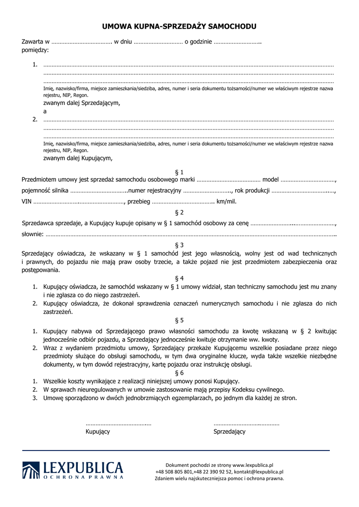 UMOWA KUPNA-SPRZEDAŻY SAMOCHODU Zawarta w ………………………………. w dniu ………………………… o godzinie ……………………….. pomiędzy: 1. …………………………………………………………………………………………………………………………………………………………… …………………………………………………………………………………………………………………………………………………………… …………………………………………………………………………………………………………………………………………………………… Imię, nazwisko/firma, miejsce zamieszkania/siedziba, adres, numer i seria dokumentu tożsamości/numer we właściwym rejestrze nazwa rejestru, NIP, Regon. zwanym dalej Sprzedającym, a 2. …………………………………………………………………………………………………………………………………………………………… …………………………………………………………………………………………………………………………………………………………… …………………………………………………………………………………………………………………………………………………………… Imię, nazwisko/firma, miejsce zamieszkania/siedziba, adres, numer i seria dokumentu tożsamości/numer we właściwym rejestrze nazwa rejestru, NIP, Regon. zwanym dalej Kupującym, §1 Przedmiotem umowy jest sprzedaż samochodu osobowego marki ………………………………… model ……………………………, pojemność silnika ……………………………..numer rejestracyjny ……………………….., rok produkcji ……………………………..…, VIN ……………………….………………………, przebieg ……………………………….. km/mil. §2 Sprzedawca sprzedaje, a Kupujący kupuje opisany w § 1 samochód osobowy za cenę ……………………...……………………, słownie: …………………………………………………….…………………………………………………………………………………………………….. §3 Sprzedający oświadcza, że wskazany w § 1 samochód jest jego własnością, wolny jest od wad technicznych i prawnych, do pojazdu nie mają praw osoby trzecie, a także pojazd nie jest przedmiotem zabezpieczenia oraz postępowania. §4 1. Kupujący oświadcza, że samochód wskazany w § 1 umowy widział, stan techniczny samochodu jest mu znany i nie zgłasza co do niego zastrzeżeń. 2. Kupujący oświadcza, że dokonał sprawdzenia oznaczeń numerycznych samochodu i nie zgłasza do nich zastrzeżeń. §5 1. Kupujący nabywa od Sprzedającego prawo własności samochodu za kwotę wskazaną w § 2 kwitując jednocześnie odbiór pojazdu, a Sprzedający jednocześnie kwituje otrzymanie ww. kwoty. 2. Wraz z wydaniem przedmiotu umowy, Sprzedający przekaże Kupującemu wszelkie posiadane przez niego przedmioty służące do obsługi samochodu, w tym dwa oryginalne klucze, wyda także wszelkie niezbędne dokumenty, w tym dowód rejestracyjny, kartę pojazdu oraz instrukcję obsługi. §6 1. Wszelkie koszty wynikające z realizacji niniejszej umowy ponosi Kupujący. 2. W sprawach nieuregulowanych w umowie zastosowanie mają przepisy Kodeksu cywilnego. 3. Umowę sporządzono w dwóch jednobrzmiących egzemplarzach, po jednym dla każdej ze stron. ……………………………….… Kupujący ……………………….………… Sprzedający Dokument pochodzi ze strony www.lexpublica.pl +48 508 805 801,+48 22 390 92 52, [email protected] Zdaniem wielu najskuteczniejsza pomoc i ochrona prawna.