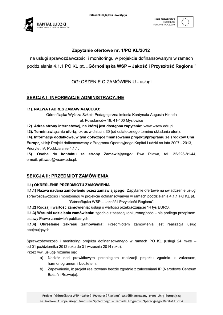 Człowiek-najlepsza inwestycja Zapytanie ofertowe nr. 1/PO KL/2012 na usługi sprawozdawczości i monitoringu w projekcie dofinansowanym w ramach poddziałania 4.1.1 PO KL pt. „Górnośląska WSP – Jakość i Przyszłość Regionu” OGŁOSZENIE O ZAMÓWIENIU - usługi . SEKCJA I: INFORMACJE ADMINISTRACYJNE I.1). NAZWA I ADRES ZAMAWIAJĄCEGO: Górnośląska Wyższa Szkoła Pedagogiczna imienia Kardynała Augusta Hlonda ul. Powstańców 19, 41-400 Mysłowice I.2). Adres strony internetowej, na której jest dostępna zapytanie: www.wsew.edu.pl I.3). Termin związania ofertą: okres w dniach: 30 (od ostatecznego terminu składania ofert). I.4). Informacje dodatkowe, w tym dotyczące finansowania projektu/programu ze środków Unii Europejskiej: Projekt dofinansowany z Programu Operacyjnego Kapitał Ludzki na lata 2007 - 2013, Priorytet IV, Poddziałanie 4.1.1. I.5). Osoba do kontaktu ze strony Zamawiającego: Ewa Pilawa, tel. 32/223-81-44, e-mail: [email protected]. SEKCJA II: PRZEDMIOT ZAMÓWIENIA II.1) OKREŚLENIE PRZEDMIOTU ZAMÓWIENIA II.1.1) Nazwa nadana zamówieniu przez zamawiającego: Zapytanie ofertowe na świadczenie usługi sprawozdawczości i monitoringu w projekcie dofinansowanym w ramach poddziałania 4.1.1 PO KL pt. ”Górnośląska WSP – Jakość i Przyszłość Regionu”. II.1.2) Rodzaj i wartość zamówienia: usługi o wartości przekraczającej 14 tyś EURO. II.1.3) Warunki udzielenia zamówienia: zgodnie z zasadą konkurencyjności - nie podlega przepisom ustawy Prawo zamówień publicznych. II.1.4) Określenie zakresu zamówienia: Przedmiotem zamówienia jest realizacja usług obejmujących: Sprawozdawczość i monitoring projektu dofinansowanego w ramach PO KL (usługi 24 m-ce – od 01 października 2012 roku do 31 września 2014 roku). Przez ww. usługę rozumie się: a) Nadzór nad prawidłowym przebiegiem realizacji projektu zgodnie z zakresem, harmonogramem i budżetem. b) Zapewnienie, iż projekt realizowany będzie zgodnie z zaleceniami IP (Narodowe Centrum Badań i Rozwoju). Projekt ”Górnośląska WSP – Jakość i Przyszłość Regionu” współfinansowany przez Unię Europejską ze środków Europejskiego Funduszu Społecznego w ramach Programu Operacyjnego Kapitał Ludzki Człowiek-najlepsza inwestycja c) d) e) f) g) h) i) j) k) l) Wsparcie merytoryczne w zakresie procedur i prowadzenia dokumentacji formalnej. Świadczenie usług doradczych związanych z kontrolami projektu przez organy do tego uprawnione. Sporządzanie wniosków beneficjenta o płatność wraz z wymaganymi załącznikami, zgodnie z harmonogramem płatności, z uwzględnieniem ewentualnych korekt i autokorekt, aż do uzyskania końcowej akceptacji wniosku końcowego. Kontakty z Instytucją Pośredniczącą w zakresie analizy, modyfikacji i zatwierdzania Wniosków o płatność. Analiza ilościowa i jakościowa wydatków rozliczanych w ramach wniosku o płatność. Weryfikacja poprawności dokumentacji finansowej związanej z realizacją projektu. Aktualizacja harmonogramów płatności. Niezwłoczne informowanie zamawiającego o wszelkich odstępstwach od planowanych osiągnięć wskaźników monitorowanych w ramach procesu sprawozdawczości. Doradztwo w zakresie obowiązujących przepisów dotyczących kwalifikowalności wydatków. Monitoring produktów i wskaźników. Ponadto zobowiązuje się Wykonawcę do obecności w siedzibie Zamawiającego min. 2 razy w tygodniu na co najmniej 2h, uczestniczenia w kontrolach organów do tego uprawnionych oraz stawiania się na każde uzasadnione wezwanie Zamawiającego. Wykonawca wykonywać będzie usługi sprawozdawczości i monitoringu będące przedmiotem zamówienia zgodnie z obowiązującymi dokumentami w szczególności z : − Zasadami Finansowania Programu Operacyjnego Kapitał Ludzki 2007-2013. − Wytycznymi w zakresie kwalifikowalności wydatków w ramach Programu − Operacyjnego Kapitał Ludzki 2007-2013. Wzorami dokumentów: Wnioskiem o płatność wraz z załącznikami i Formularzem danych PEFS 2007. II.1.5) Czy przewiduje się udzielenie zamówień uzupełniających: nie. II.1.6) Czy przewiduje się udzielenie zaliczki: nie II.1.7) Wspólny Słownik Zamówień (CPV): 79400000-8. II.2) CZAS TRWANIA ZAMÓWIENIA LUB TERMIN WYKONANIA: Zakończenie: 30.09.2014 roku II.3) ZASADY SKŁADANIA OFERT II.3.1) Czy dopuszcza się złożenie oferty częściowej: nie. II.3.2) Czy dopuszcza się złożenie oferty wariantowej: nie. II.3.3) Na ofertę składają się następujące dokumenty: 1. Specyfikacja cenowa, której wzór stanowi Załącznik nr. 1 do niniejszego Zapytania ofertowego. 2. Kserokopie : a. odpowiedniego dokumentu rejestrowego oferenta (np. wypis z KRS, wypis z ewidencji działalności gospodarczej, w przypadku spółki cywilnej również umowa spółki), b. zaświadczenia o numerze identyfikacyjnym REGON, c. decyzji w sprawie nadania NIP. Projekt ”Górnośląska WSP – Jakość i Przyszłość Regionu” współfinansowany przez Unię Europejską ze środków Europejskiego Funduszu Społecznego w ramach Programu Operacyjnego Kapitał Ludzki Człowiek-najlepsza inwestycja 3. Formularz oświadczeń, którego wzór stanowi Załącznik nr. 2 do niniejszego Zapytania ofertowego. 4. Kserokopia lub oryginał pełnomocnictwa do reprezentacji oferenta w zakresie procesu oferowania – jeśli dotyczy. 5. Wykaz usług dotyczących realizacji procesu sprawozdawczości i monitoringu w ramach projektów współfinansowanych z Europejskiego Funduszu Społecznego, którego wzór stanowi Załącznik nr. 3 do niniejszego zapytania ofertowego. 6. Referencje od 3 różnych instytucji potwierdzające zrealizowanie z należytą starannością usługi sprawozdawczości i monitoringu w projektach realizowanych w ramach Programu Operacyjnego Kapitał Ludzki, przy czy czym wartość z jednego z tych projektów powinna wynosić min. 1.300.000,00 zł, a co najmniej jeden projekt powinien być zrealizowany w ramach poddziałania 4.1.1. 7. CV bizn