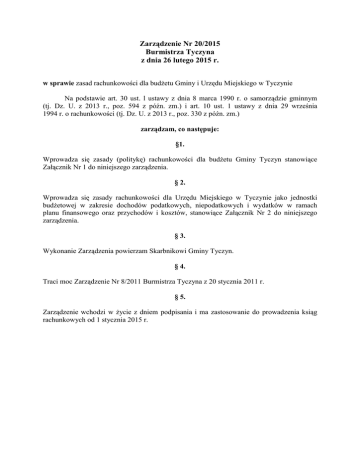 Zarządzenie Nr 20/2015 Burmistrza Tyczyna z dnia 26 lutego 2015 r. w sprawie zasad rachunkowości dla budżetu Gminy i Urzędu Miejskiego w Tyczynie Na podstawie art. 30 ust. l ustawy z dnia 8 marca 1990 r. o samorządzie gminnym (tj. Dz. U. z 2013 r., poz. 594 z późn. zm.) i art. 10 ust. 1 ustawy z dnia 29 września 1994 r. o rachunkowości (tj. Dz. U. z 2013 r., poz. 330 z późn. zm.) zarządzam, co następuje: §1. Wprowadza się zasady (politykę) rachunkowości dla budżetu Gminy Tyczyn stanowiące Załącznik Nr 1 do niniejszego zarządzenia. § 2. Wprowadza się zasady rachunkowości dla Urzędu Miejskiego w Tyczynie jako jednostki budżetowej w zakresie dochodów podatkowych, niepodatkowych i wydatków w ramach planu finansowego oraz przychodów i kosztów, stanowiące Załącznik Nr 2 do niniejszego zarządzenia. § 3. Wykonanie Zarządzenia powierzam Skarbnikowi Gminy Tyczyn. § 4. Traci moc Zarządzenie Nr 8/2011 Burmistrza Tyczyna z 20 stycznia 2011 r. § 5. Zarządzenie wchodzi w życie z dniem podpisania i ma zastosowanie do prowadzenia ksiąg rachunkowych od 1 stycznia 2015 r. Załącznik Nr 1 do Zarządzenia Nr 20/2015 Burmistrza Tyczyna z dnia 26 lutego 2015 r. Zasady prowadzenia ksiąg rachunkowych dla budżetu Gminy Tyczyn Rachunkowość budżetu służy głównie do ewidencji kasowego wykonania budżetu gmin czyli do rejestracji dochodów i wydatków. Zapisy w urządzeniach księgowych budżetu pozwalają ponadto na obserwację realizacji przychodów i rozchodów, stanu należności i zobowiązań budżetu, a także umożliwiają ustalenie wyniku z kasowego wykonania budżetu za dany rok, wyniku na operacjach niekasowych oraz stanu skumulowanej nadwyżki lub niedoboru na zasobach budżetu. § 1. Zasady ogólne 1. Gmina Tyczyn jako organ finansowy obowiązany jest stosować określone ustawą o rachunkowości oraz innymi obowiązującymi przepisami prawa zasady rachunkowości, przedstawiając rzetelnie i jasno sytuację majątkową i finansową oraz wynik finansowy. 2. Przyjęte zasady rachunkowości zostały ustalone z uwzględnieniem następujących przepisów prawnych: 1) Ustawy z dnia 29 września 1994 r. o rachunkowości (tj. Dz. U. z 2013 r., poz. 330 z późn. zm.); 2) Ustawy z dnia 27.08.2009 r. o finansach publicznych (tj. Dz. U. z 2013 r., poz. 885 z późn. zm.); 3) Rozporządzenia Ministra Finansów z dnia 5 lipca 2010 r. w sprawie szczególnych zasad rachunkowości oraz planów kont dla budżetu państwa, budżetów jednostek samorządu terytorialnego, jednostek budżetowych, samorządowych zakładów budżetowych, państwowych funduszy celowych oraz państwowych jednostek budżetowych mających siedzibę poza granicami Rzeczypospolitej Polskiej (tj. Dz. U. z 2013, poz. 289 ); 4) Rozporządzenia Ministra Finansów z dnia 03.02.2010 r. w sprawie sprawozdawczości budżetowej (Dz. U. Nr 20, poz. 103 z późn. zm.); 5) Rozporządzenie Ministra Finansów z 04.03.2010 r. w sprawie sprawozdań jednostek sektora finansów publicznych w zakresie operacji finansowych (Dz. U. Nr 43, poz. 247 z późn. zm.). 6) Rozporządzenia Ministra Finansów z dnia 7 grudnia 2010 r. w sprawie sposobu prowadzenia gospodarki finansowej jednostek budżetowych i samorządowych zakładów budżetowych (Dz. U. Nr 241, poz. 1616); 3. Zasady rachunkowości budżetu Gminy obejmują: 1) zasady gospodarki finansowej obowiązujące w toku wykonywania budżetu; 2) ogólne zasady prowadzenia ksiąg rachunkowych; 3) bilans i ustalenie wyniku z wykonania budżetu; 4) sprawozdawczość budżetu; 5) inwentaryzację; 6) wykaz programów komputerowych stosowanych w referacie budżetowym; 7) opis i sposób działania programów komputerowych wdrożonych w referacie budżetowym; 8) opis systemu przetwarzania danych; 9) opis systemu ochrony danych i ich zbiorów; 10) wykaz kont księgi głównej; 11) zasady funkcjonowania kont. 2 § 2. Zasady gospodarki finansowej obowiązujące w toku wykonywania budżetu 1. W toku wykonywania budżetu Gminy Tyczyn obowiązują następujące zasady gospodarki finansowej: 1) ustalanie, pobieranie i odprowadzanie dochodów budżetu miasta następuje na zasadach i w terminach wynikających z obowiązujących przepisów; 2) dokonywanie wydatków następuje w granicach kwot określonych w uchwale budżetowej oraz w planach finansowych jednostek organizacyjnych Gminy, z uwzględnieniem prawidłowo dokonanych przeniesień i zgodnie z planowanym przeznaczeniem, w sposób celowy i oszczędny, zgodnie z art. 44 ustawy o finansach publicznych; 3) zlecanie zadań powinno następować na zasadzie wyboru najkorzystniejszej oferty, z uwzględnieniem przepisów o zamówieniach publicznych, a w odniesieniu do organizacji pozarządowych, z odpowiednim zastosowaniem art. 221 Ustawy o finansach publicznych; 4) wydatki nieprzewidziane, których obowiązkowe płatności wynikają z tytułów wykonawczych, wyroków sądowych lub ugód, mogą być dokonywane bez względu na poziom środków finansowych przewidzianych na ten cel. Odpowiednia zmiana planu wydatków powinna nastąpić w trybie przeniesień wydatków z innych podziałek klasyfikacji wydatków lub z rezerw celowych (art. 256 ustawy o finansach publicznych); 5) przeniesienia wydatków w budżecie Gminy mogą być dokonywane na zasadach i w zakresie określonym w art. 257 Ustawy o finansach publicznych; 6) dotacje celowe przyznane dla Gminy Tyczyn na realizację zadań z zakresu administracji rządowej oraz innych zadań zleconych ustawami, nie wykorzystane w danym roku, podlegają zwrotowi do budżetu państwa w części w jakiej zadanie nie zostało wykonane. § 3. Ogólne zasady prowadzenia ksiąg rachunkowych 1. Księgi rachunkowe budżetu Gminy Tyczyn prowadzi się w referacie budżetowym w siedzibie Urzędu Miejskiego - Tyczyn, ul. Rynek 18. 2. Księgi rachunkowe prowadzi się przy użyciu komputera w języku polskim i w walucie polskiej. 3. Rokiem obrachunkowym jest okres roku budżetowego, czyli rok kalendarzowy od 1 st