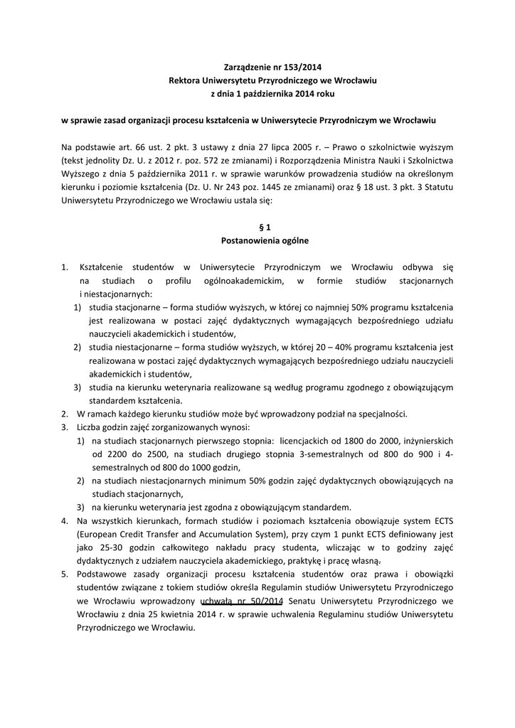Zarządzenie nr 153/2014 Rektora Uniwersytetu Przyrodniczego we